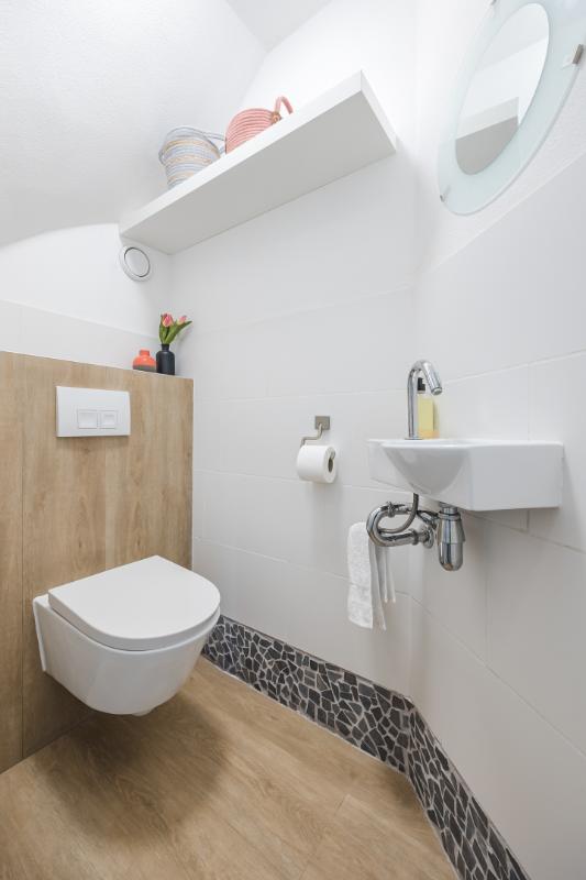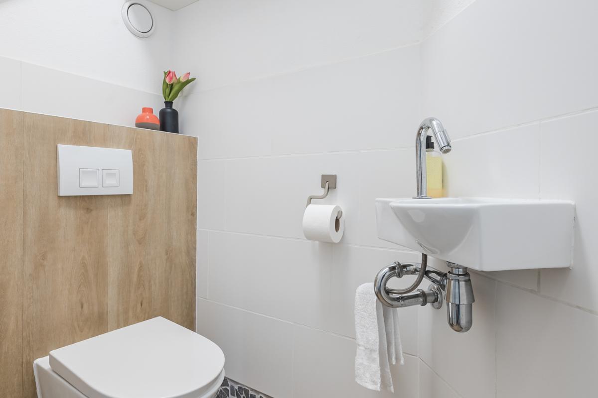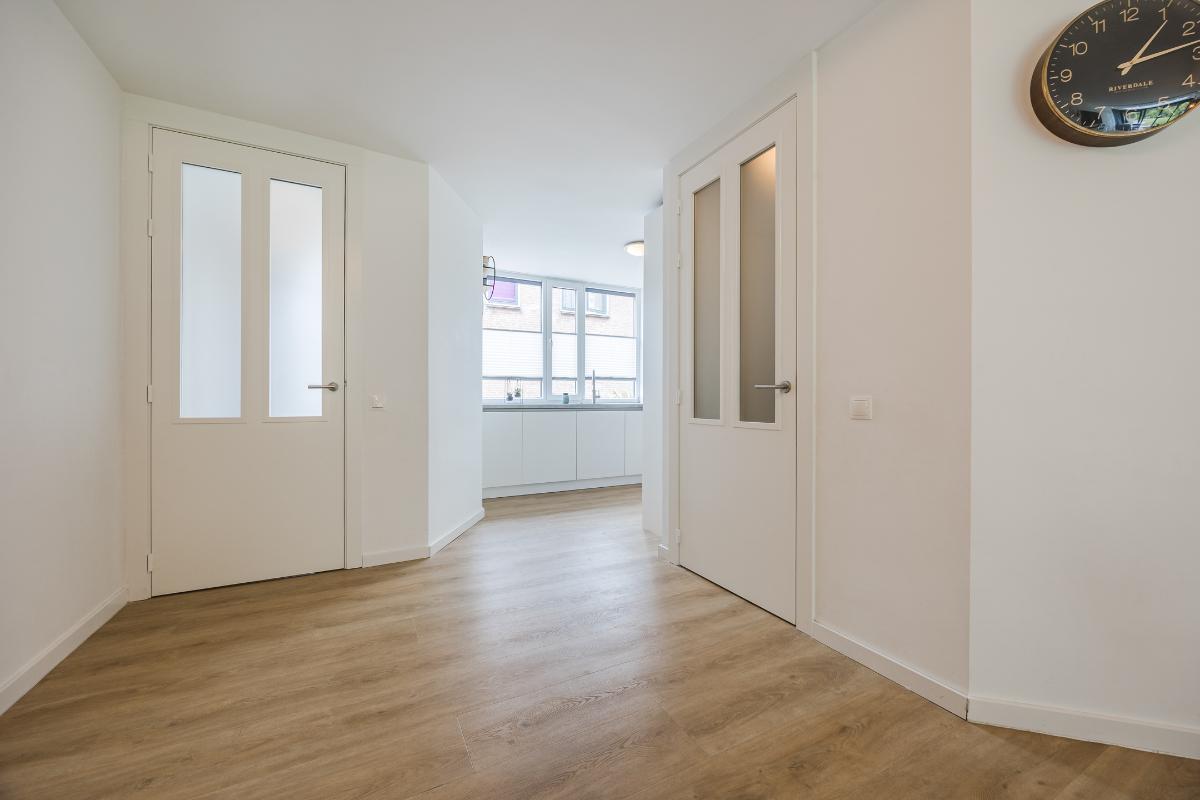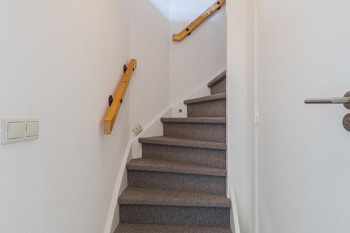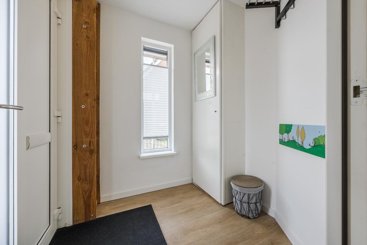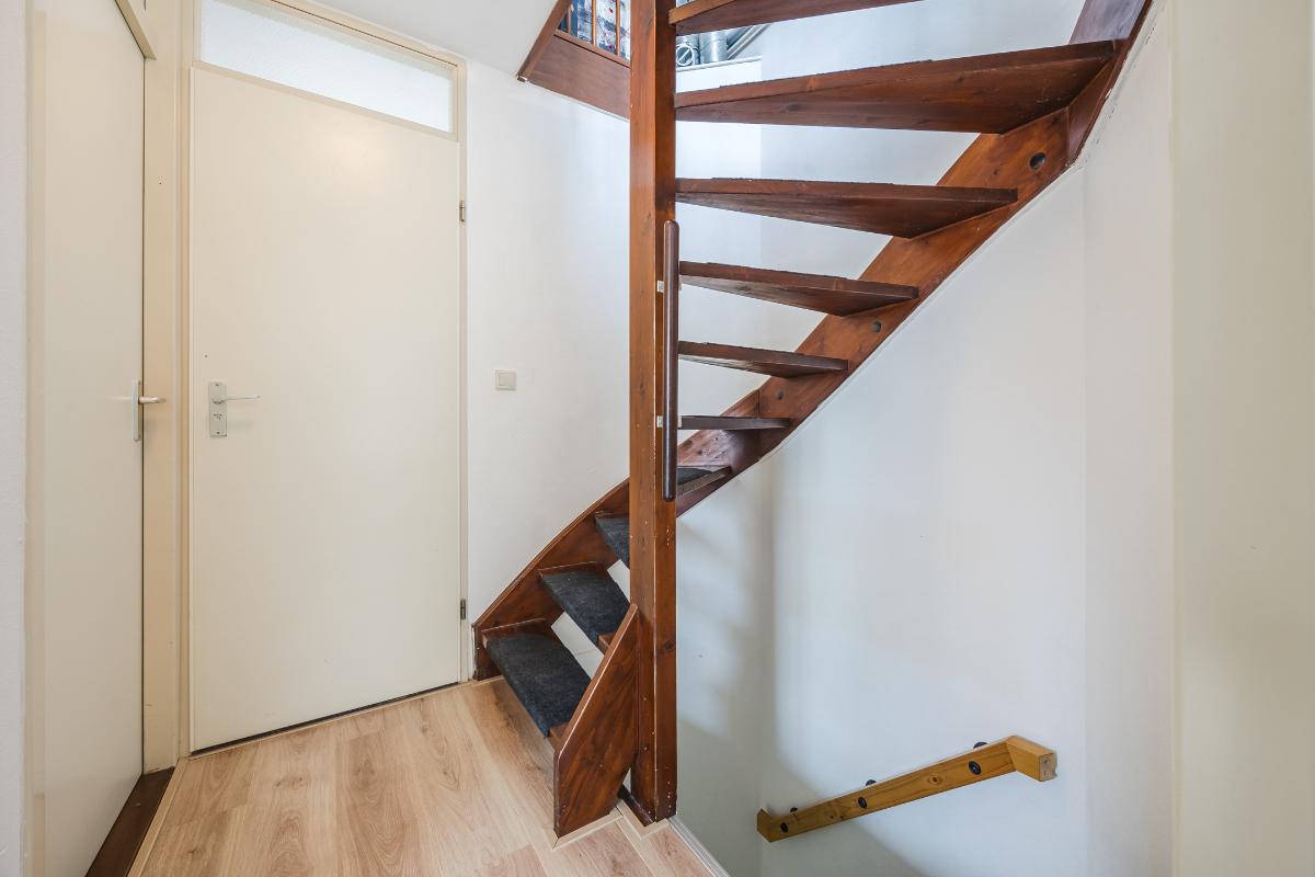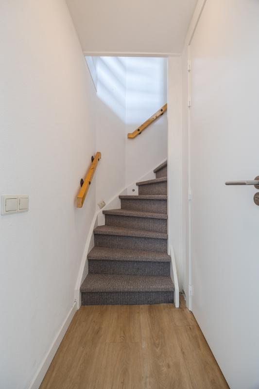 Verder vind je vanuit de woonkamer de hal met het toilet en de trapopgang naar de eerste verdieping.