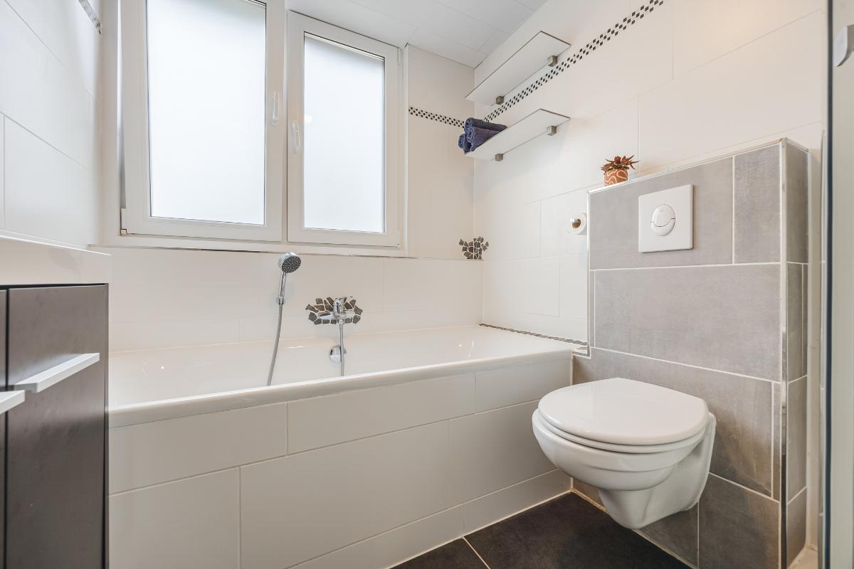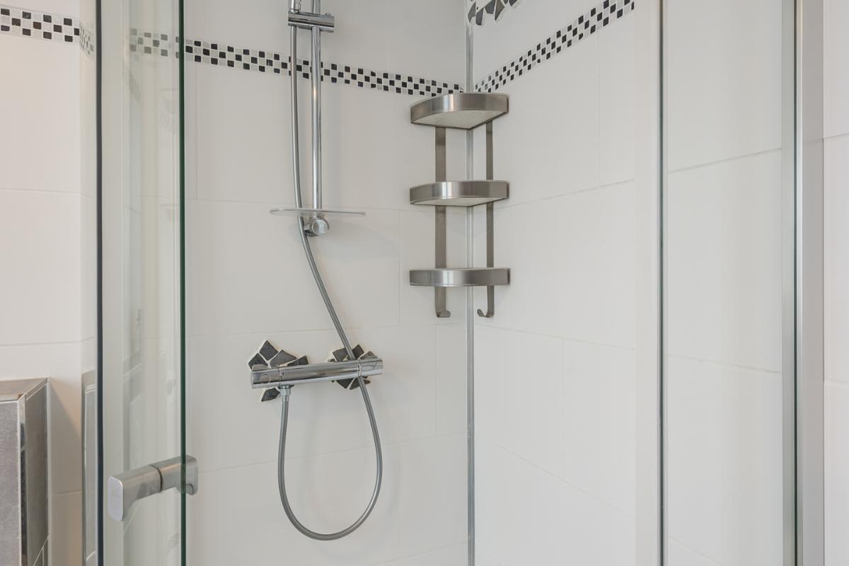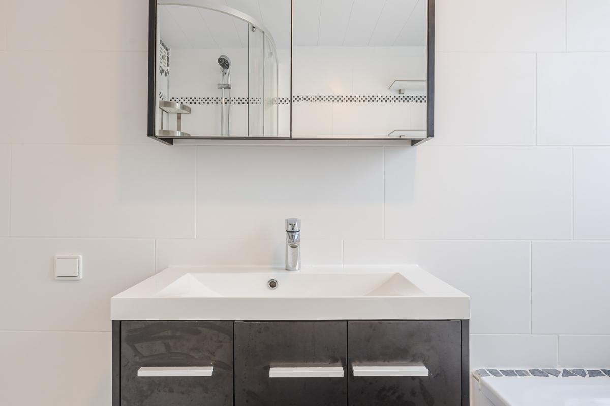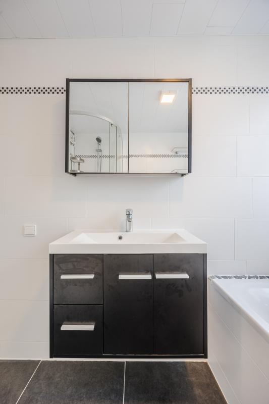 De badkamer is een heerlijke plek om te ontspannen, uitgerust met elektrische vloerverwarming, een ligbad, douchecabine, wastafelmeubel en toilet. Dankzij de dakkapel geniet je hier van extra veel ruimte en lichtinval. De dakkapel is bovendien uitgerust met een rolluik.