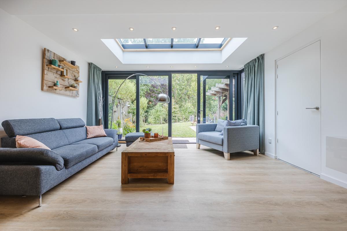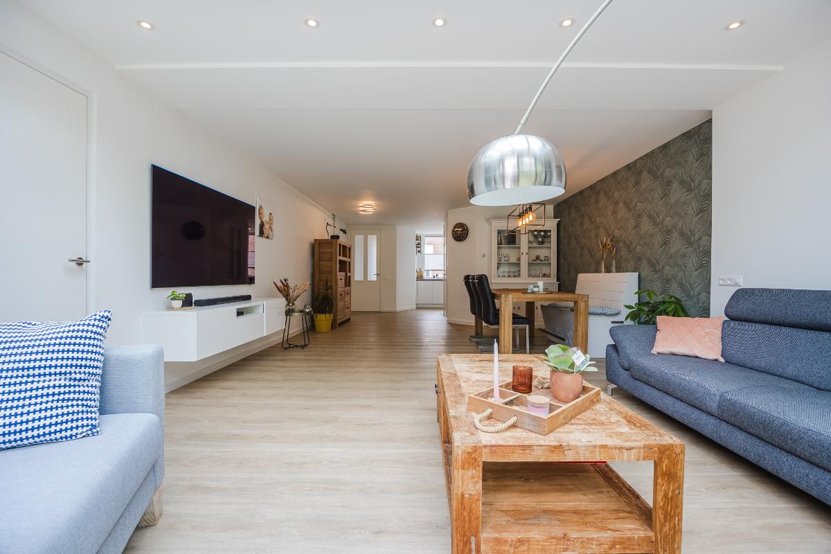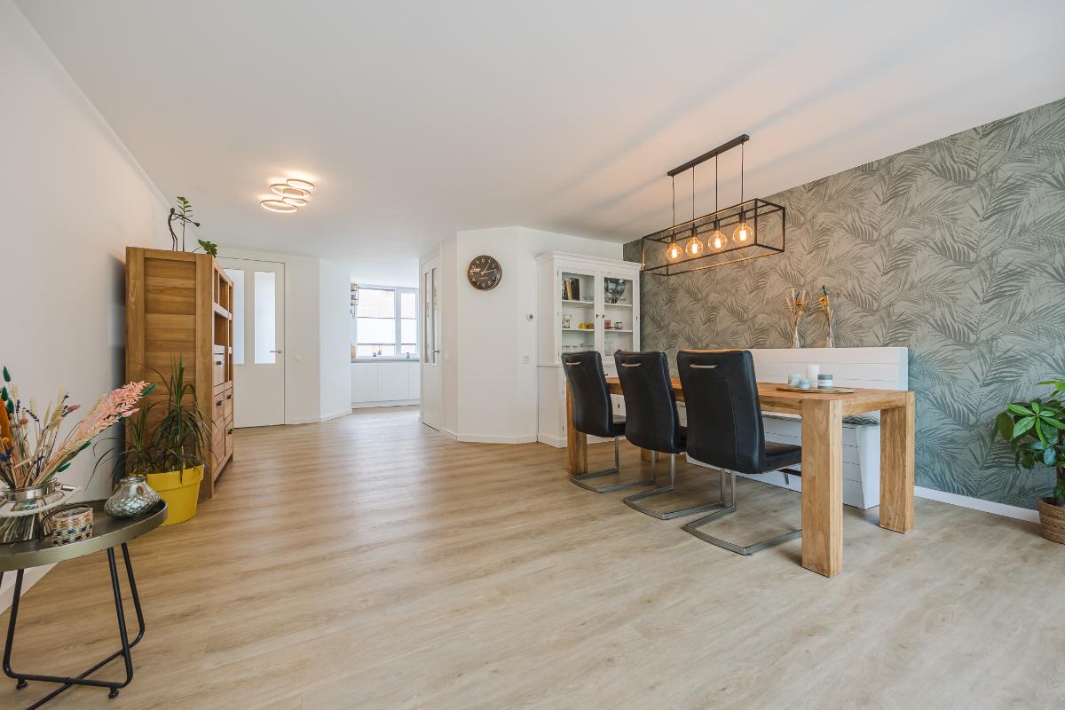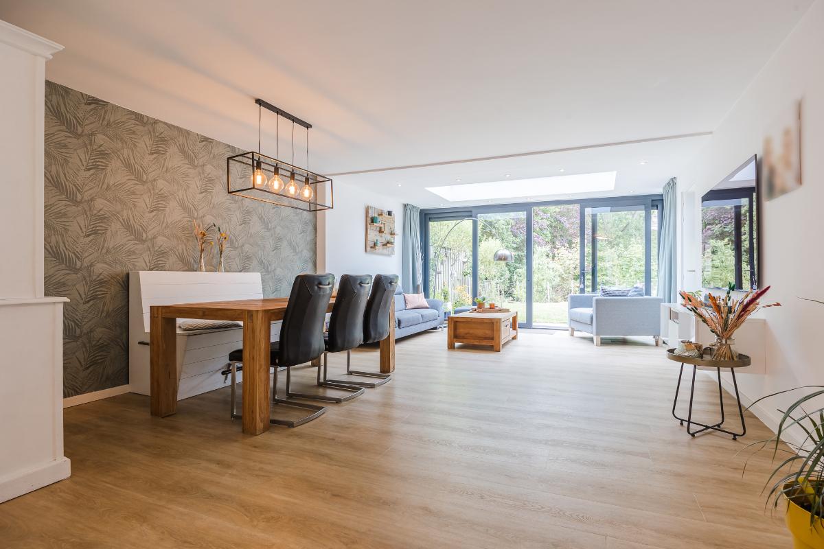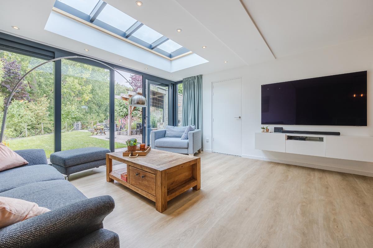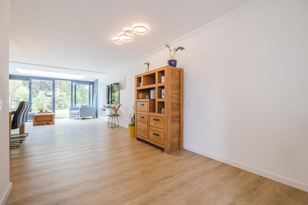 De woonkamer is royaal uitgebouwd en meteen valt je de hoeveelheid licht op. Dankzij de lichtstraat en de schuifpui stroomt er volop daglicht naar binnen. In de zomer blijft het binnen heerlijk koel door de warmtewerende folie op de lichtstraat en de screen tegen de achtergevel. In de winter zorgt de vloerverwarming juist voor een aangename temperatuur. De ruimte is strak afgewerkt en voorzien van een stijlvolle PVC-vloer, wat zorgt voor een moderne en onderhoudsvriendelijke uitstraling. De schuifpui in aluminium geeft direct toegang tot de achtertuin, ideaal om binnen en buiten met elkaar te verbinden. Er is genoeg plek voor zowel een gezellige zithoek als een grote eettafel, waardoor dit een fijne leefruimte is voor het hele gezin.