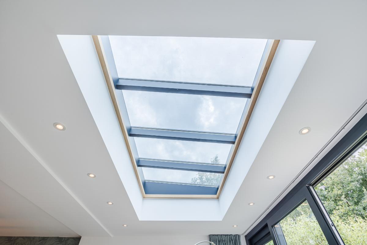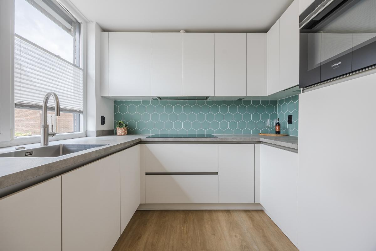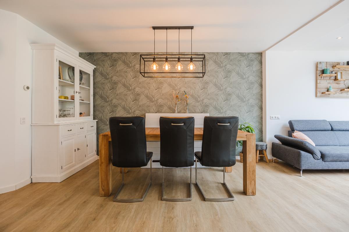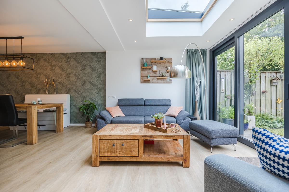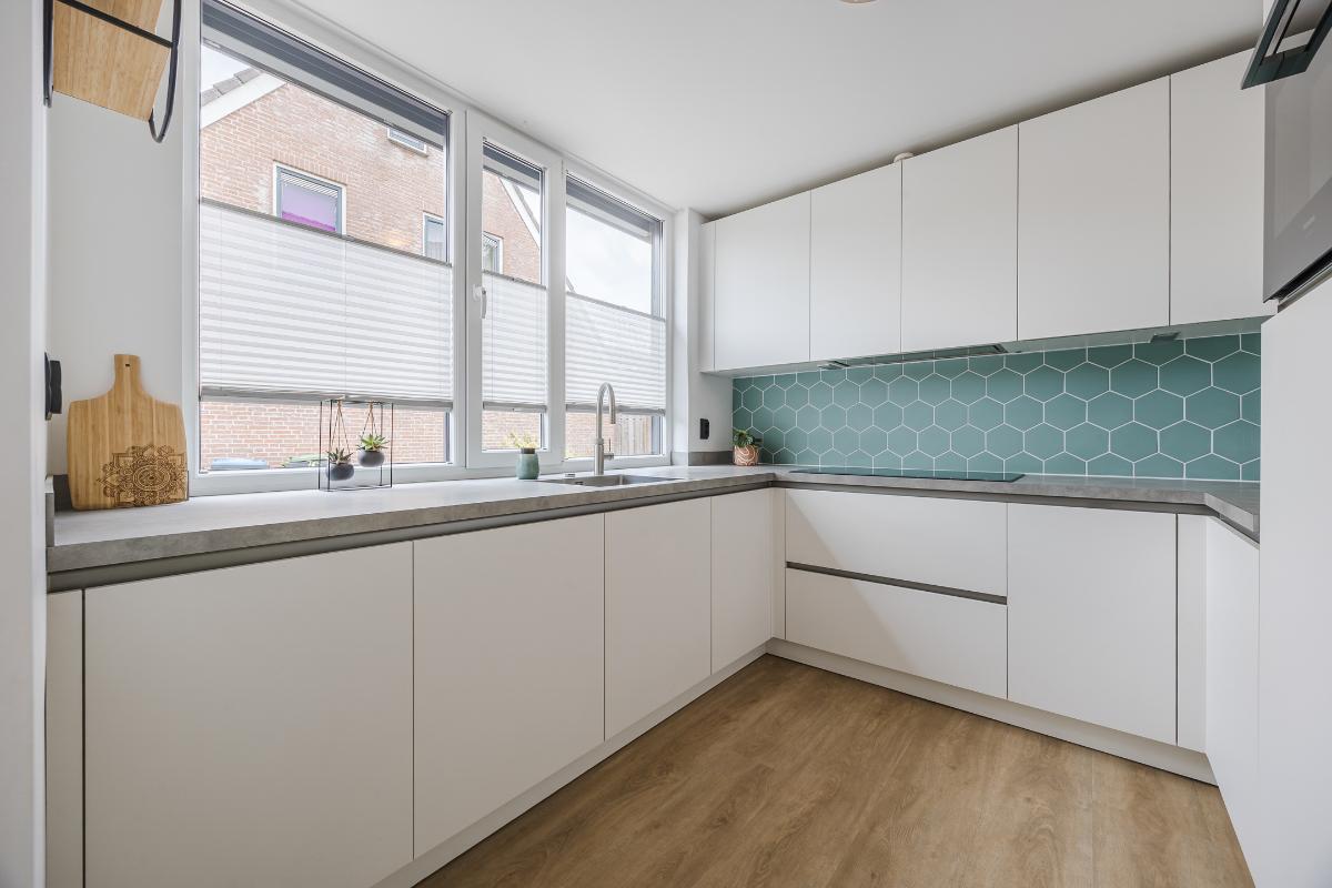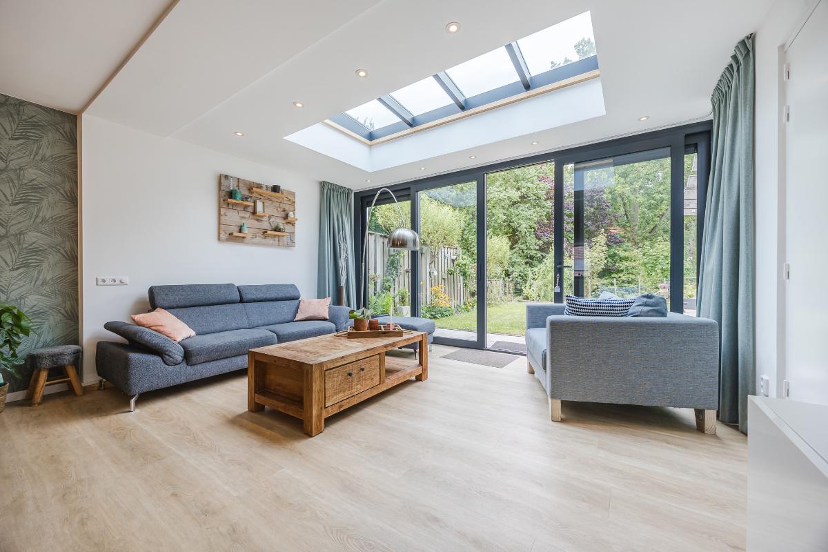 De woonkamer is royaal uitgebouwd en meteen valt je de hoeveelheid licht op. Dankzij de lichtstraat en de schuifpui stroomt er volop daglicht naar binnen. In de zomer blijft het binnen heerlijk koel door de warmtewerende folie op de lichtstraat en de screen tegen de achtergevel. In de winter zorgt de vloerverwarming juist voor een aangename temperatuur. De ruimte is strak afgewerkt en voorzien van een stijlvolle PVC-vloer, wat zorgt voor een moderne en onderhoudsvriendelijke uitstraling. De schuifpui in aluminium geeft direct toegang tot de achtertuin, ideaal om binnen en buiten met elkaar te verbinden. Er is genoeg plek voor zowel een gezellige zithoek als een grote eettafel, waardoor dit een fijne leefruimte is voor het hele gezin.