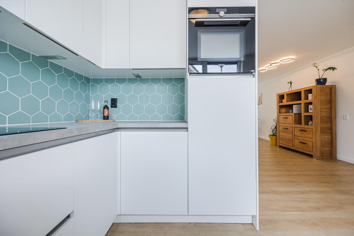Aan de voorzijde vind je de moderne open keuken. Terwijl je kookt, blijf je in contact met de woonkamer. De keuken is compleet uitgerust met een koelkast, combi-oven met magnetron, vaatwasser, inductiekookplaat met afzuigkap én een Quooker voor direct kokend water.