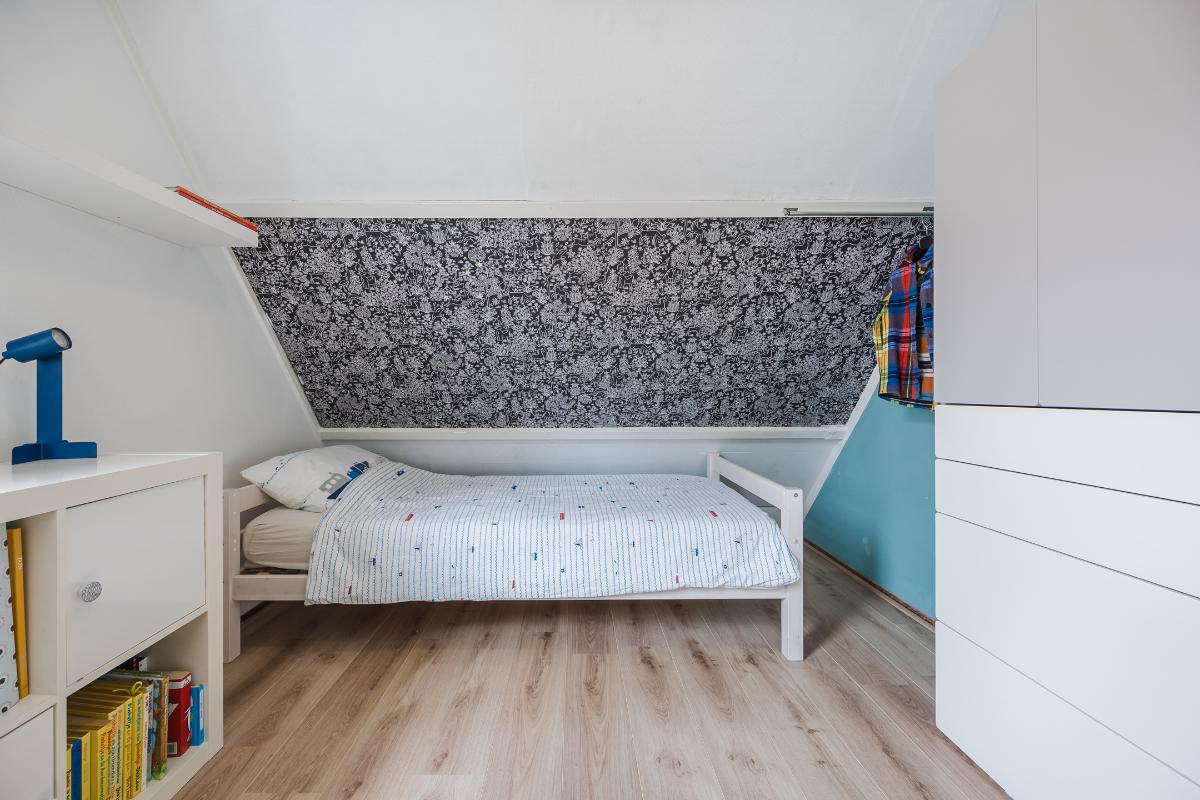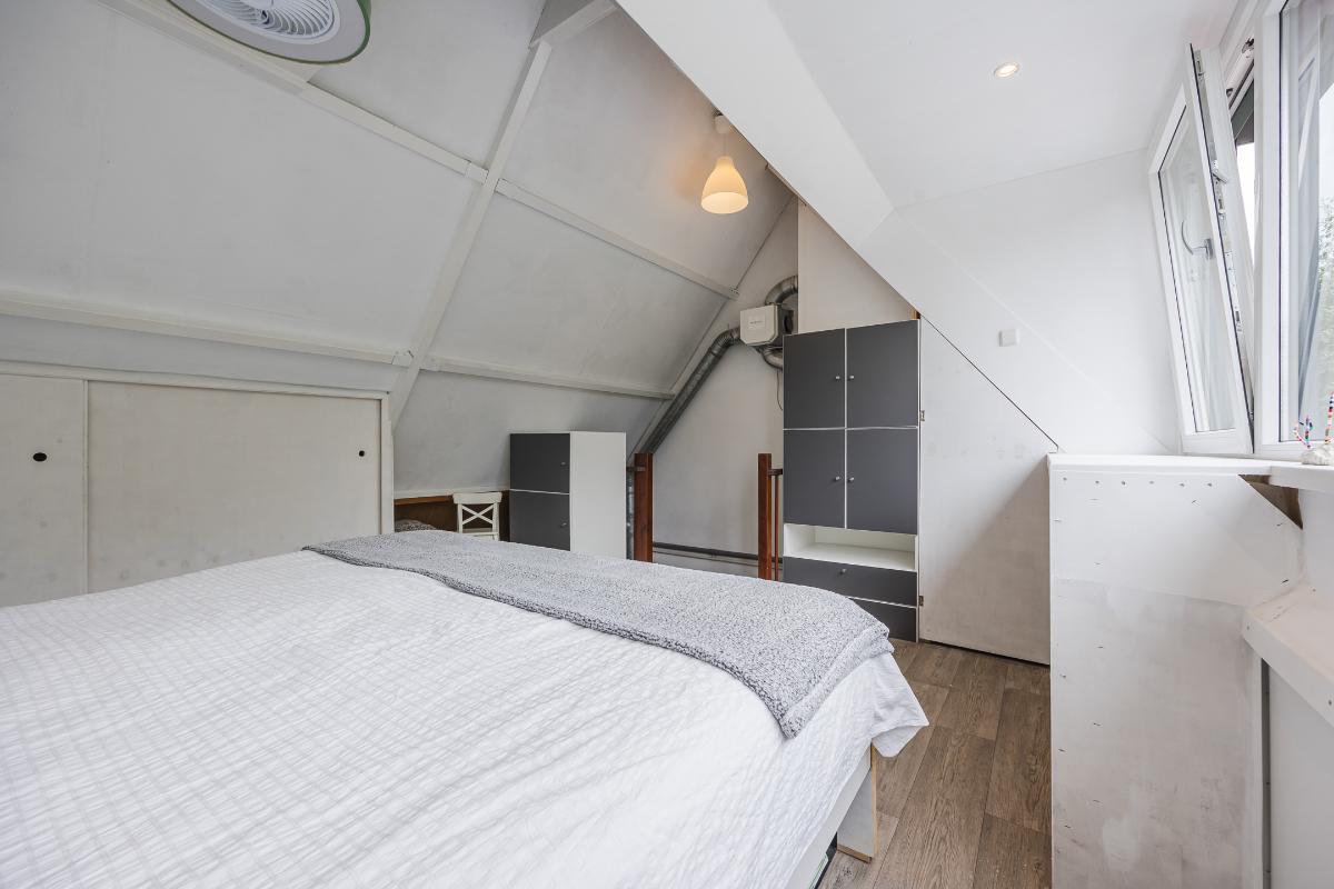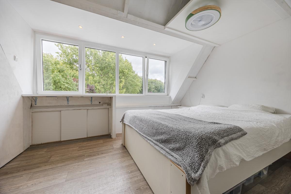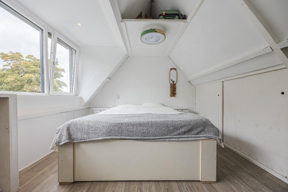 Tweede verdieping: De tweede verdieping is in 2024 flink vergroot dankzij een royale dakkapel van maar liefst 4 meter breed. Hierdoor is er een prachtige, ruime slaapkamer ontstaan die baadt in het daglicht en een schitterend uitzicht biedt over het water en het groen aan de achterzijde van de woning. Een heerlijke plek om tot rust te komen! De dakkapel is bovendien uitgerust met een rolluik.