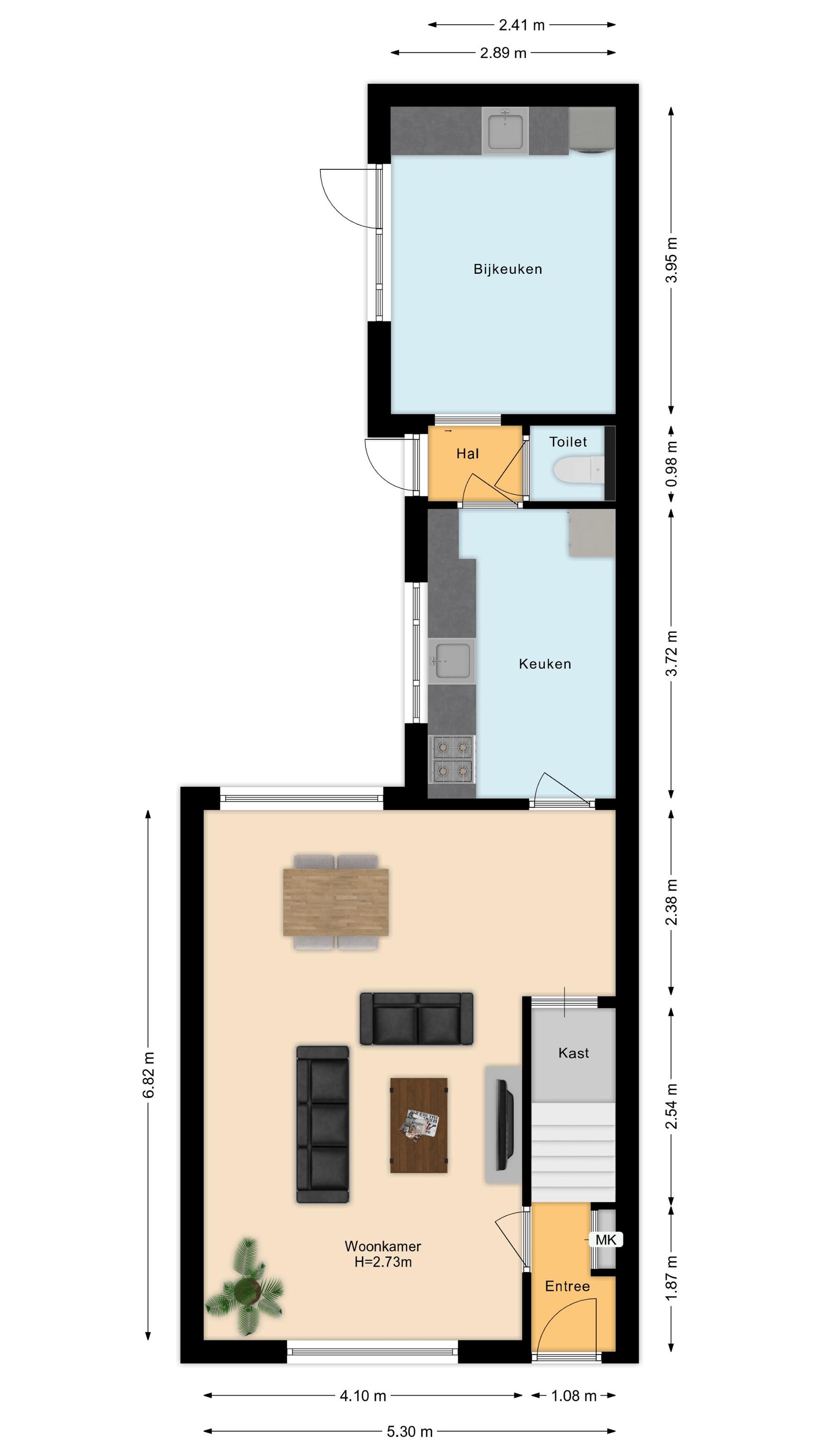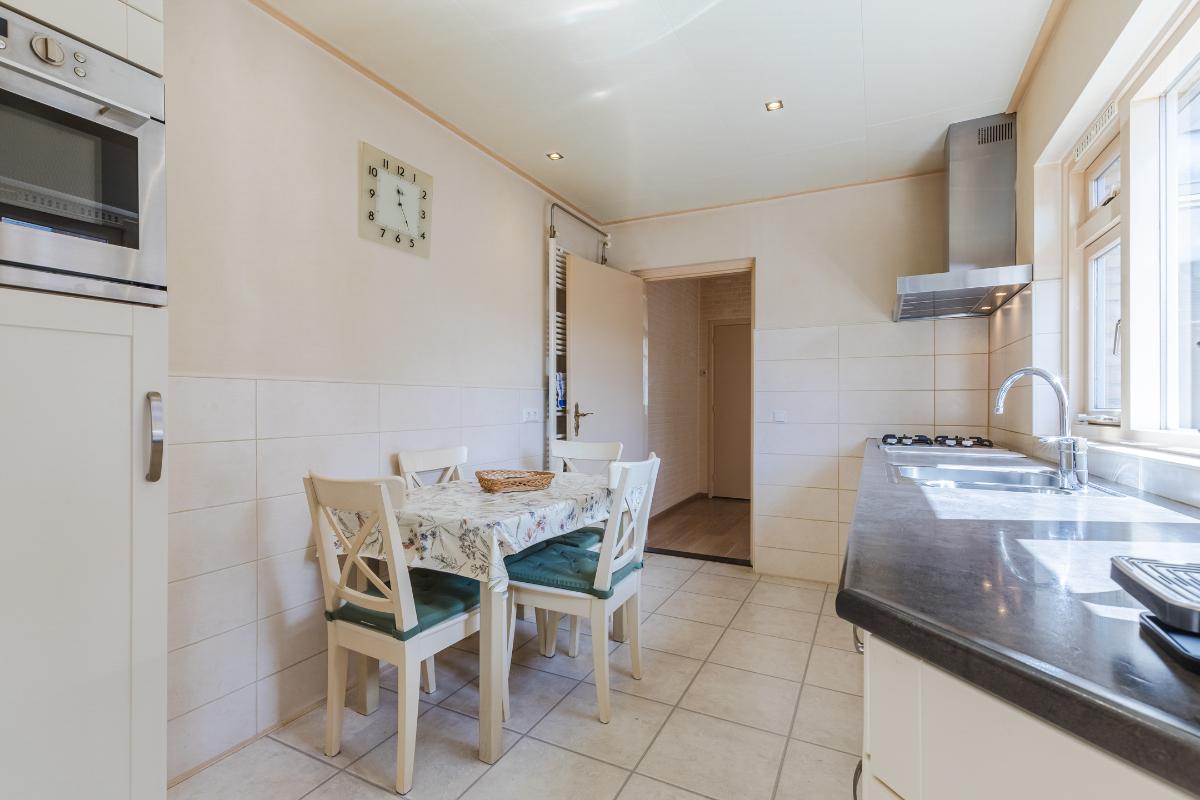 Aan de achterzijde ligt de keuken, volledig uitgerust met o.a. een 4-pits gaskookplaat, afzuigkap, combi-magnetron en koelkast. Vanuit hier loop je door naar de achterhal met toegang tot het toilet, de praktische bijkeuken én de achtertuin.
