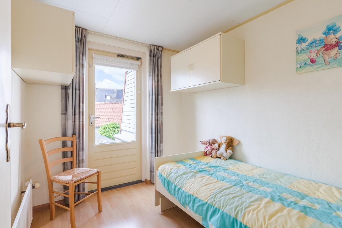 Slaapkamer 3 (achterzijde): Met laminaatvloer, spachtelputz wanden, Agnes plafondplaten en rolluik. Via de deur heb je bovendien toegang tot het platte dak van de aanbouw.