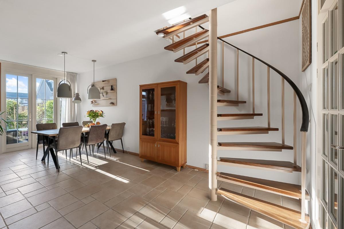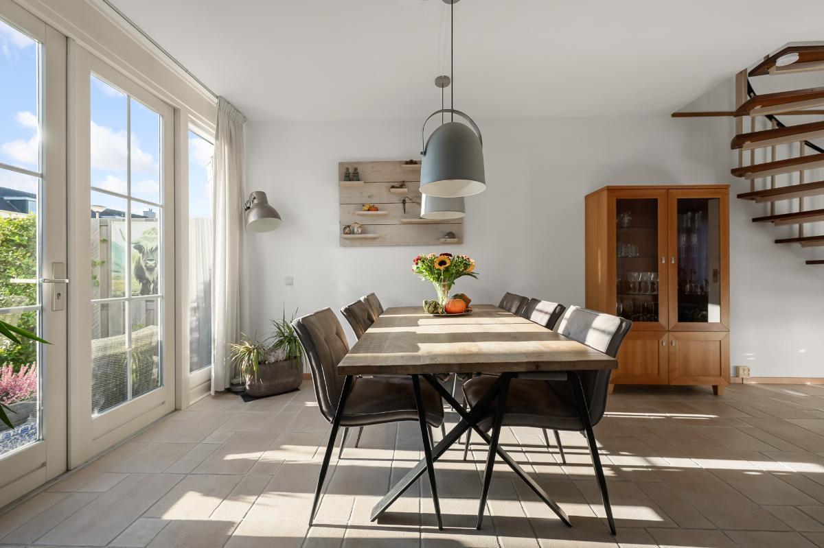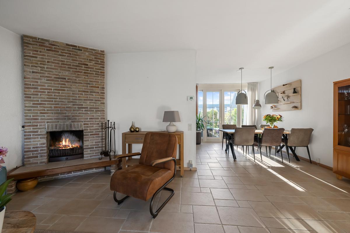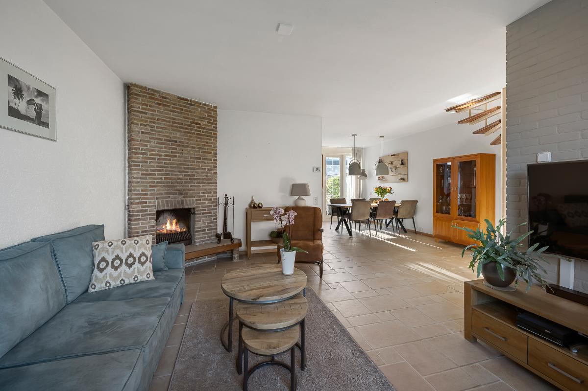 Bij binnenkomst valt meteen de lichte en vriendelijke sfeer op. De woonkamer is een heerlijke plek om te verblijven, met een gezellige open haard, warme plavuizen vloer met vloerverwarming, een speelse spiltrap én zicht op het uitgestrekte gazon aan de voorzijde. De moderne hoekkeuken (2020) is praktisch ingedeeld en biedt volop werkruimte. De eettafel kan direct naast de keuken worden geplaatst, waardoor koken en samenzijn perfect samengaan. Via zowel de keuken als de openslaande deuren loopt u zo de zonnige achtertuin op het westen in. Op warme dagen zorgt de elektrische zonnewering (2023) voor aangename schaduw.
