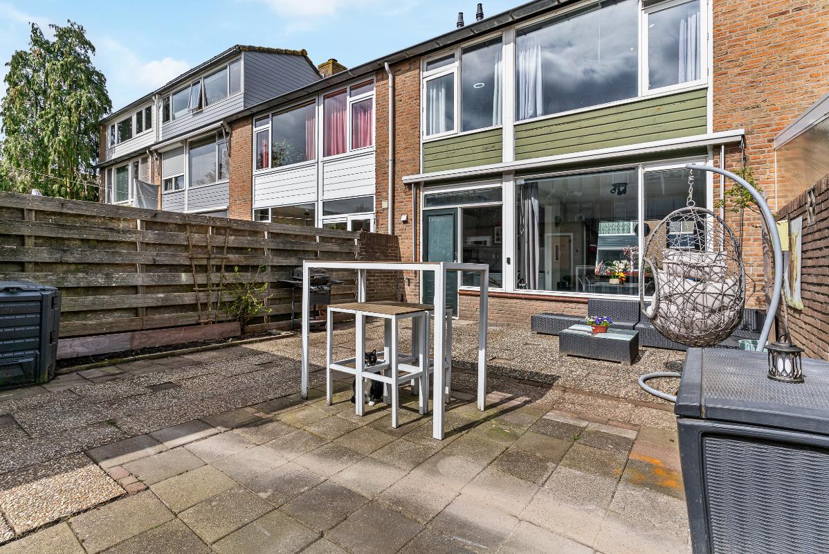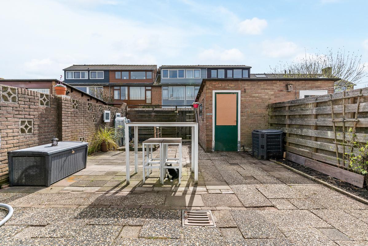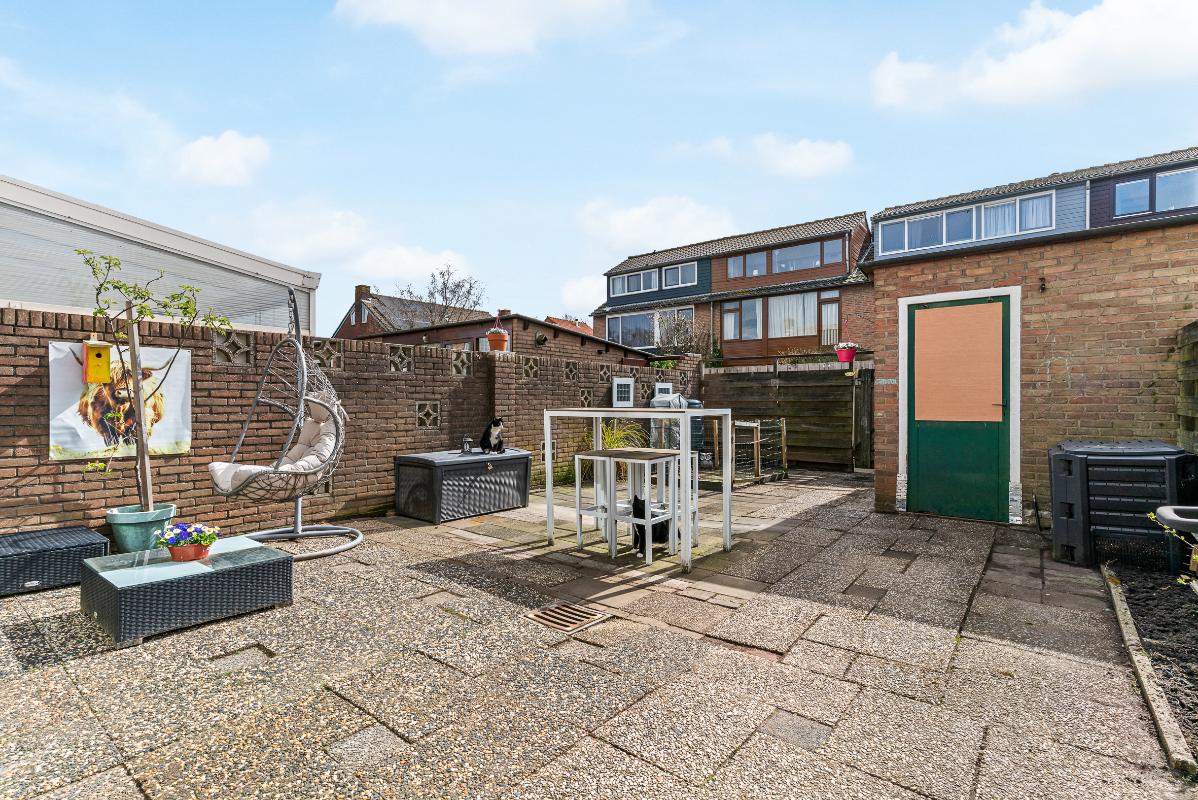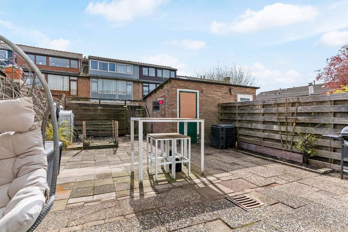 De ruime achtertuin met achterom is gelegen op het zuiden en beschikt over een vrijstaande stenen berging voorzien van elektra. De woning is verder uitgerust met handmatige buitenzonwering en grotendeels dubbel glas