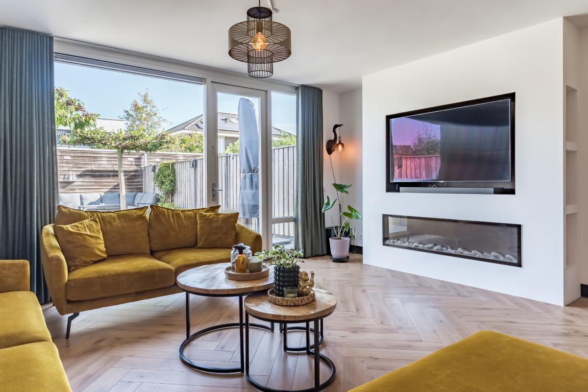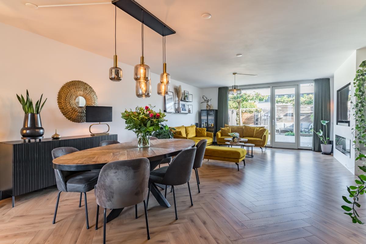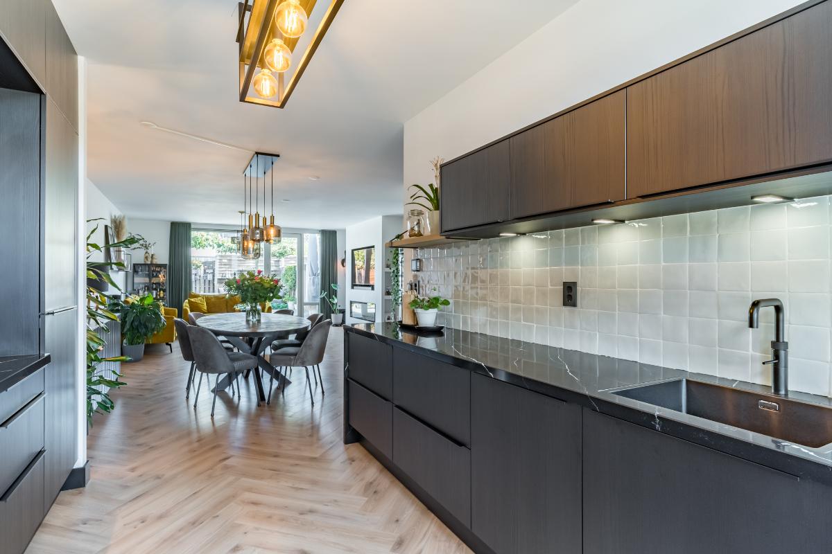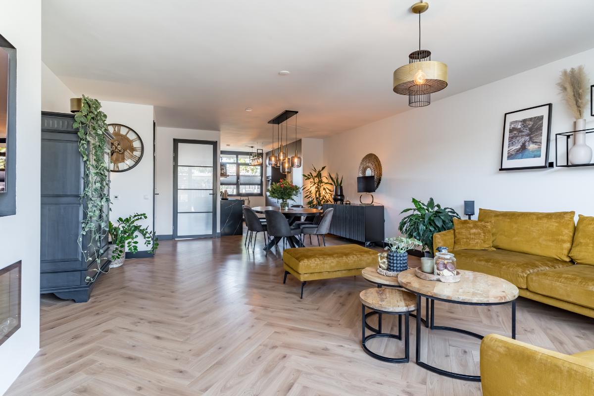 De uitgebouwde woonkamer is indrukwekkend royaal, bijna 12 meter diep! De visgraatvloer met vloerverwarming en strakke wanden en plafond geven de ruimte een moderne uitstraling. Grote raampartijen en openslaande tuindeur zorgen voor een zee van licht en verbinden binnen met buiten. Onder de trap vind je bovendien een praktische kastruimte.