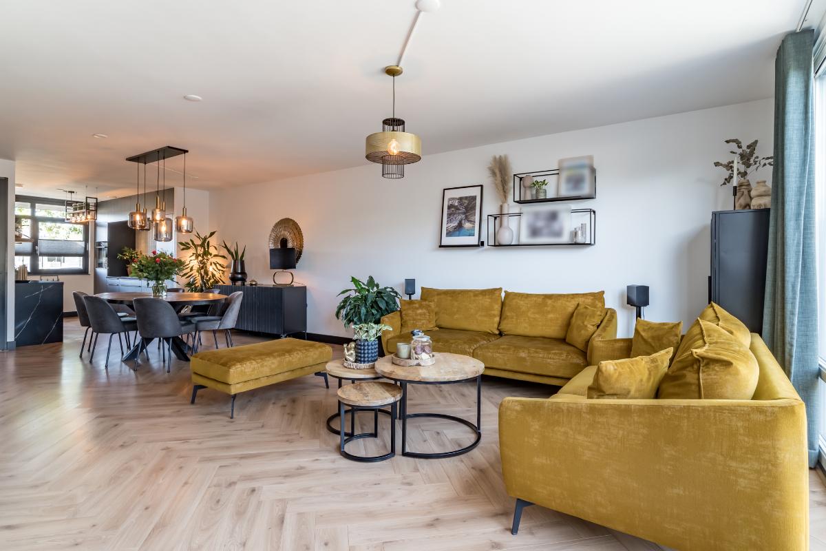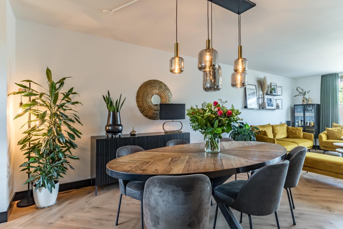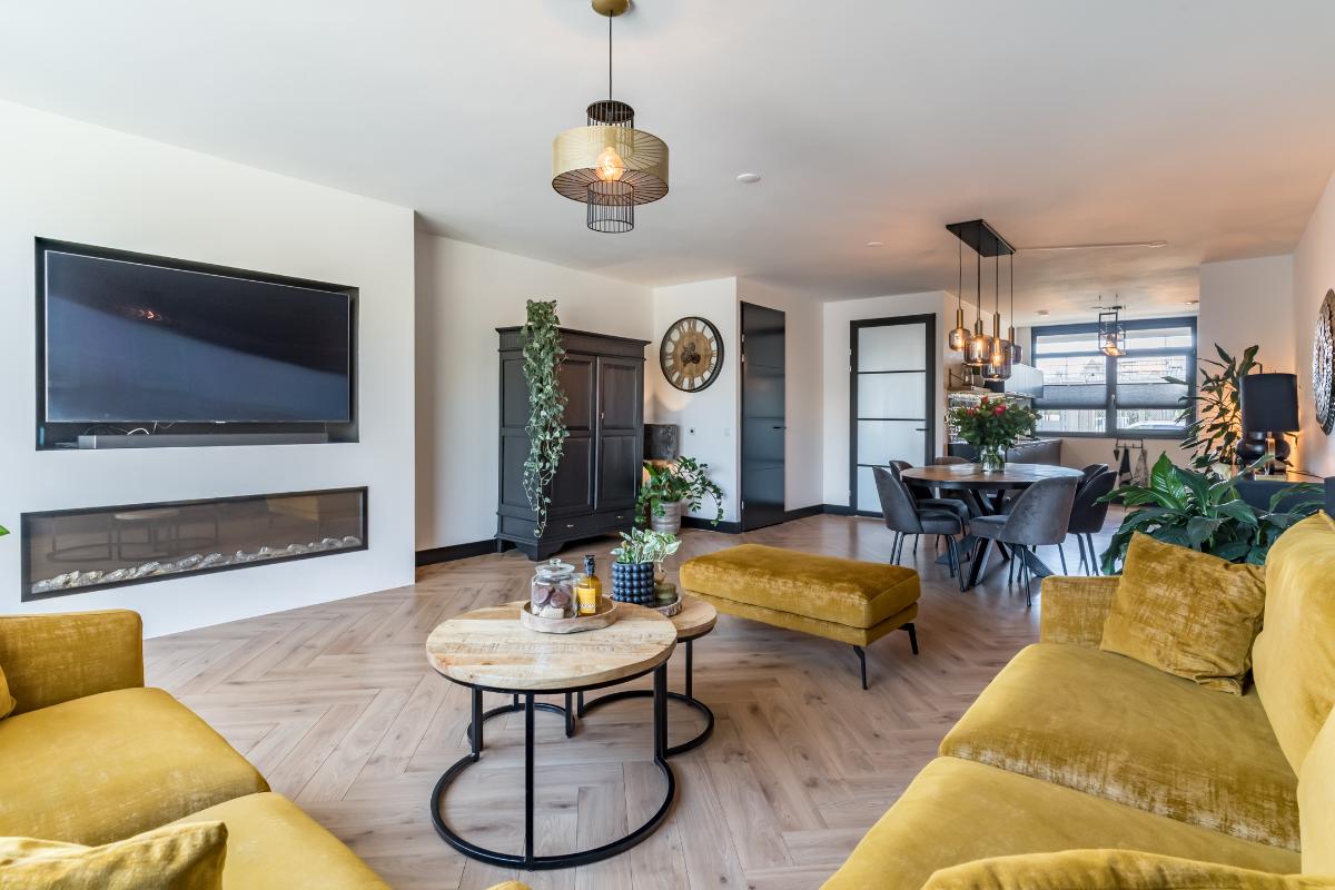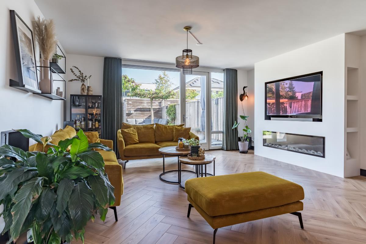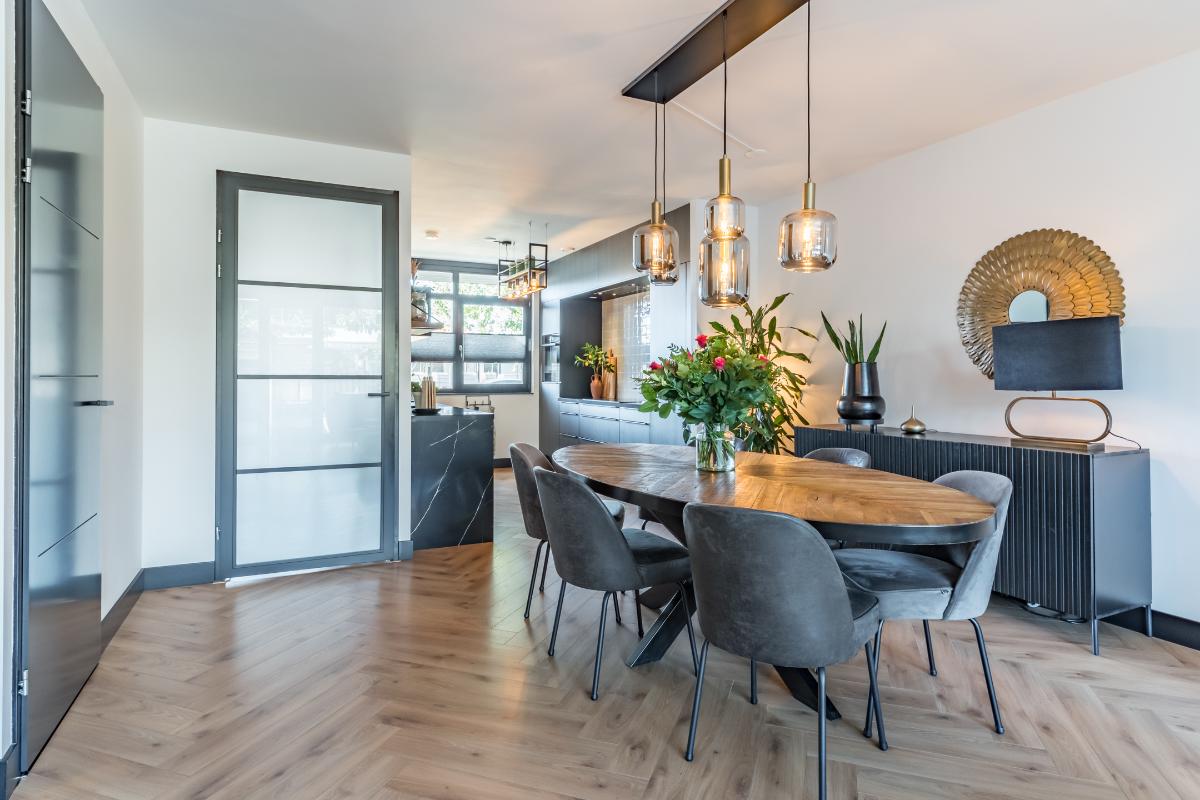 De uitgebouwde woonkamer is indrukwekkend royaal, bijna 12 meter diep! De visgraatvloer met vloerverwarming en strakke wanden en plafond geven de ruimte een moderne uitstraling. Grote raampartijen en openslaande tuindeur zorgen voor een zee van licht en verbinden binnen met buiten. Onder de trap vind je bovendien een praktische kastruimte.