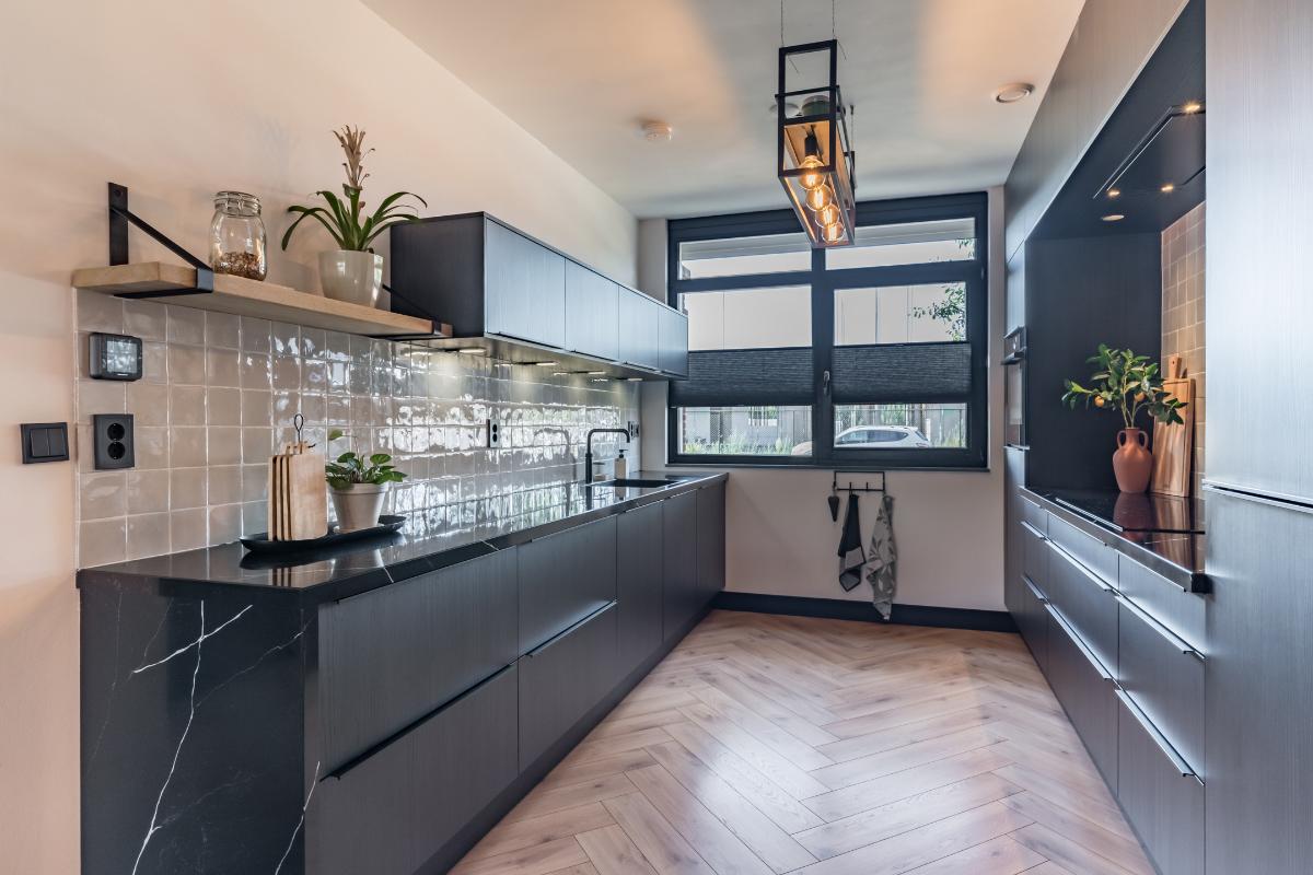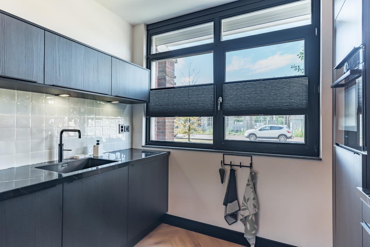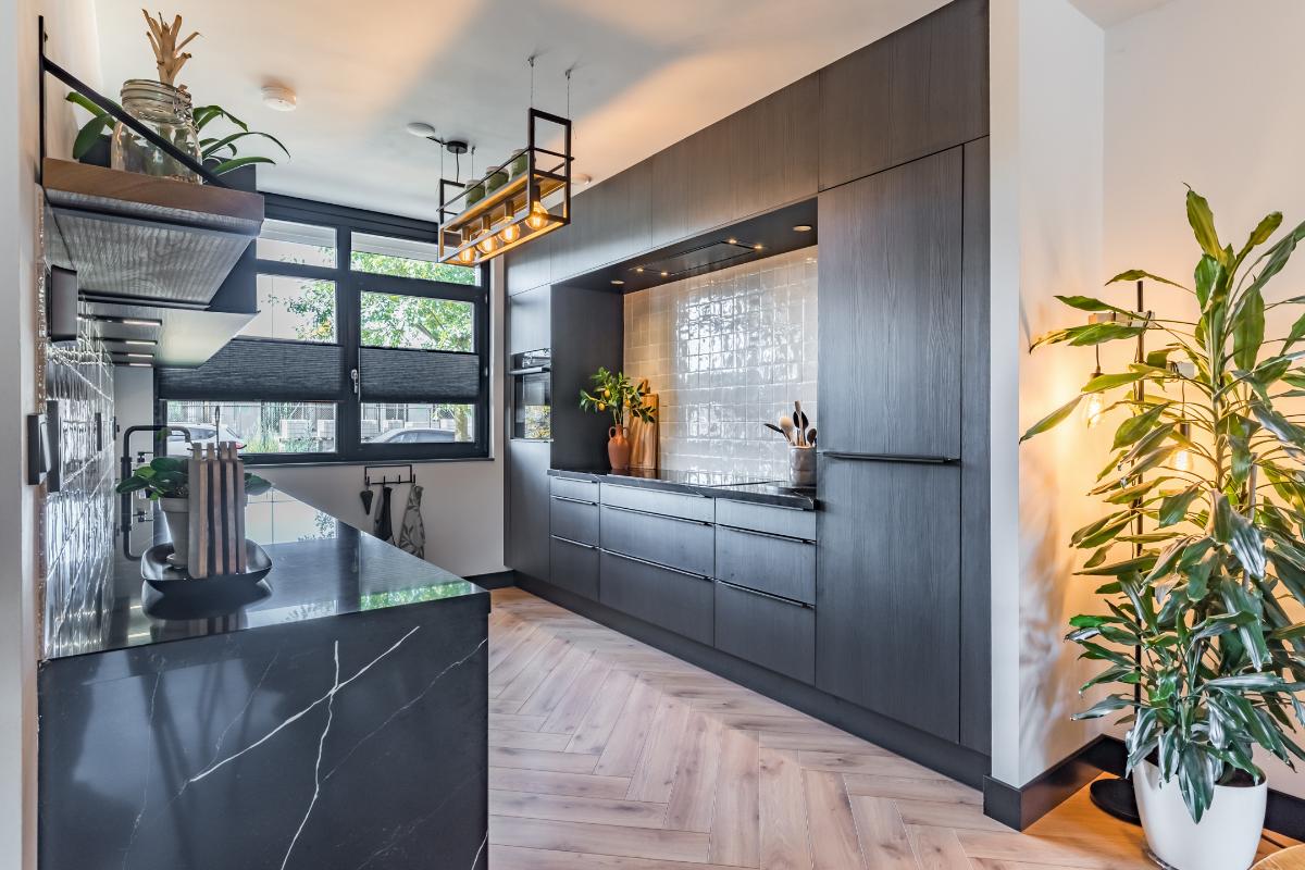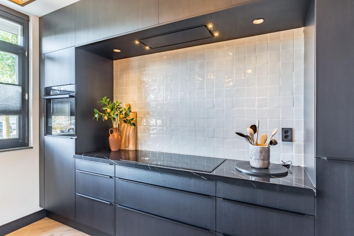 Keuken De strakke zwarte keuken aan de voorzijde is een waar kookparadijs. Voorzien van hoogwaardige inbouwapparatuur zoals een 5-pits inductiekookplaat , Quooker, afzuigkap, extra hoge oven met magnetronfunctie, vaatwasser, koelkast en diepvries (alle inbouwapparatuur van A-merken) is het hier elke dag fijn koken. Het royale granieten werkblad en de vele kasten, voornamelijk lades, maken deze keuken zowel praktisch als stijlvol.