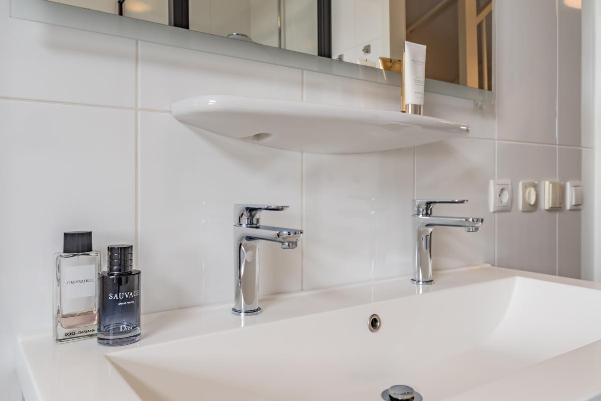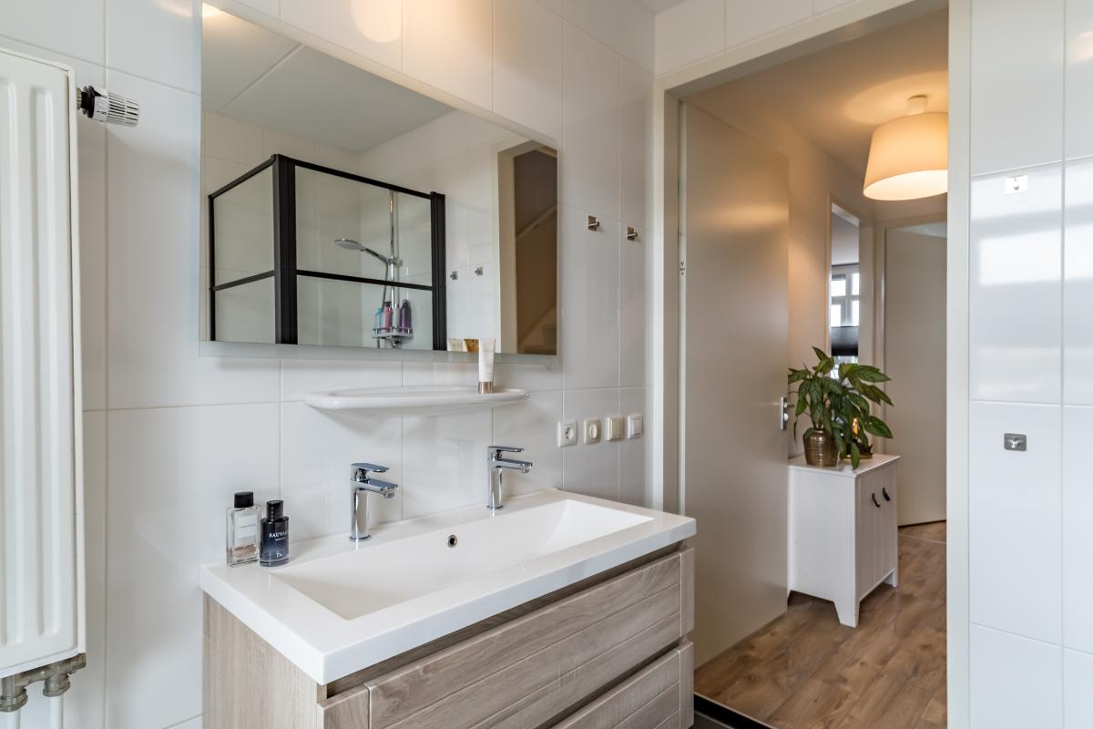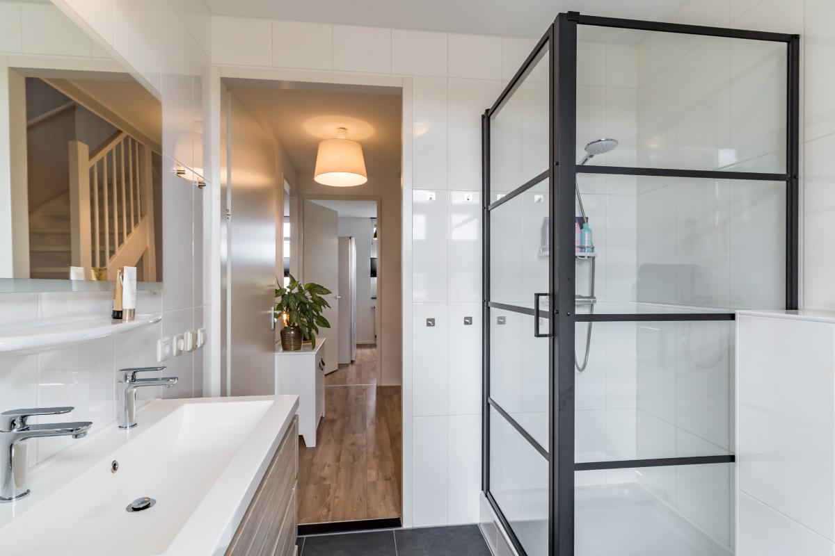 Badkamer De lichte badkamer is ingericht met een ligbad, aparte douchecabine, wandcloset en een wastafelmeubel. Strakke lijnen en moderne materialen maken dit tot een heerlijke plek om te ontspannen.