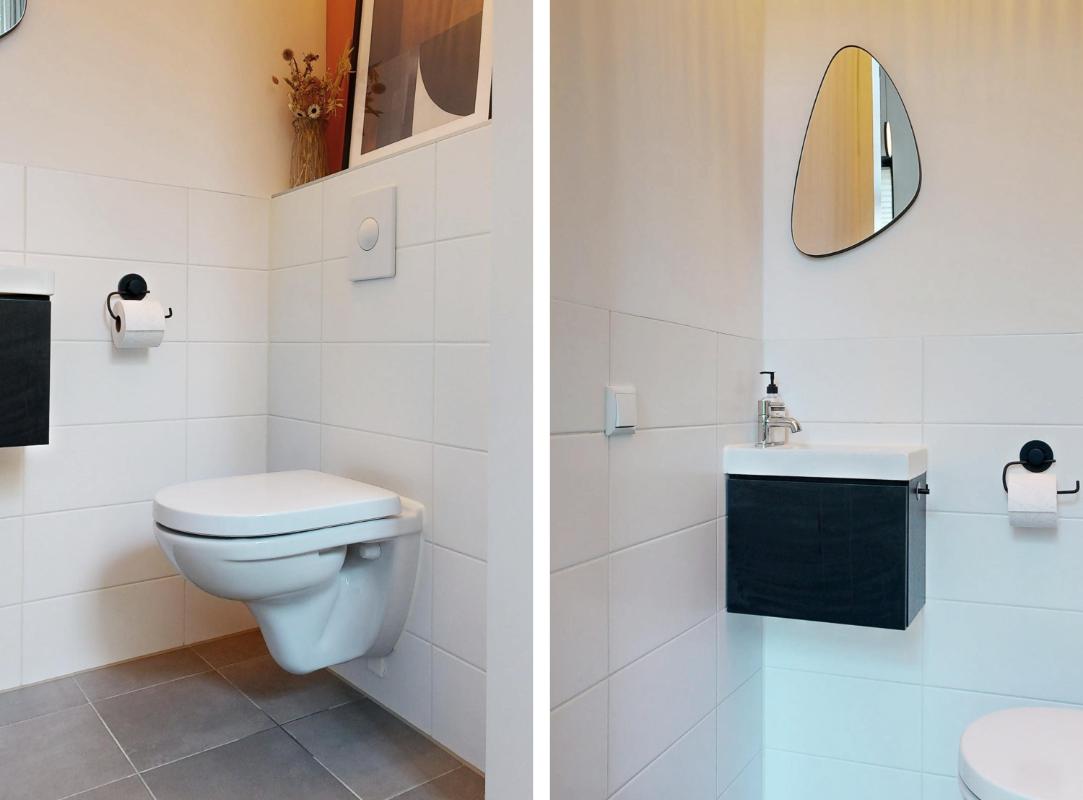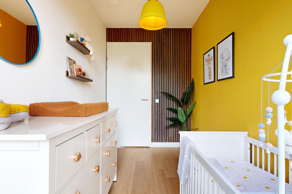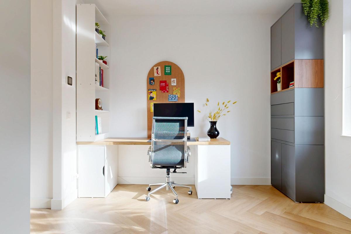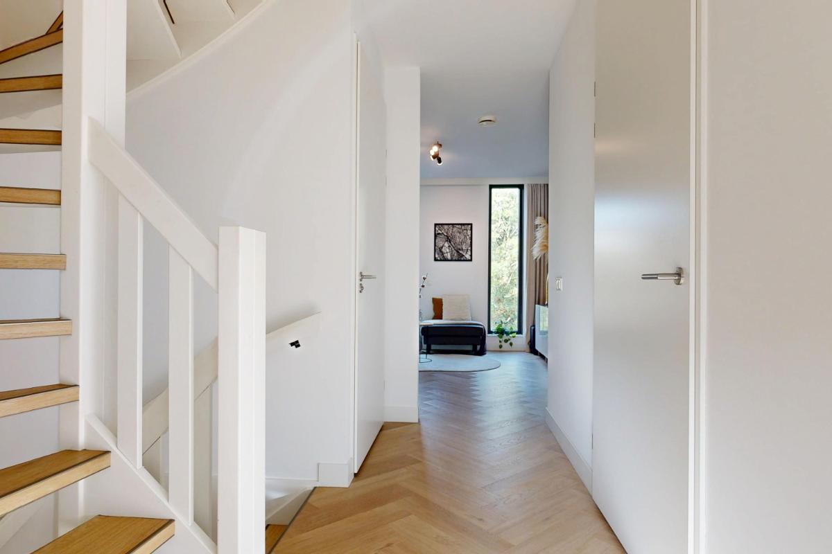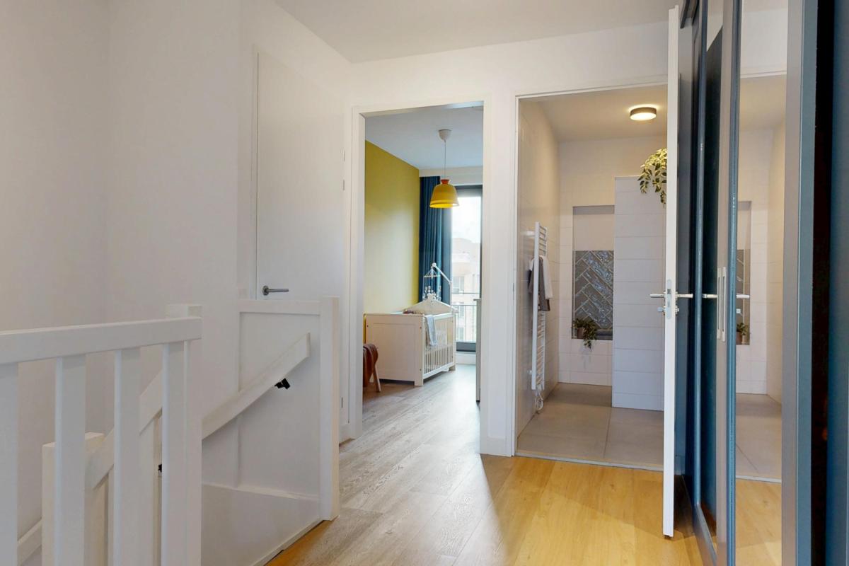 Op de tweede etage kom je uit op een ruime overloop met een separaat toilet en een praktische wasruimte voor de wasmachine en droger. Aan de voorzijde ligt de woonkamer: een lichte, comfortabele ruimte met veel daglicht en een klein balkon, met uitzicht op groen en water. Aan de achterzijde bevindt zich een veelzijdige kamer — ideaal voor thuiswerken of als extra slaapkamer. De hoogwaardige afwerking zorgt voor een moderne, verfijnde uitstraling.