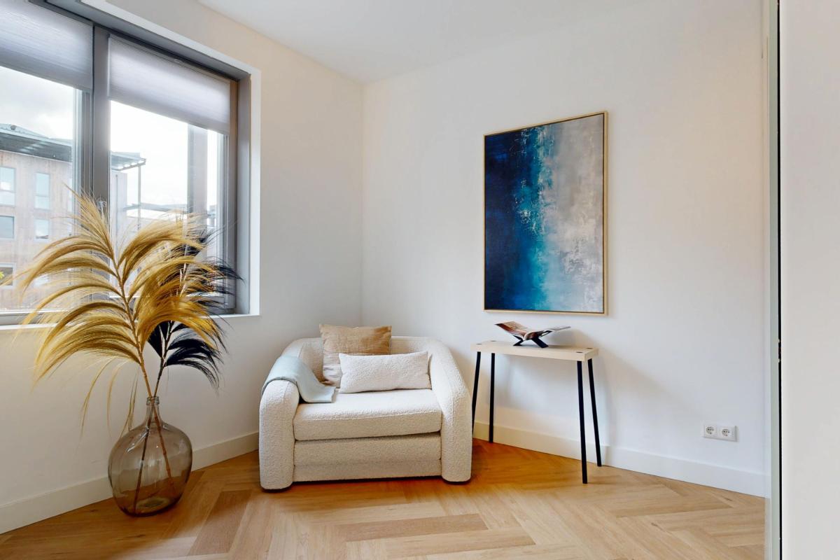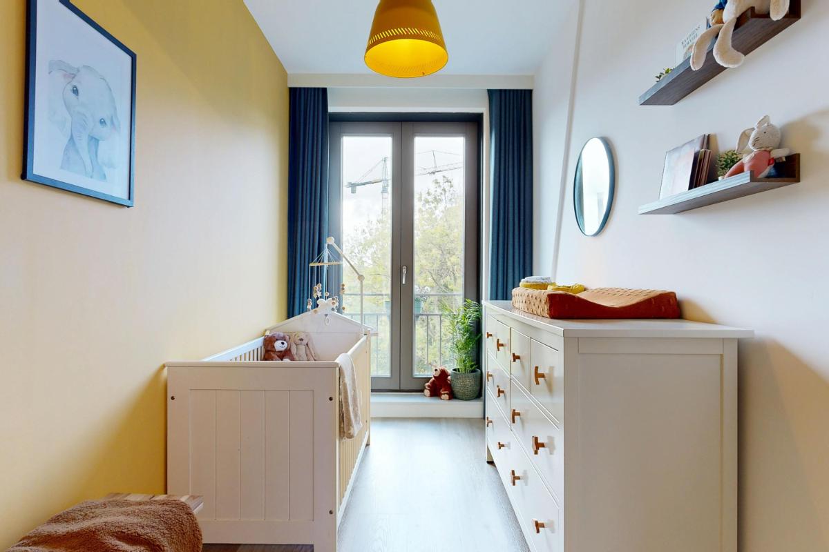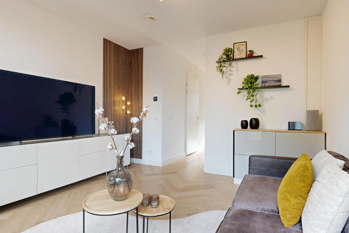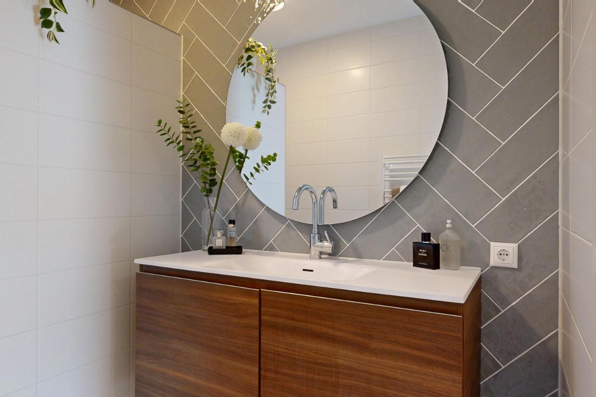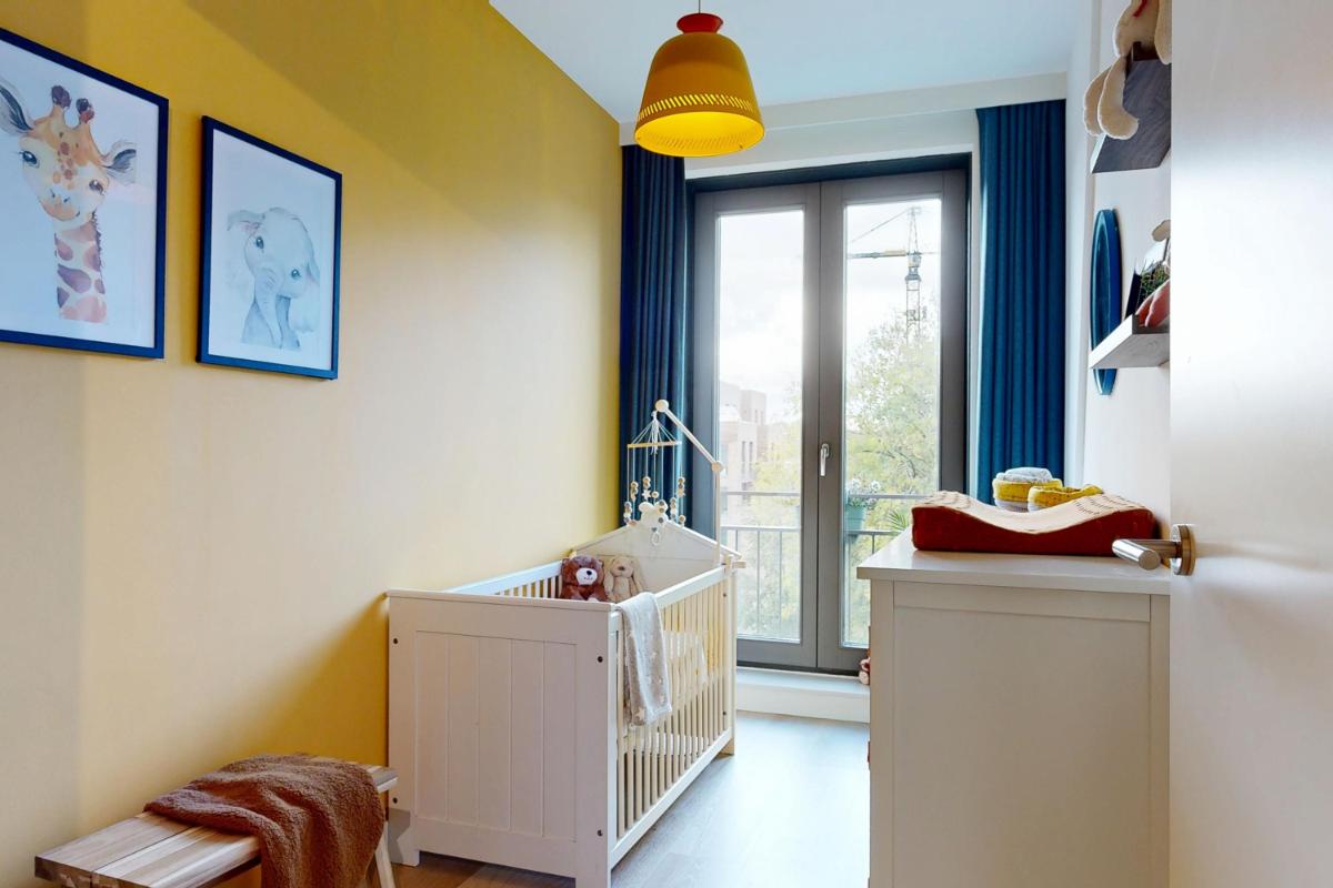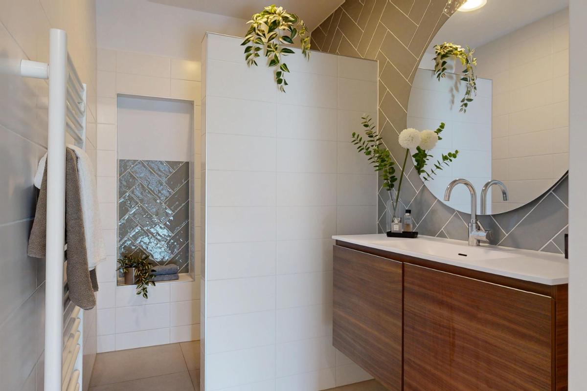 Op de tweede etage kom je uit op een ruime overloop met een separaat toilet en een praktische wasruimte voor de wasmachine en droger. Aan de voorzijde ligt de woonkamer: een lichte, comfortabele ruimte met veel daglicht en een klein balkon, met uitzicht op groen en water. Aan de achterzijde bevindt zich een veelzijdige kamer — ideaal voor thuiswerken of als extra slaapkamer. De hoogwaardige afwerking zorgt voor een moderne, verfijnde uitstraling.