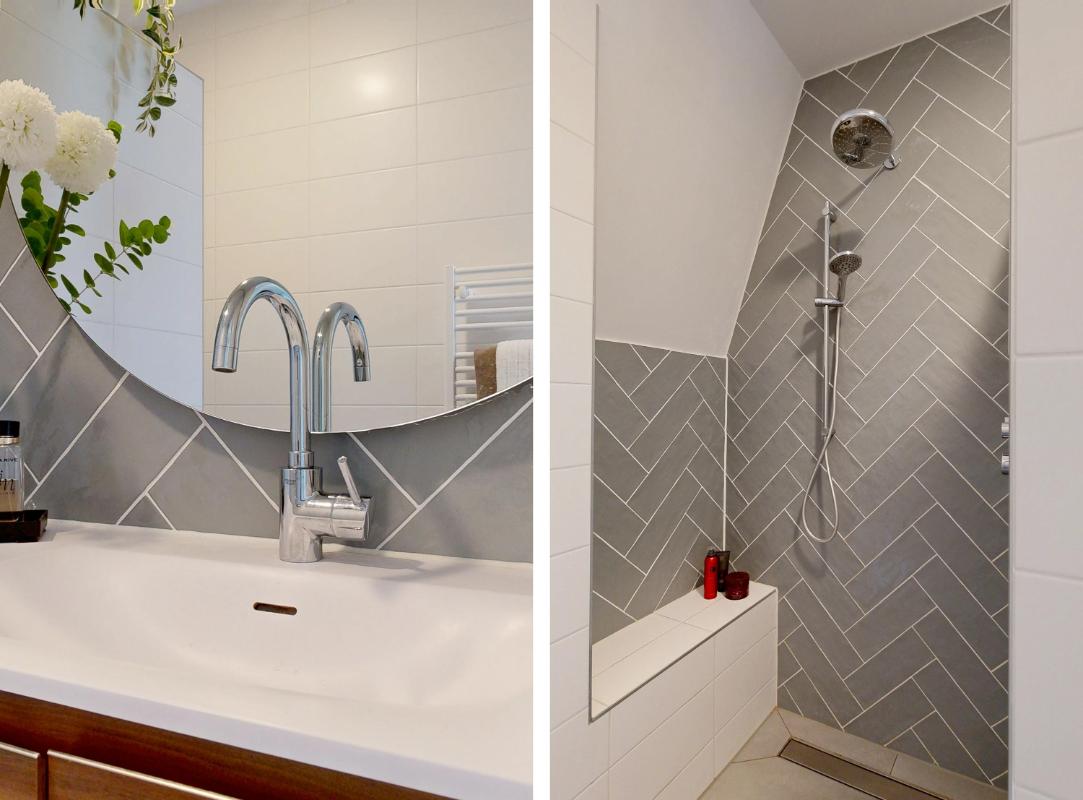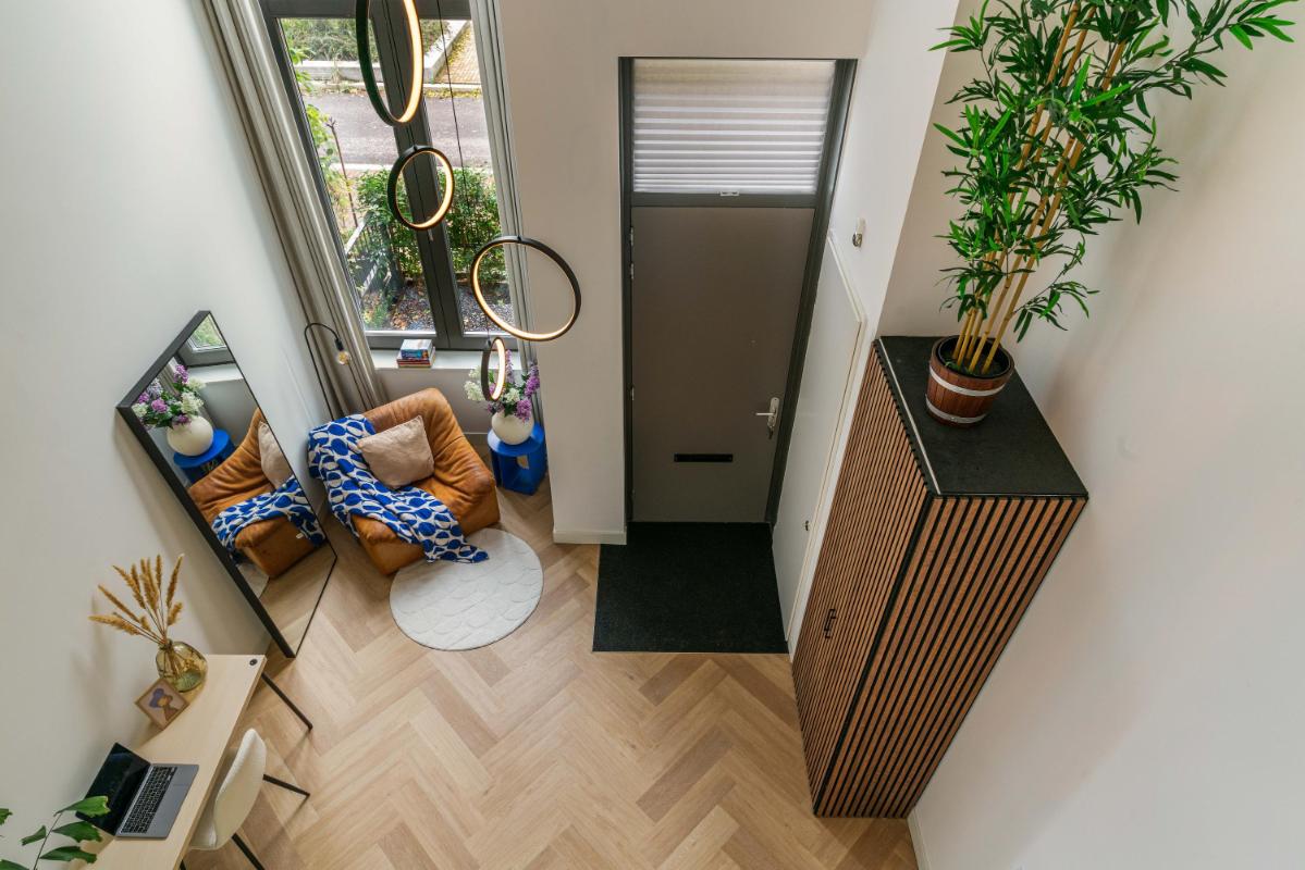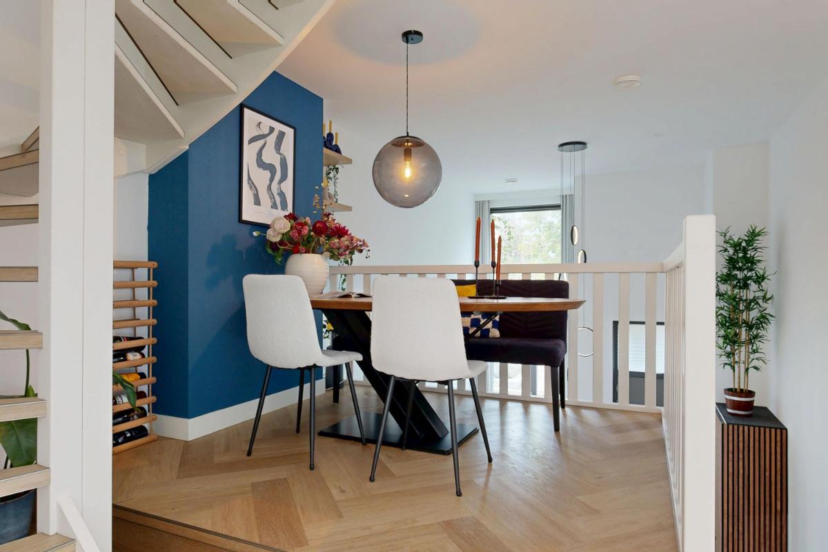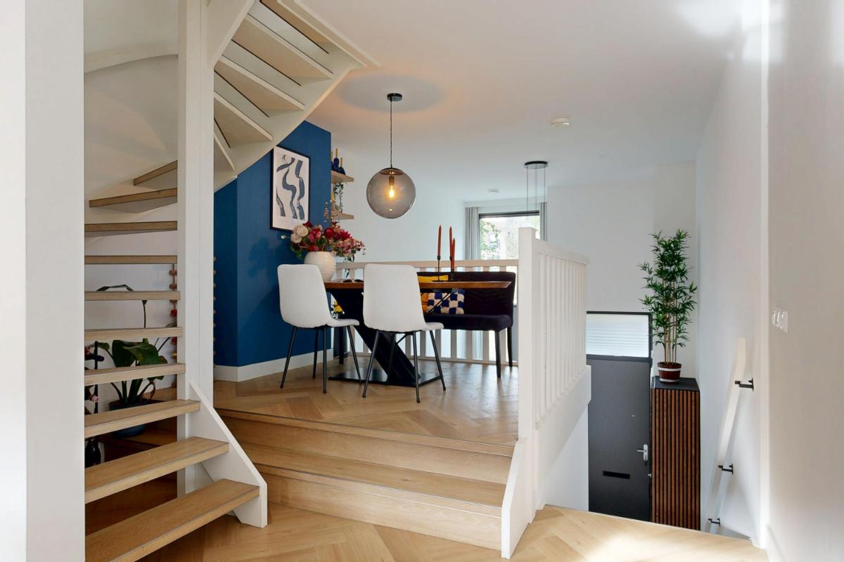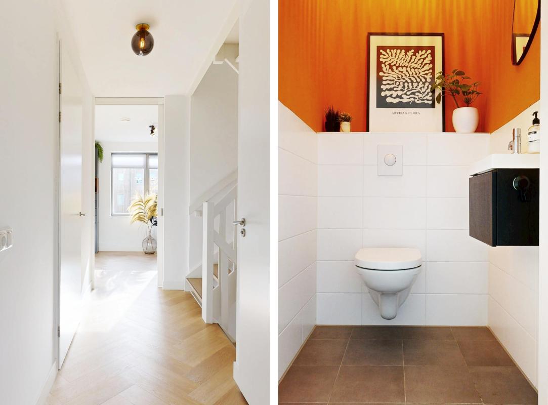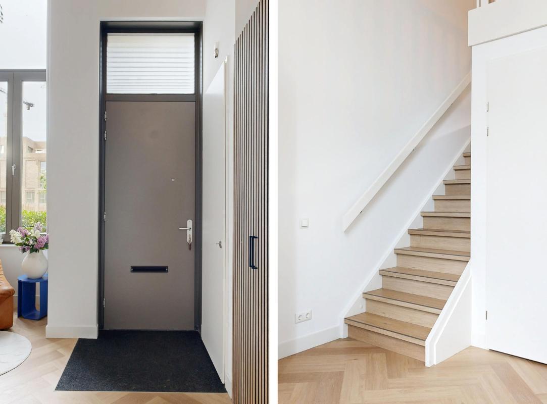 De woning ligt in een rustige straat met zicht op het groen en deels ook het water van het Amsterdam-Rijnkanaal. Zodra je binnenstapt, word je verwelkomd door een lichte entree met een vijf meter hoog plafond dat het split-level karakter prachtig laat zien. Hier vind je een praktische toiletruimte, een berging met warmtepomp, voldoende opbergruimte voor jassen en schoenen en ruimte voor een gezellige zithoek, speel- of werkplek. De sfeervolle afwerking geeft direct een warm en modern welkom.