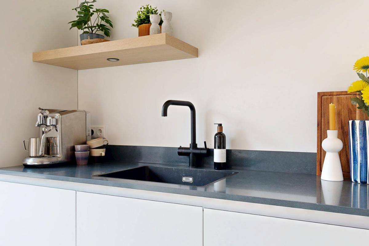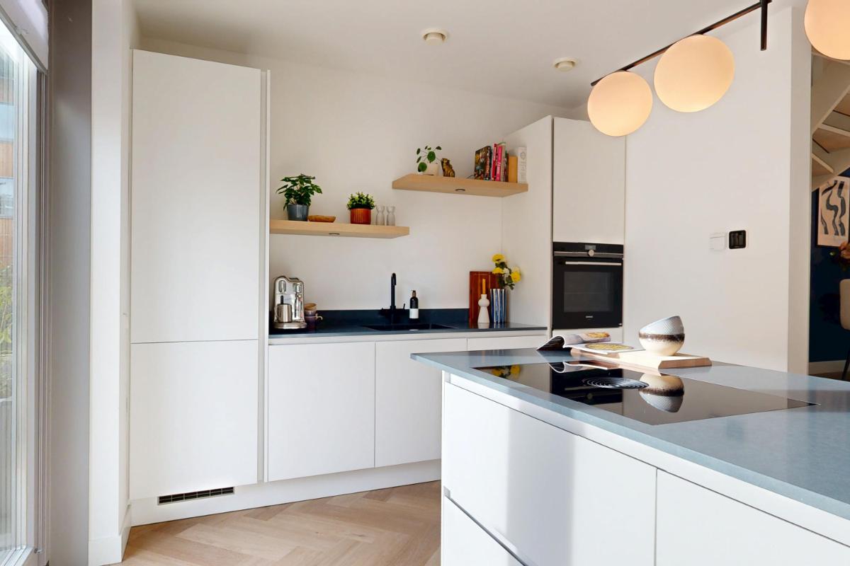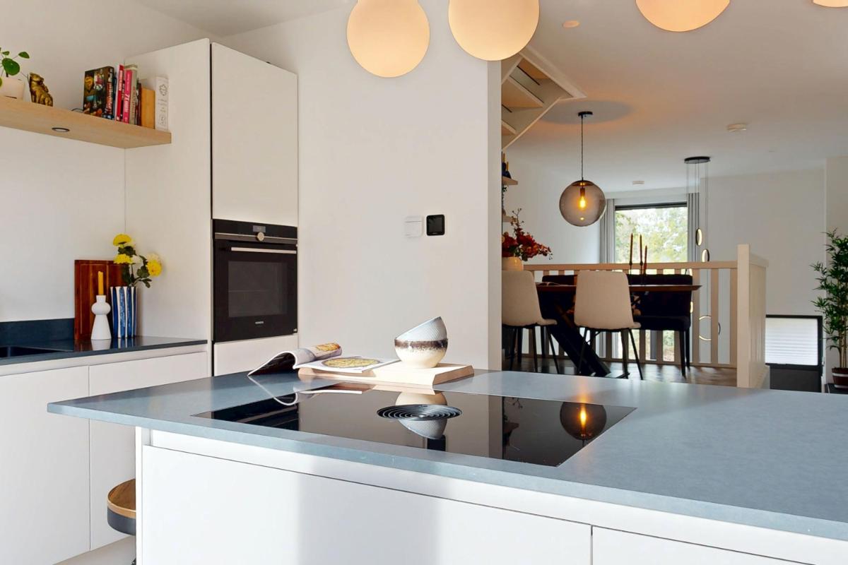 Loop de trap op en je komt in het kook- en eetgedeelte. De gezellige eethoek sluit naadloos aan op de moderne keuken, die is uitgerust met alle gewenste inbouwapparatuur, grotendeels van Siemens, waaronder een Bora-kookplaat en een handige kraan met kookfunctie. Dankzij de praktische opstelling met kookeiland en bar is dit een fijne plek om te koken én samen te zijn. Vanuit de keuken stap je zo de terrastuin in — ideaal voor een snelle kop koffie in de zon.
