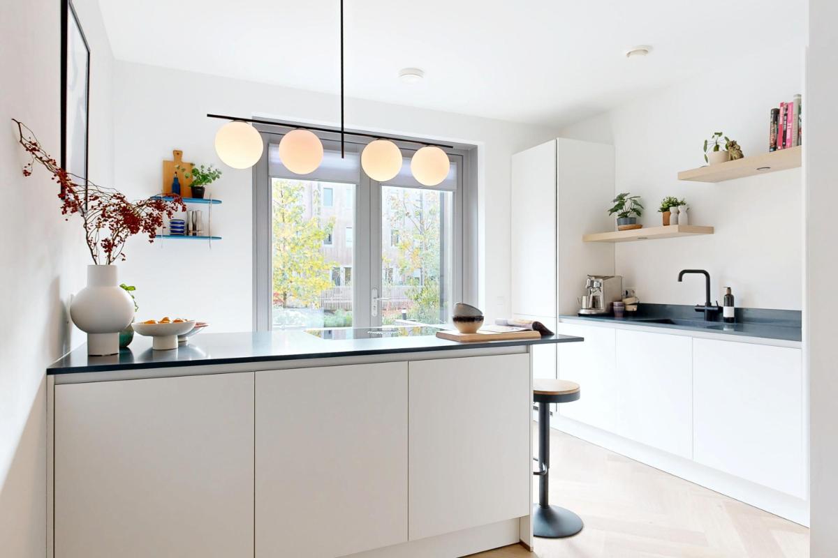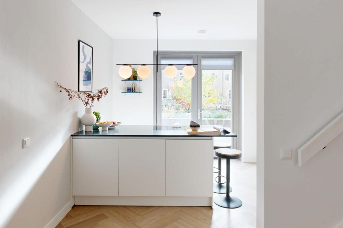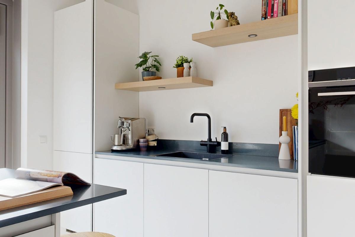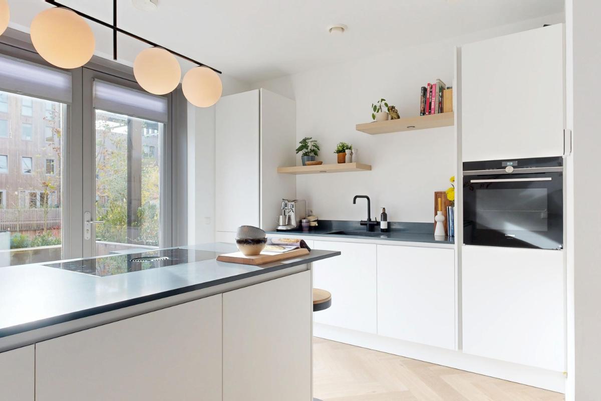 Loop de trap op en je komt in het kook- en eetgedeelte. De gezellige eethoek sluit naadloos aan op de moderne keuken, die is uitgerust met alle gewenste inbouwapparatuur, grotendeels van Siemens, waaronder een Bora-kookplaat en een handige kraan met kookfunctie. Dankzij de praktische opstelling met kookeiland en bar is dit een fijne plek om te koken én samen te zijn. Vanuit de keuken stap je zo de terrastuin in — ideaal voor een snelle kop koffie in de zon.