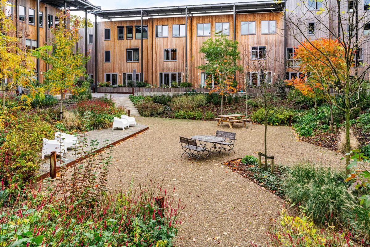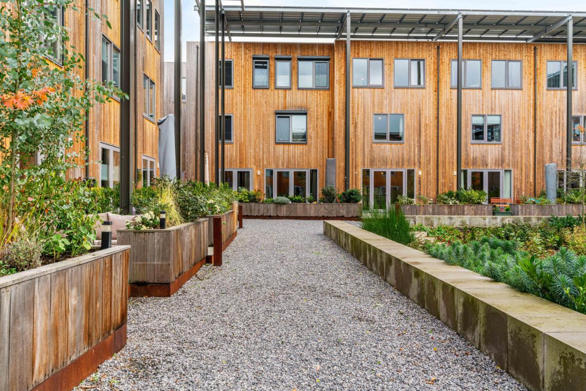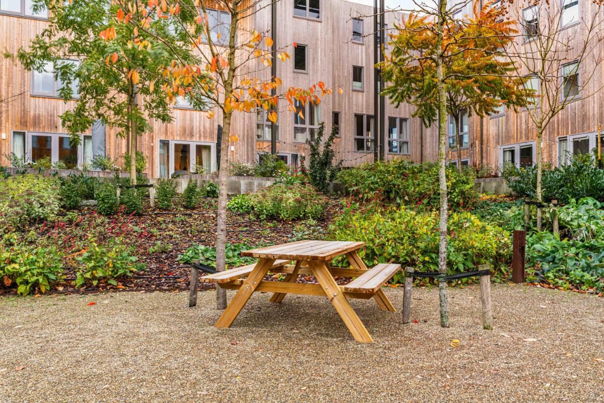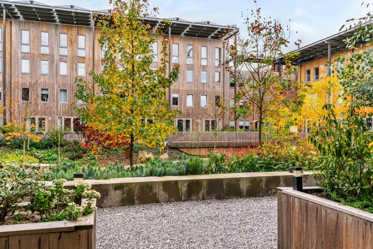 De terrastuin ligt pal op het zuiden en biedt ruimte voor een gezellig zitje, perfect om te ontspannen in de zon. Bereikbaar vanuit de keuken, vormt het een natuurlijke verlenging van je leefruimte. Via de fraai aangelegde, gemeenschappelijke binnentuin bereik je de parkeerplaats en berging, gelegen in de gezamenlijke garage onder de woningen. Alles is onderhoudsvriendelijk en biedt volop privacy in een groene, rustige setting.