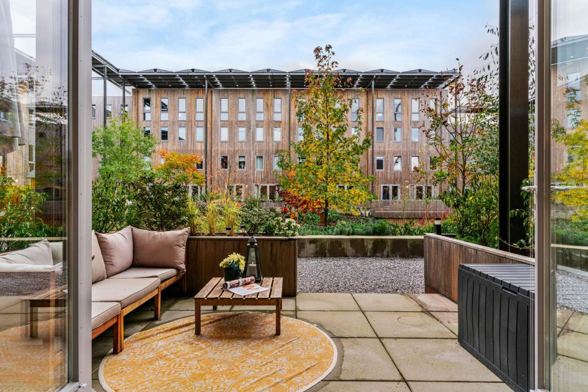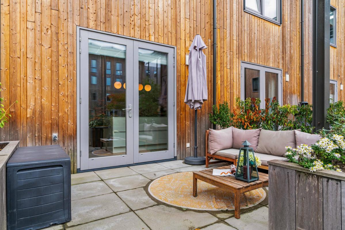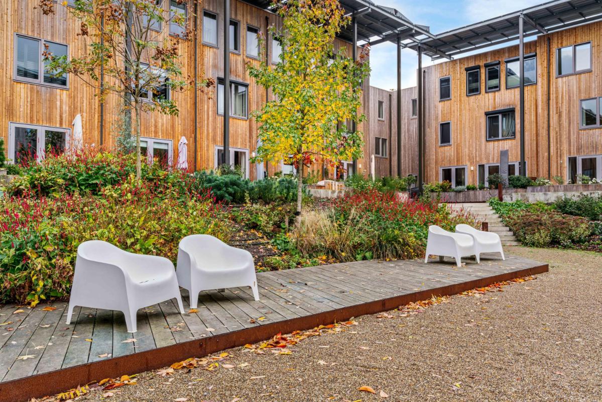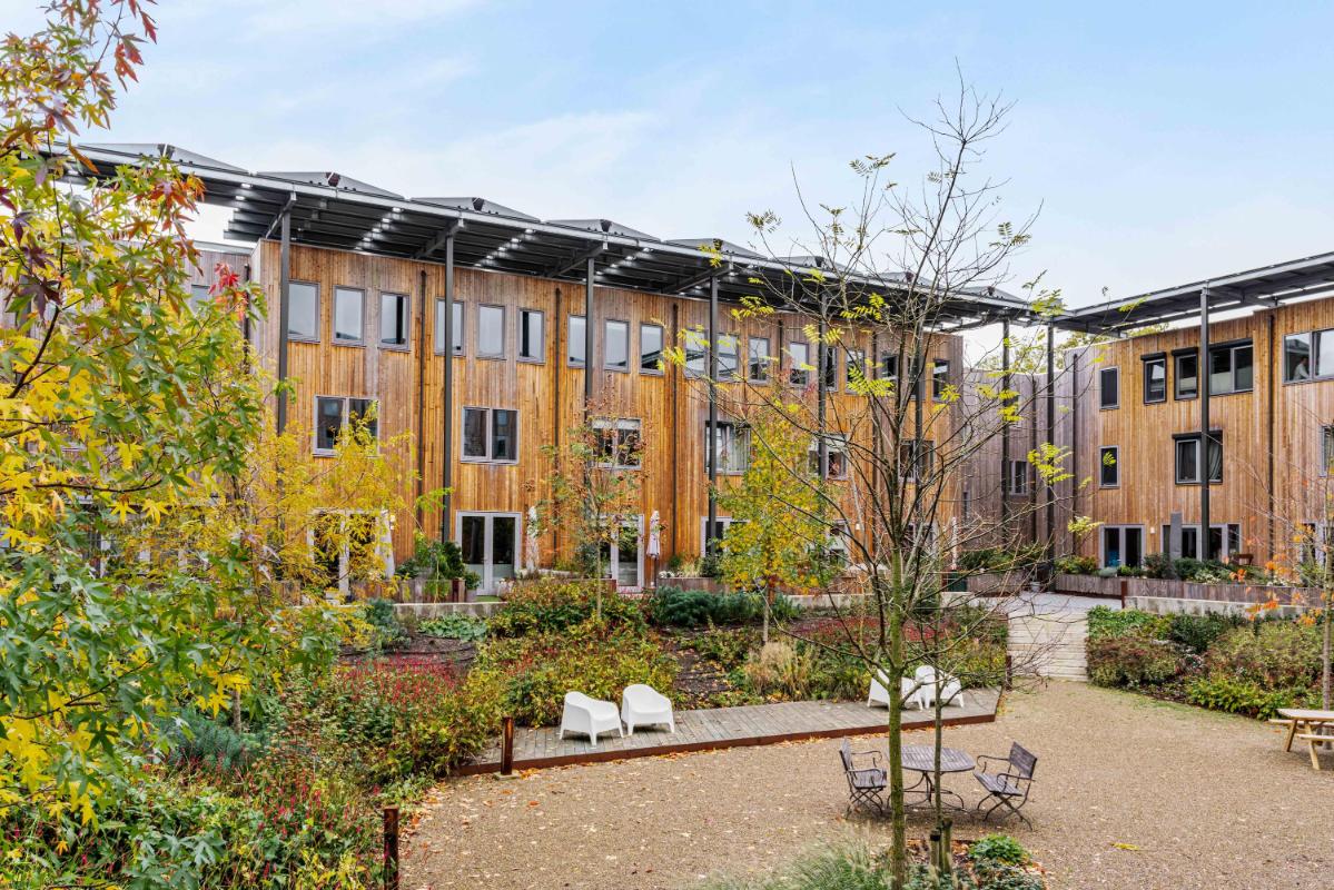 De terrastuin ligt pal op het zuiden en biedt ruimte voor een gezellig zitje, perfect om te ontspannen in de zon. Bereikbaar vanuit de keuken, vormt het een natuurlijke verlenging van je leefruimte. Via de fraai aangelegde, gemeenschappelijke binnentuin bereik je de parkeerplaats en berging, gelegen in de gezamenlijke garage onder de woningen. Alles is onderhoudsvriendelijk en biedt volop privacy in een groene, rustige setting.