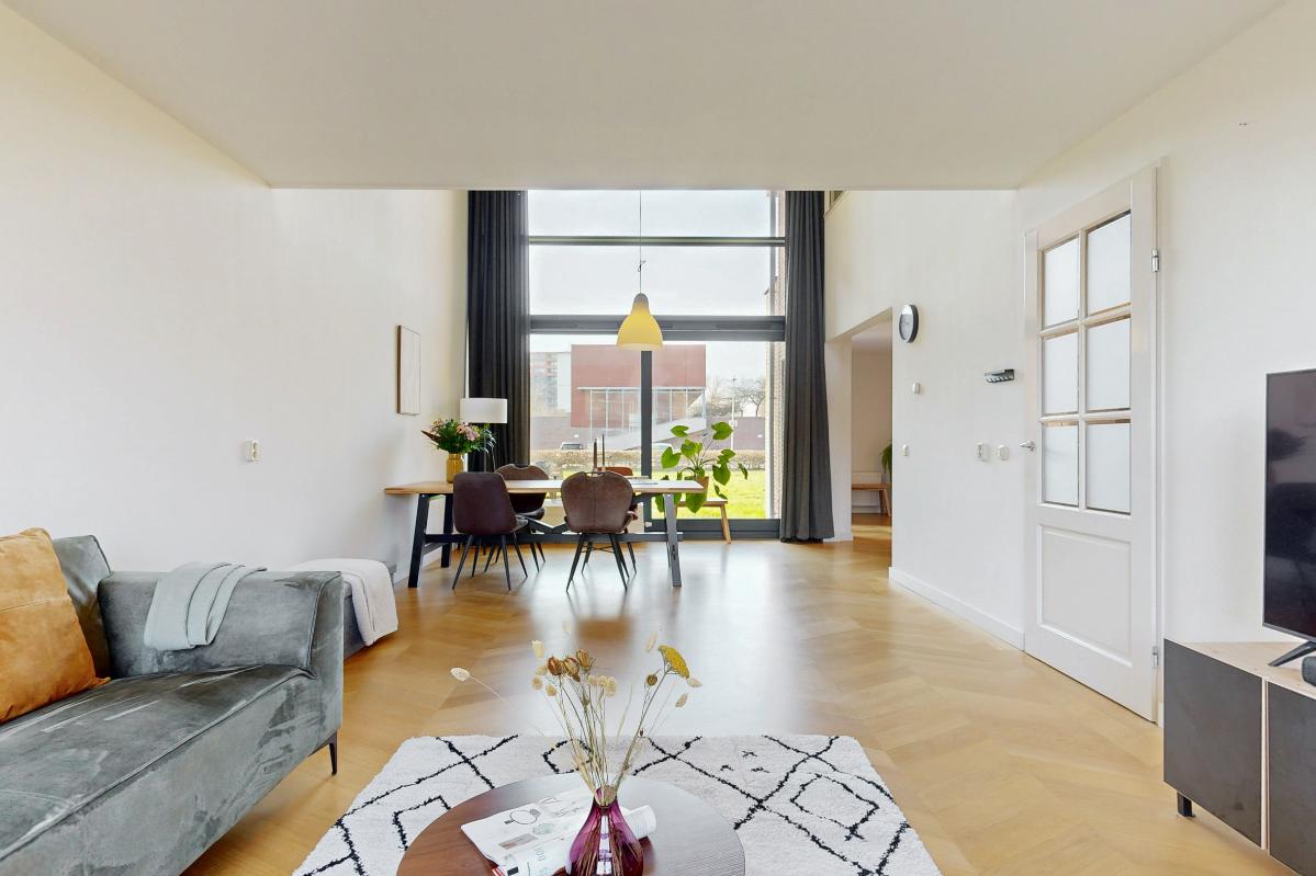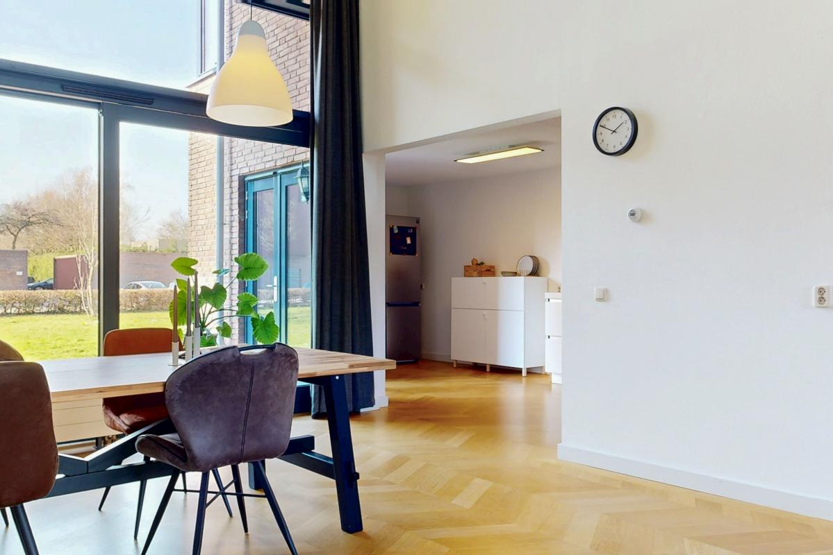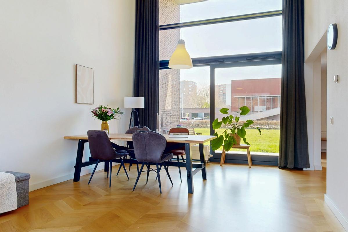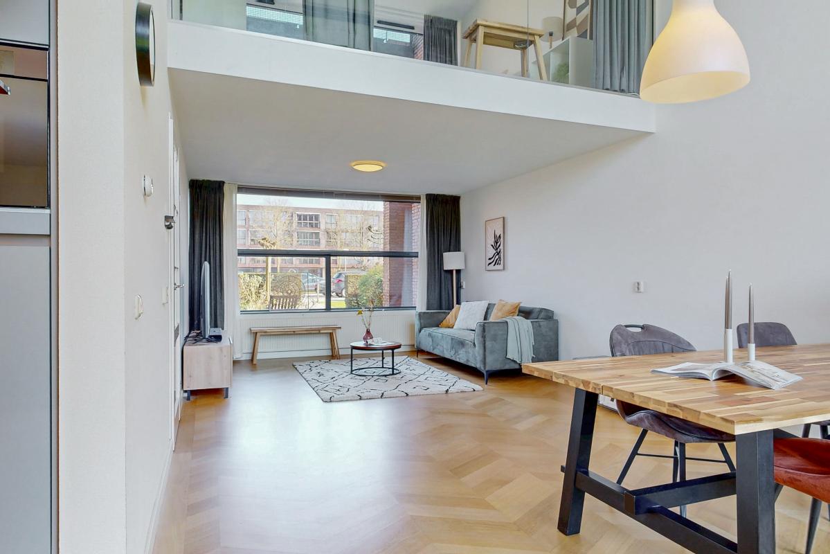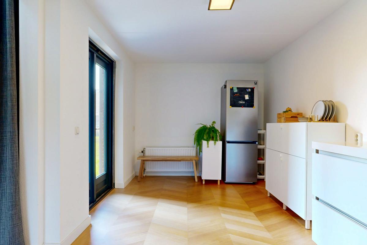 Deze lichte en royale woning biedt veel woonplezier en is ideaal voor gezinnen. De hal geeft toegang tot een trapkast, een zwevend toilet met fontein en een praktische inpandige berging. De keuken is uitgevoerd in hoekopstelling en voorzien van inductiekookplaat, afzuigkap, vaatwasser en een losse koel-/vriescombinatie. Vanuit de keuken leiden openslaande deuren direct naar de zonnige achtertuin. De woonkamer is bijzonder ruim door het hoge plafond, de grote schuifpui en de elegante parketvloer. Op de bovenverdieping bevinden zich drie slaapkamers, waaronder één met een glazen wand bij de vide, wat extra licht en karakter toevoegt. De tweede slaapkamer ligt aan de voorzijde en de derde aan de achterzijde van de woning. De moderne badkamer is uitgerust met een inloopdouche, wastafelmeubel en een zwevend toilet. Daarnaast beschikt de woning over een eigen parkeerplek op het parkeerterrein en de mogelijkheid gebruik te maken van de gemeenschappelijke fietsenstalling.