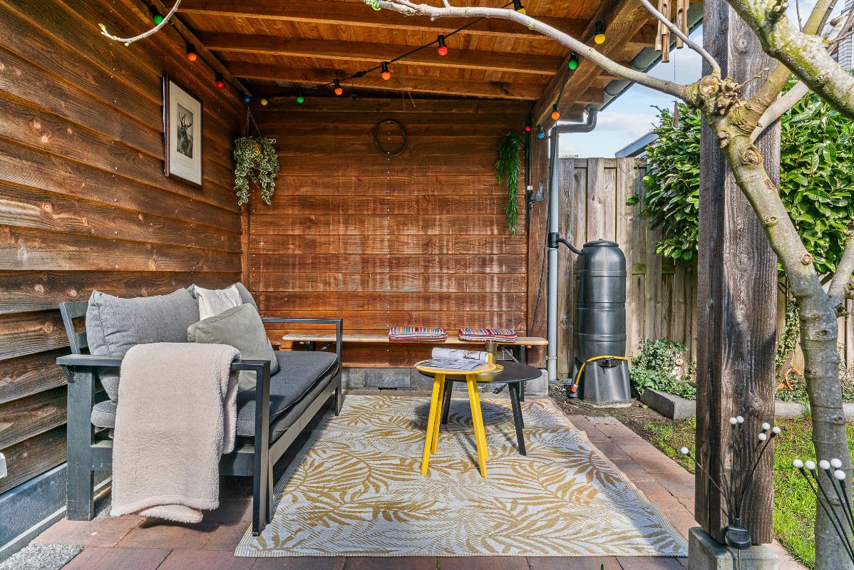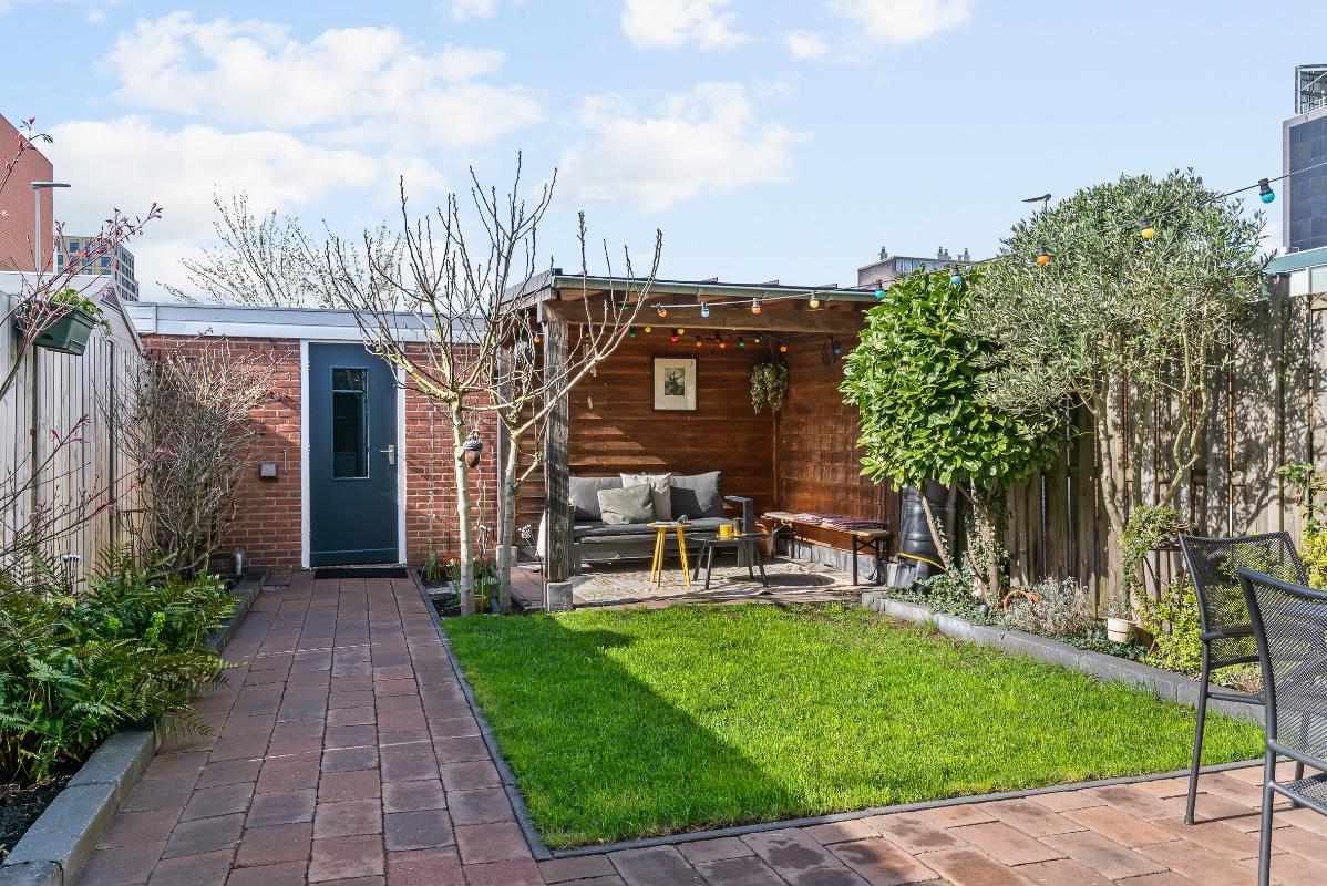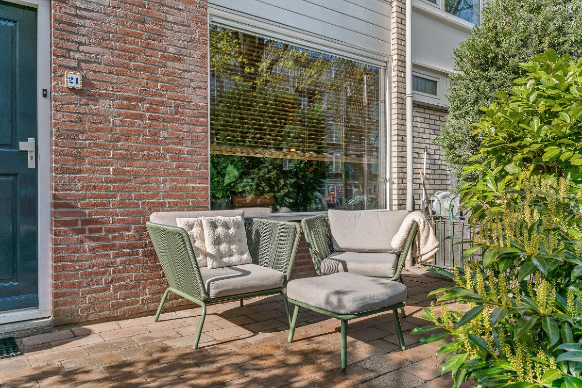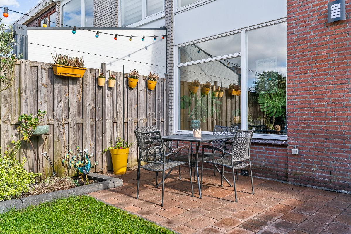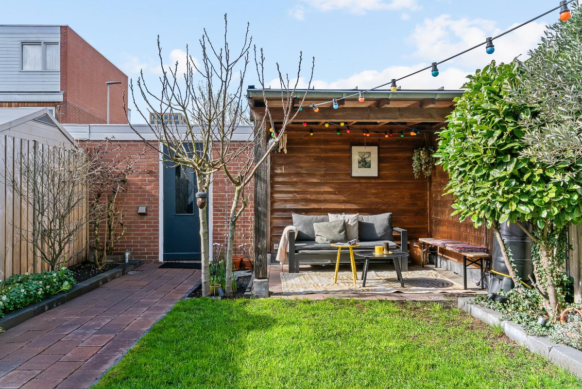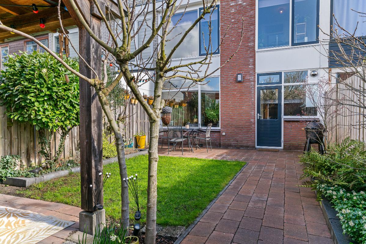 Vanuit de keuken bereik je de tuin. De achtertuin op het noordwesten biedt plek voor meerdere terrassen, een overkapping en toegang tot de garage met achterom. Door de vrije ligging aan de achterzijde geniet je in de achtertuin van de middag- en avondzon in alle rust en privacy. De voortuin op het zuidoosten biedt ook veel privacy door het volwassen groen en is een fijne plek om te genieten van de ochtend- en middagzon.