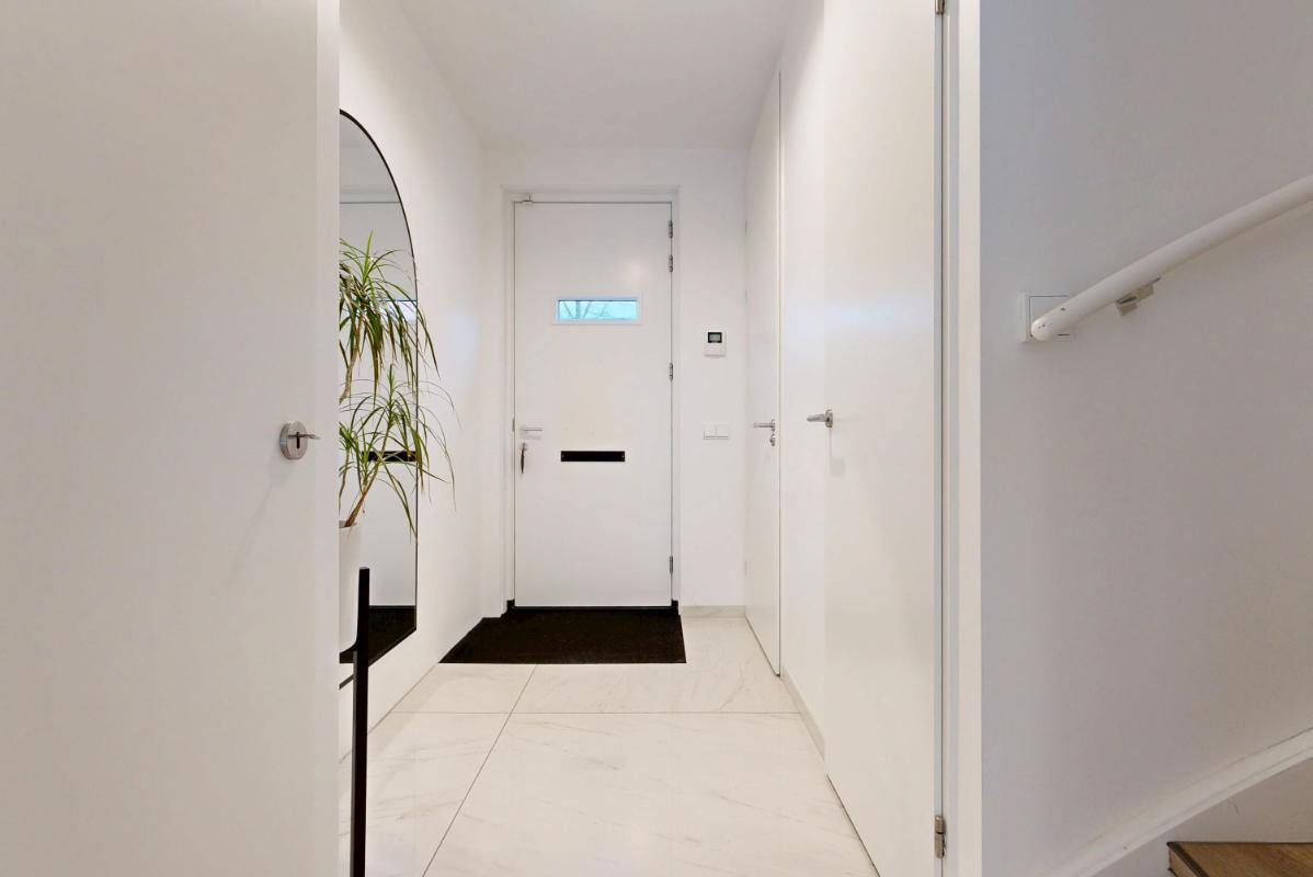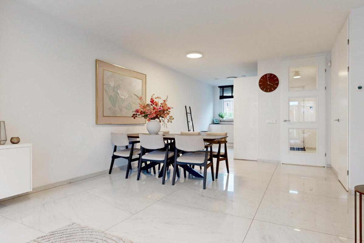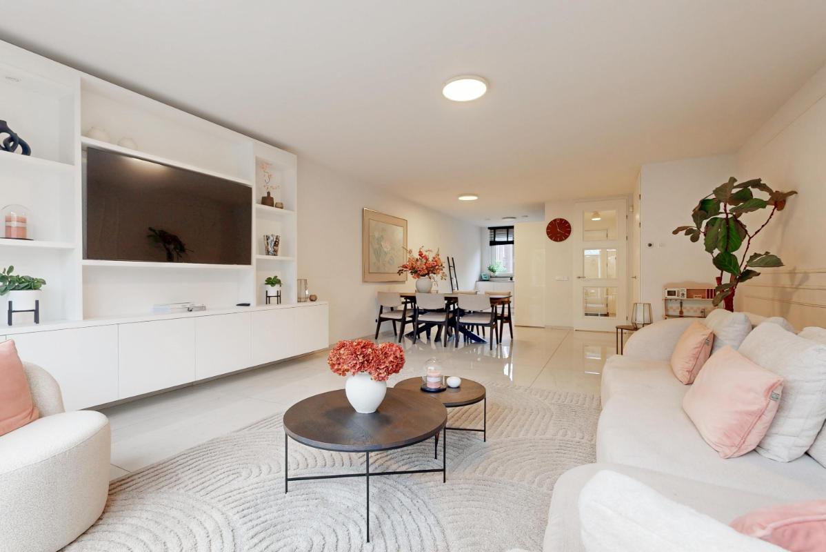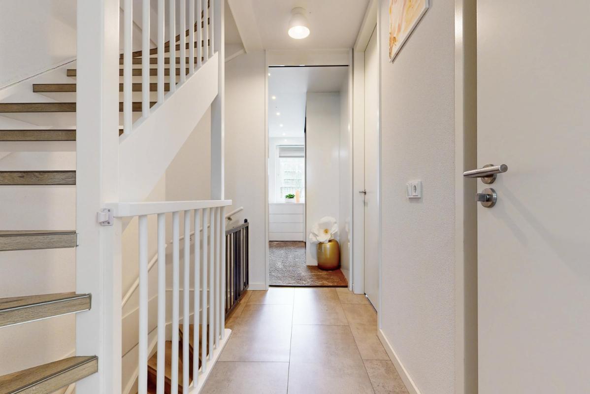 Je komt binnen in de hal met een plavuizenvloer voorzien van vloerverwarming, een modern toilet en een fraaie op maat gemaakte garderobekast, ideaal om jassen en schoenen netjes uit het zicht op te bergen. Vanuit de hal stap je de uitgebouwde woonkamer binnen, waar direct de ruimte en het licht opvallen. De woonkamer beschikt over een praktische trapkast, een royaal (tv-)meubel over de wand en openslaande deuren naar de tuin.