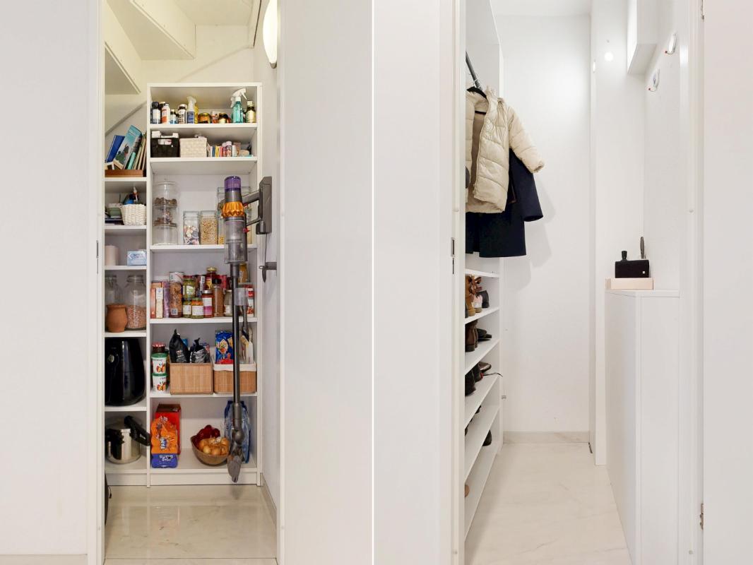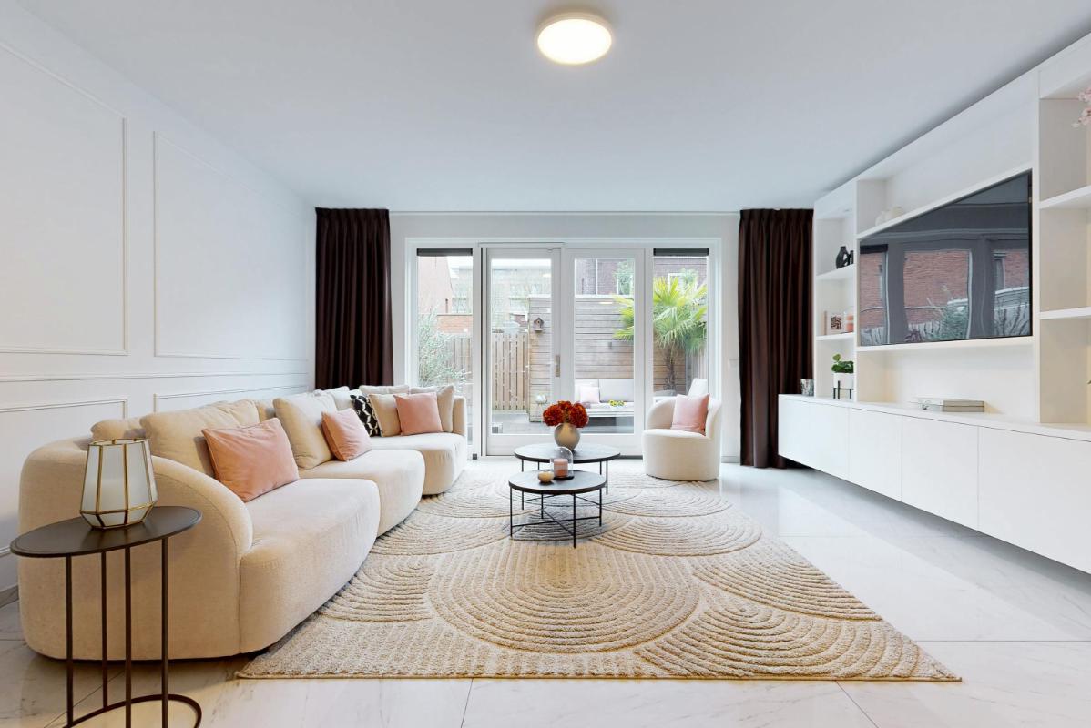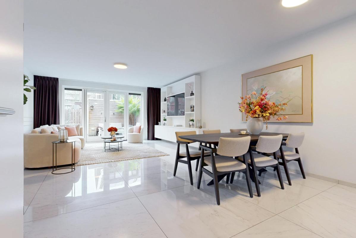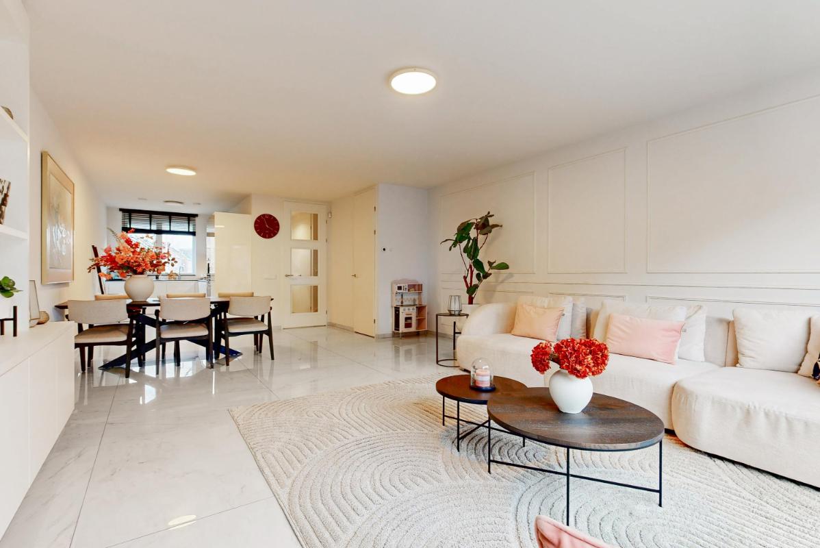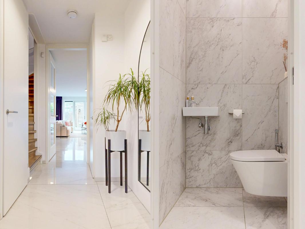 Je komt binnen in de hal met een plavuizenvloer voorzien van vloerverwarming, een modern toilet en een fraaie op maat gemaakte garderobekast, ideaal om jassen en schoenen netjes uit het zicht op te bergen. Vanuit de hal stap je de uitgebouwde woonkamer binnen, waar direct de ruimte en het licht opvallen. De woonkamer beschikt over een praktische trapkast, een royaal (tv-)meubel over de wand en openslaande deuren naar de tuin.