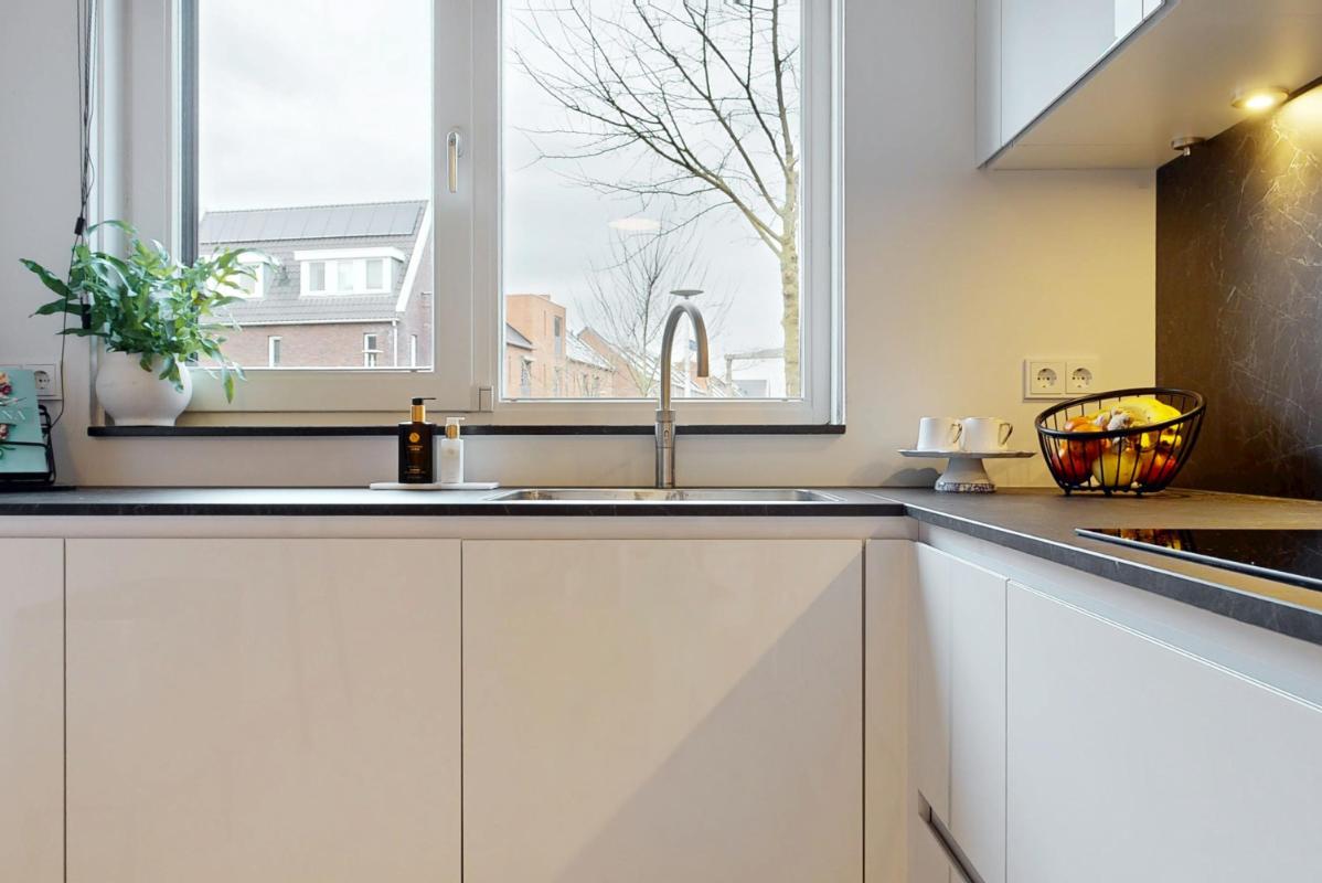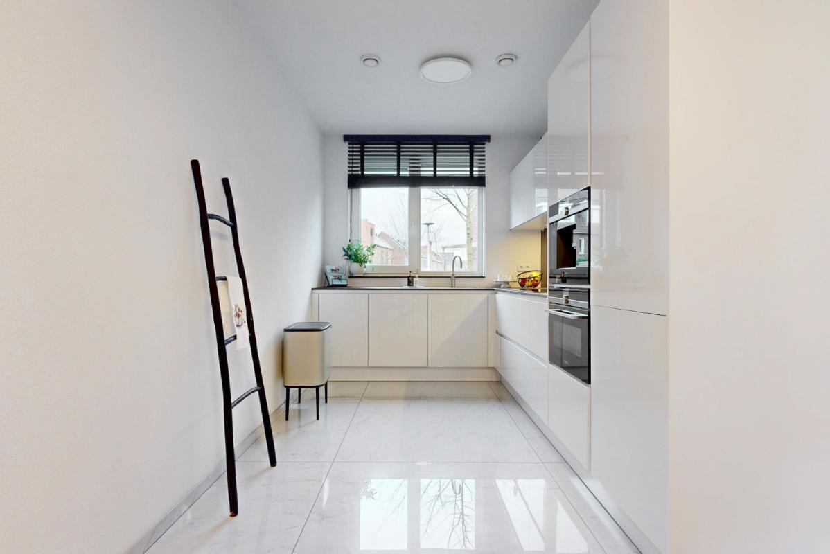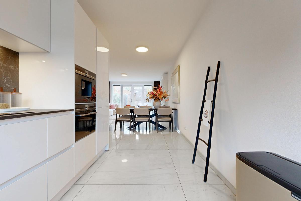 De keuken aan de voorzijde is uitgevoerd in een L-opstelling en staat in open verbinding met het woongedeelte. De lichte keuken heeft een eigentijdse uitstraling en is voorzien van alle gewenste inbouwapparatuur, met als extra’s onder andere een Quooker en een ingebouwde koffiemachine. Vloerverwarming over de gehele begane grond en strak afgewerkte wanden en plafonds zorgen voor een comfortabele en verzorgde uitstraling.