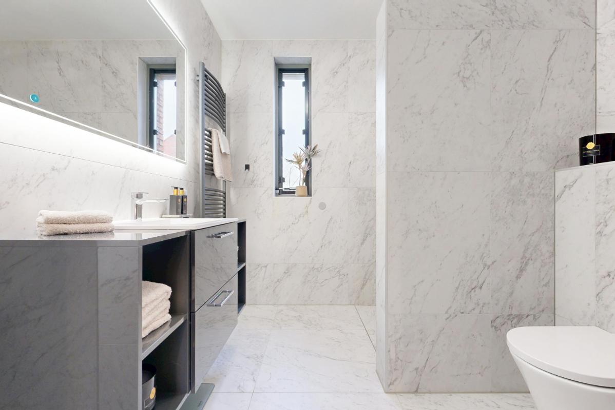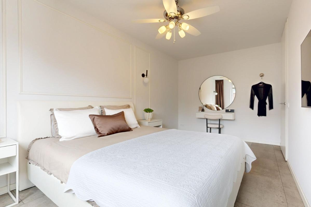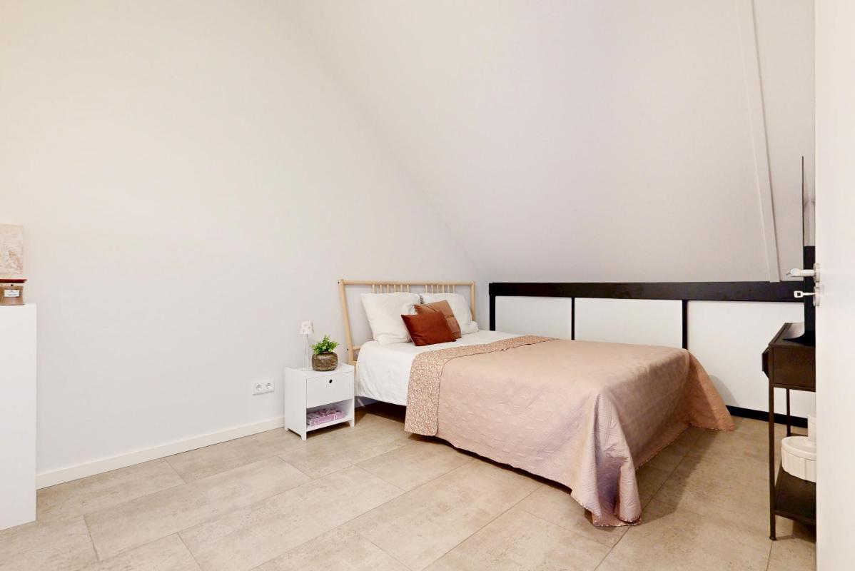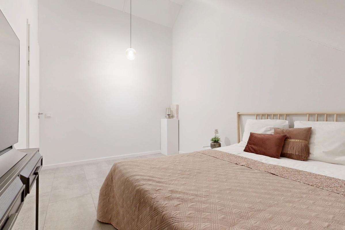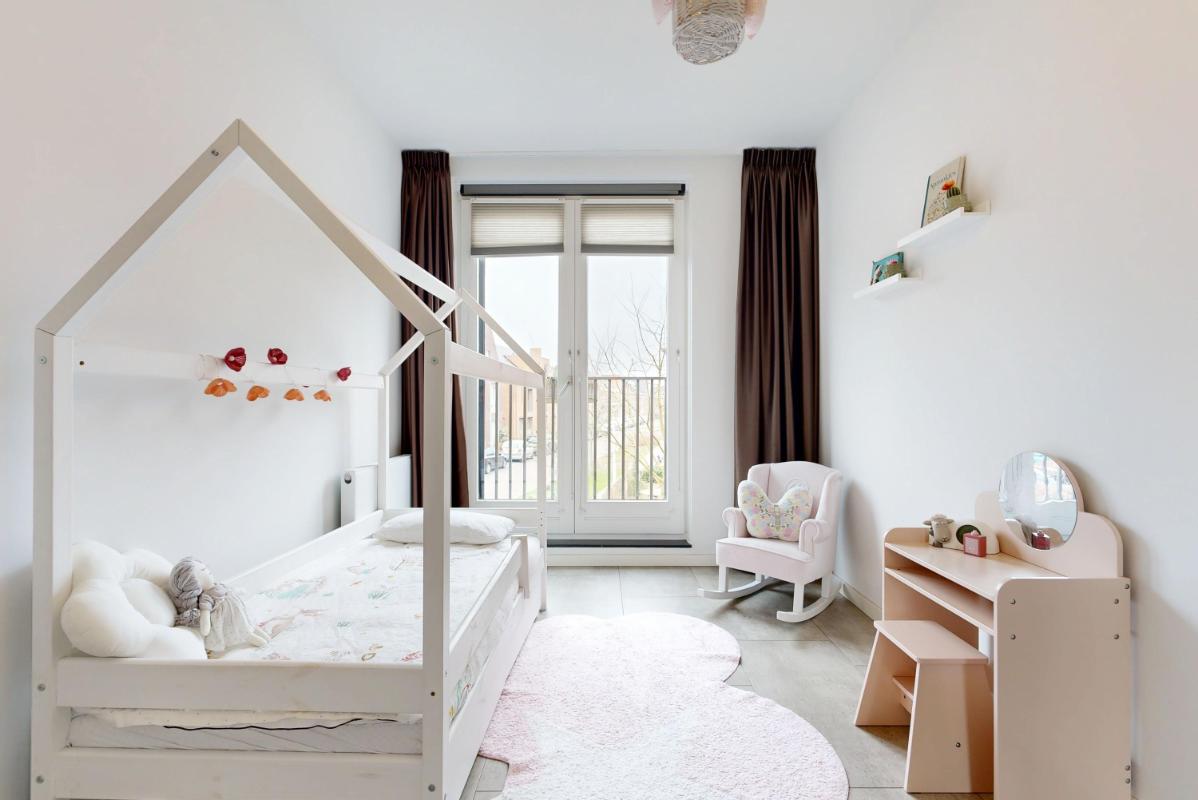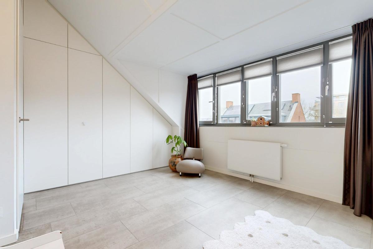 Ook op de eerste verdieping vind je over de gehele verdieping vloerverwarming. Je beschikt hier over een slaapkamer aan de voorzijde met een charmant Frans balkon, de hoofdslaapkamer aan de achterzijde en een derde kamer die momenteel is ingericht als kastenkamer met fraaie, ingebouwde kasten. Ook op deze verdieping valt de strakke afwerking direct op, met netjes afgewerkte wanden en plafonds die zorgen voor een rustige en verzorgde uitstraling. De moderne badkamer is comfortabel ingericht met een inloopdouche, een wastafelmeubel en een zwevend toilet. Dankzij de vloerverwarming en de eigentijdse afwerking is dit een fijne en comfortabele ruimte om de dag te beginnen.