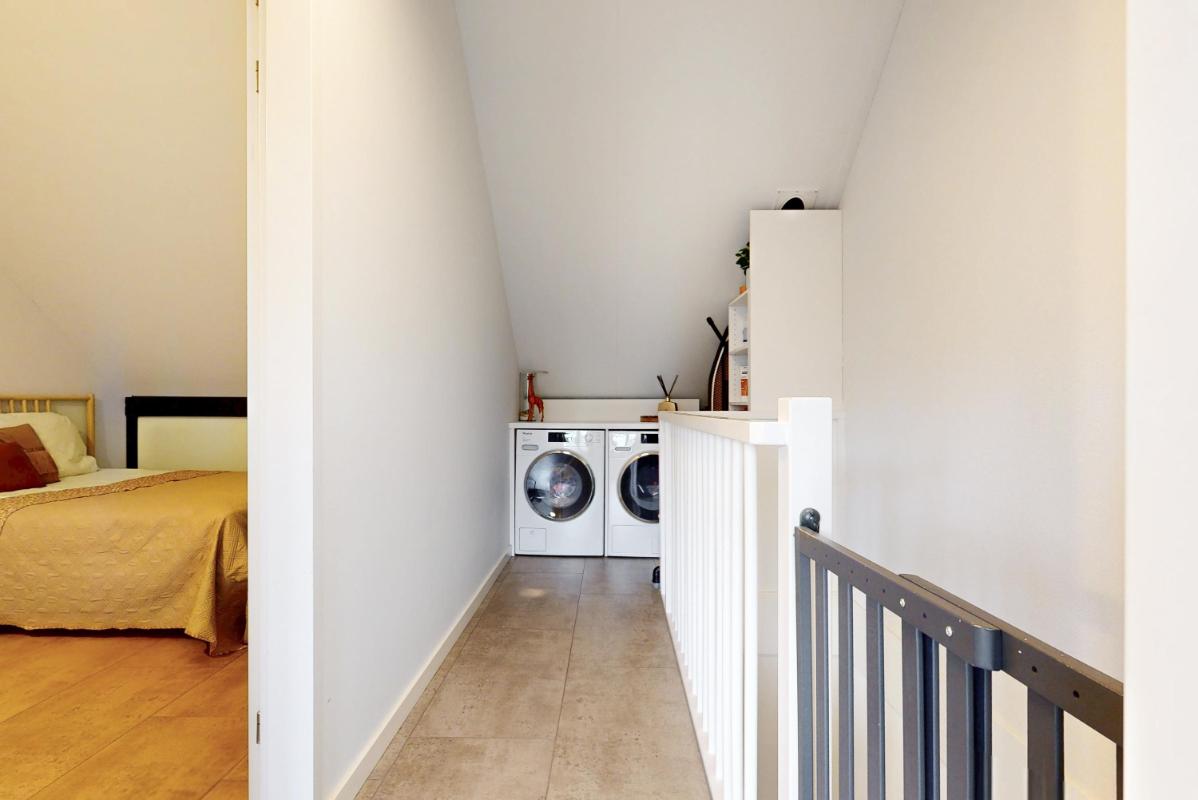 Op de tweede verdieping bevindt zich de overloop met aansluitingen voor de wasmachine en droger. Deze verdieping beschikt over twee slaapkamers: één kamer met dakkapel en op maat gemaakte, ingebouwde kasten, en een tweede kamer aan de voorzijde. Voor deze kamer is reeds een dakkapel besteld, die nog geplaatst zal worden. De dakkapel zorgt straks voor extra licht en ruimte, waardoor ook deze kamer een volwaardige en comfortabele slaapkamer wordt. Achter de knieschotten is bovendien handige bergruimte aanwezig. Met deze verdieping erbij beschikt de woning over maar liefst vijf fijne, royale en volwaardige slaapkamers!
