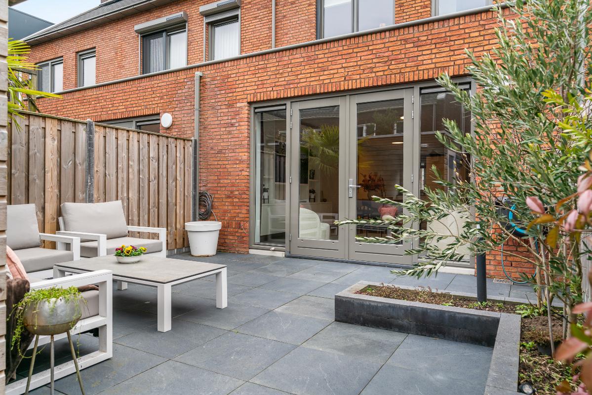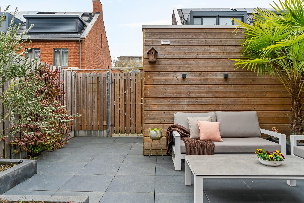 De onderhoudsvriendelijk aangelegde tuin is keurig verzorgd en voorzien van fraaie beplanting. Dankzij het doorkijkje tussen de woningen geniet je van een prettig, open gevoel naar achteren. De tuin beschikt bovendien over een berging en een achterom.