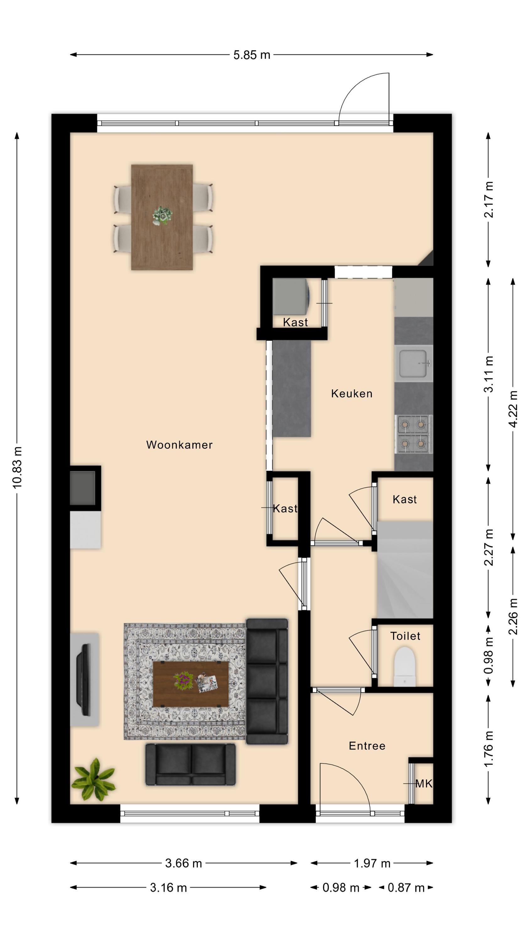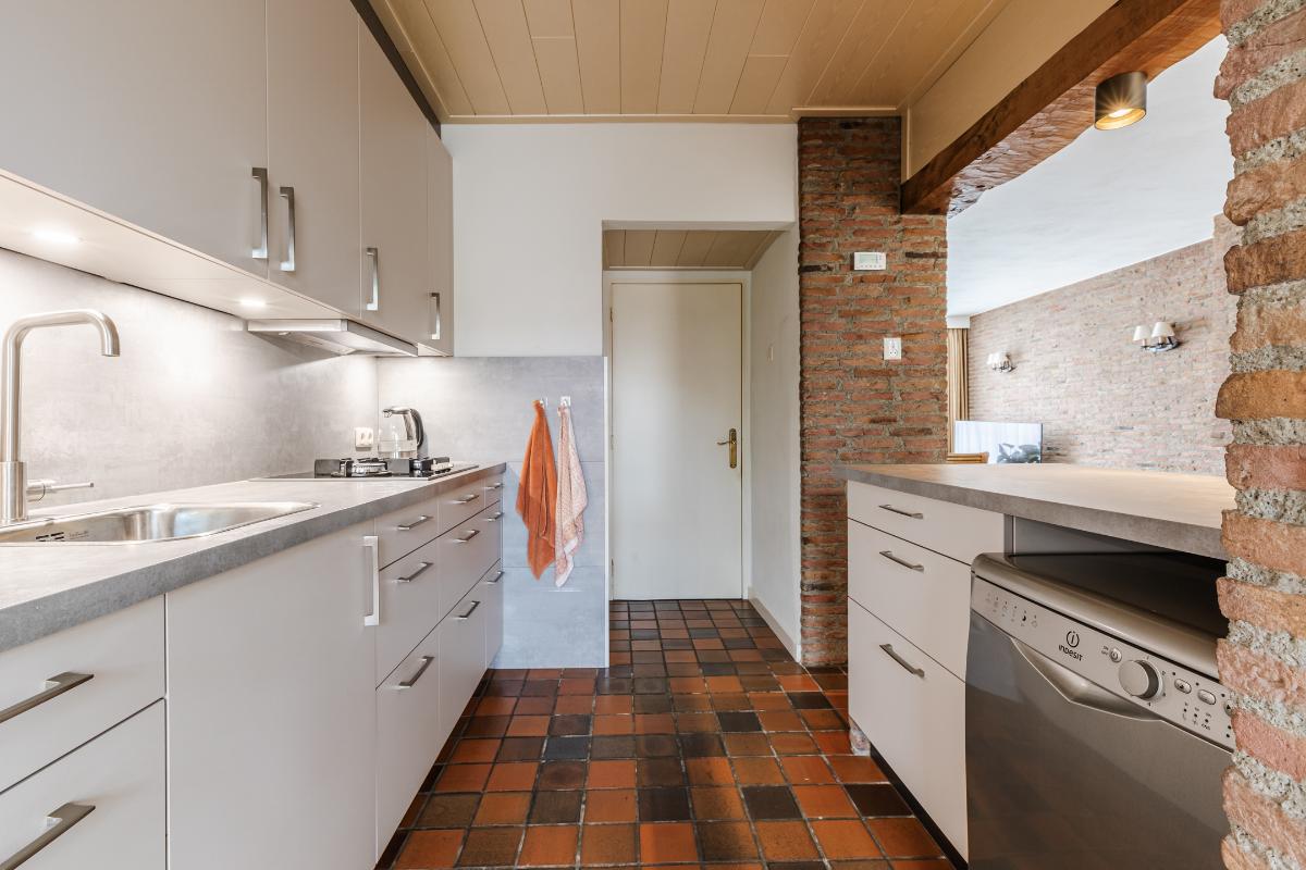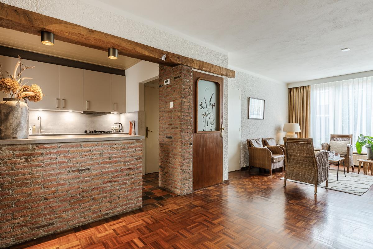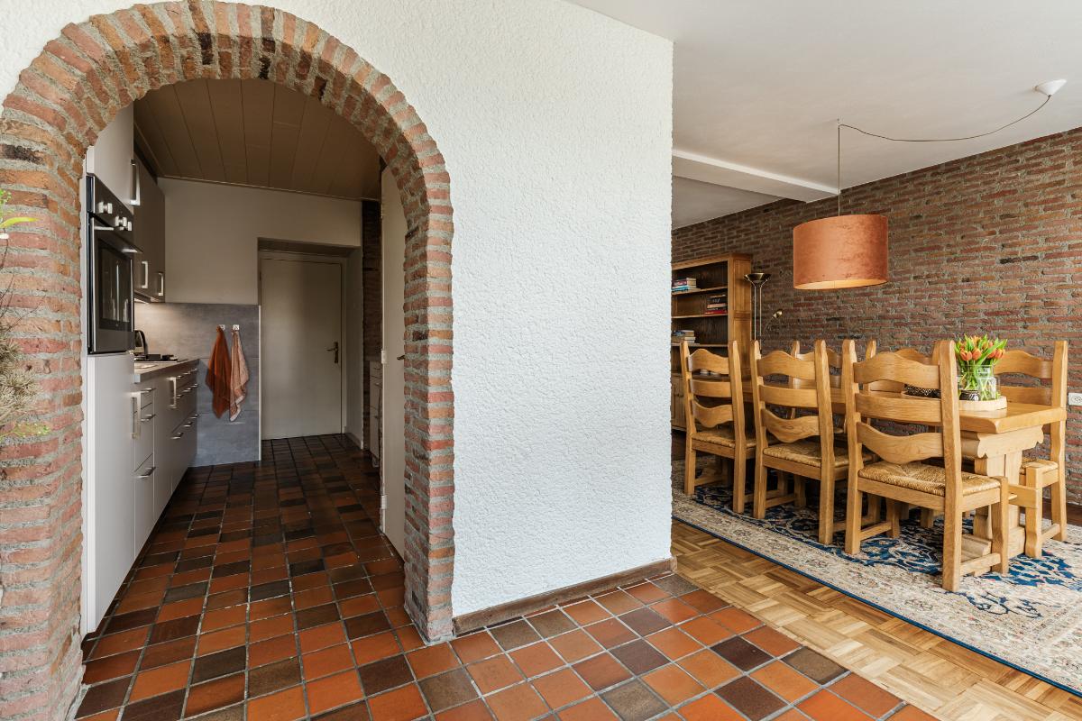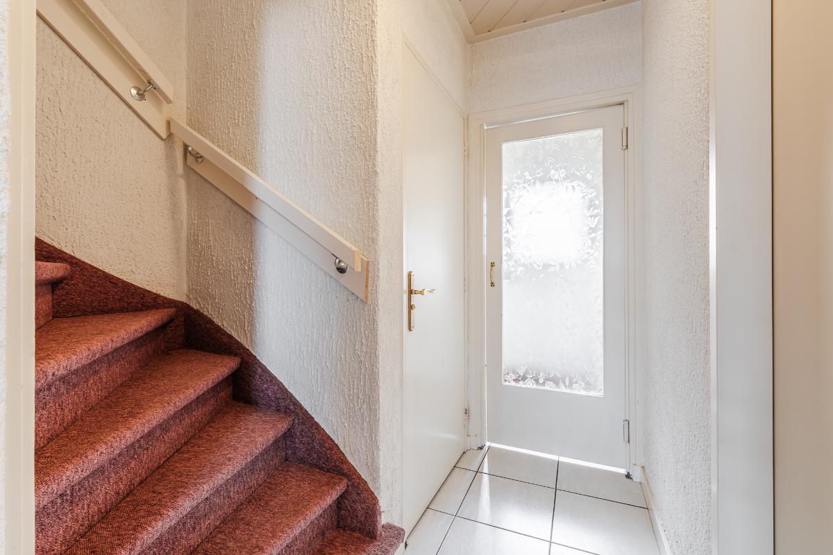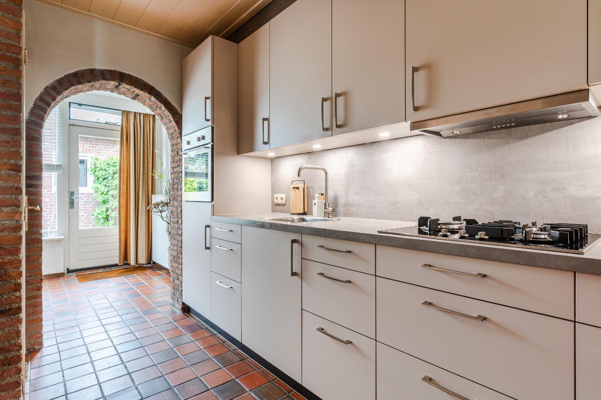 Entree met meterkast. Hal met toilet, trapopgang en toegang tot de woonkamer en keuken. De heerlijk ruime en lichte woonkamer is aan de achterzijde over de volle breedte uitgebouwd. Centraal bevindt zich de nette half-open keuken met een keukeninrichting (2021) in wandopstelling en een extra schiereiland met daarnaast een vaste bergkast.
