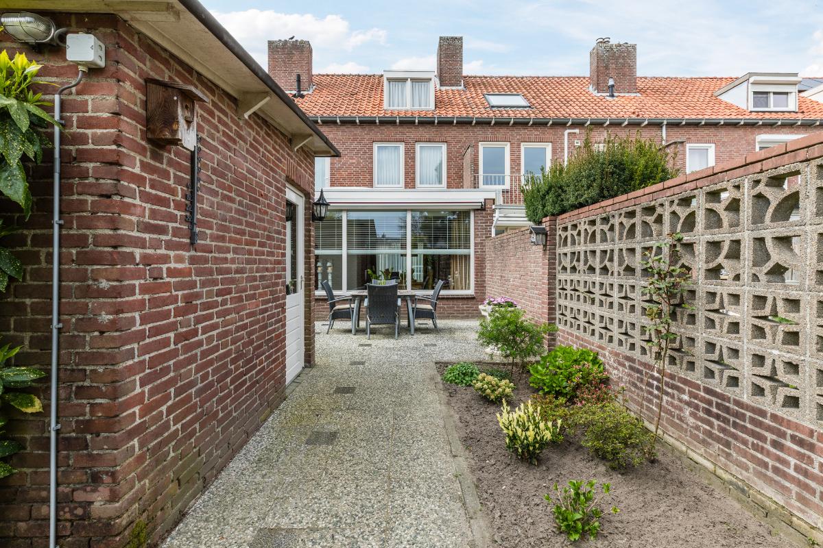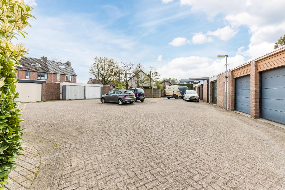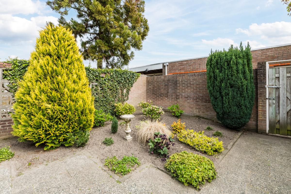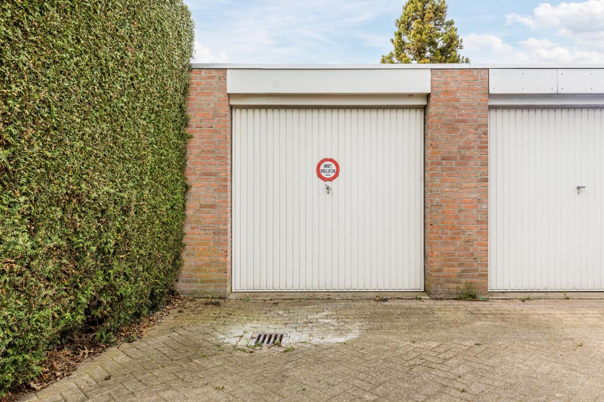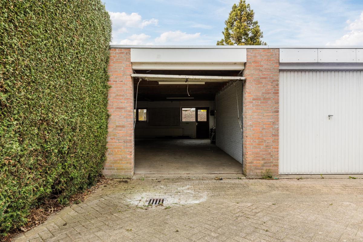 Diepe, op het zuidoosten georiënteerde achtertuin met stenen berging. Aan de achtertuin grenst een pad met direct daarachter de grote garage met kanteldeur grenzend aan het plein.