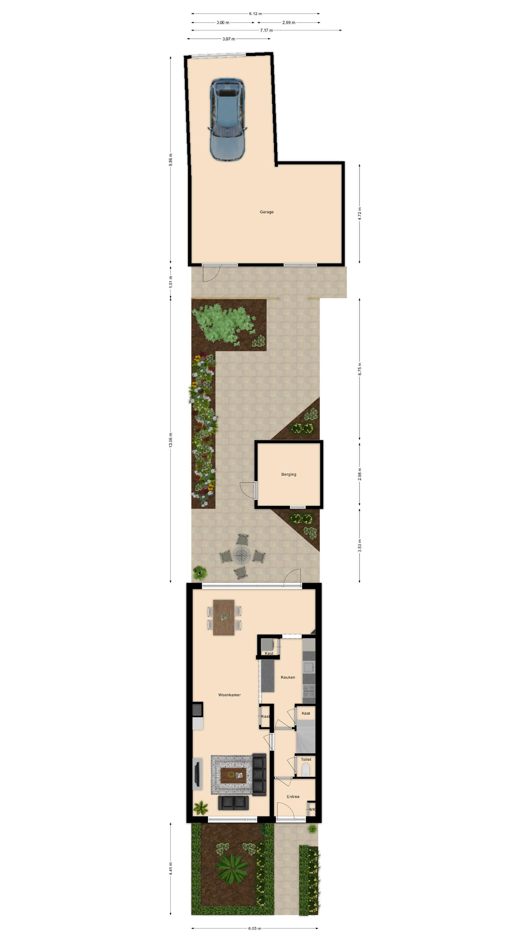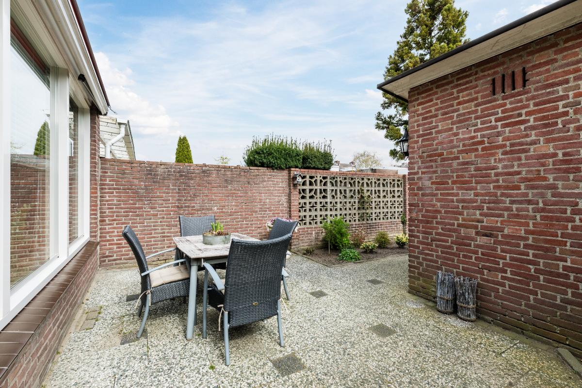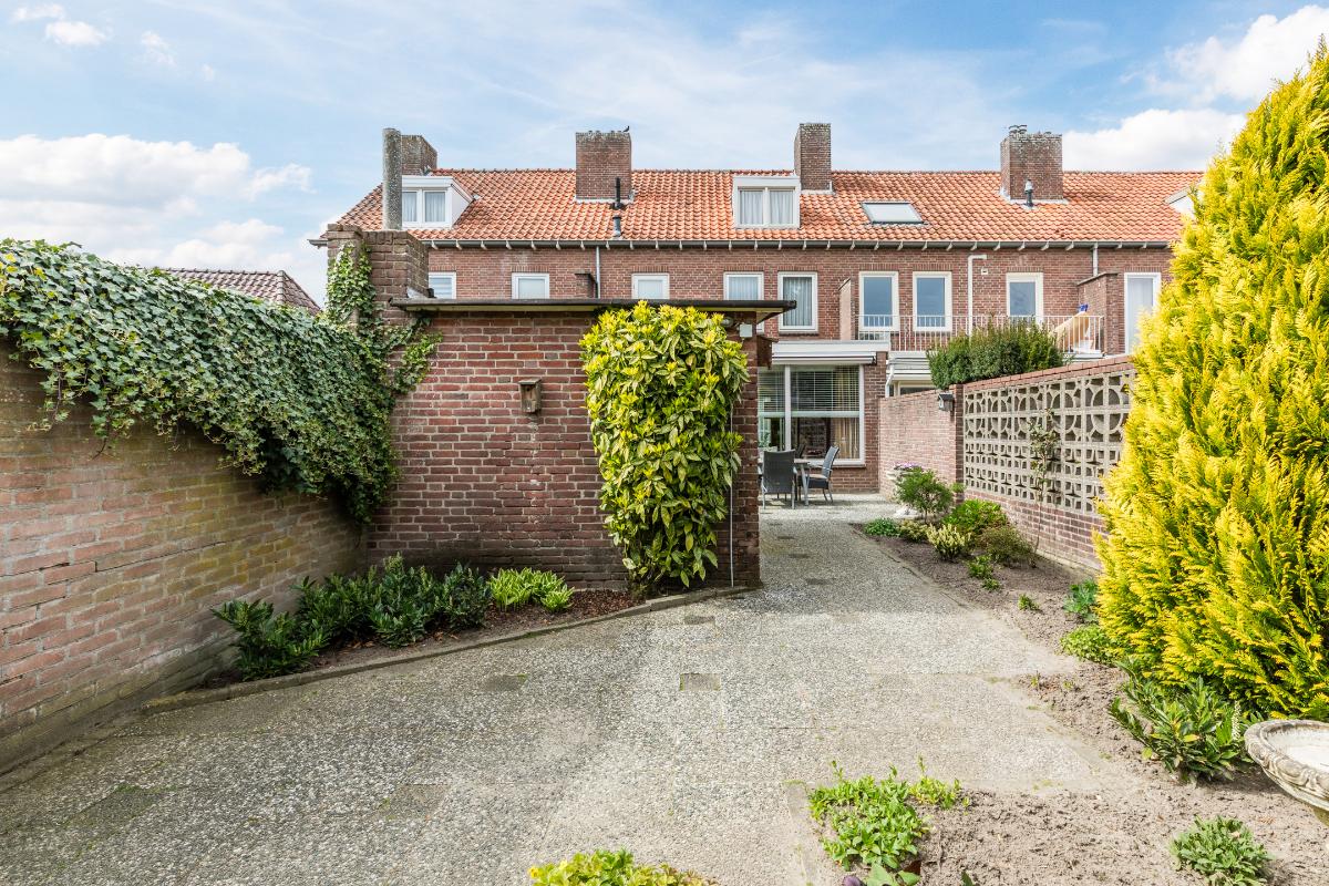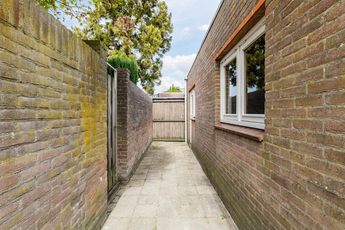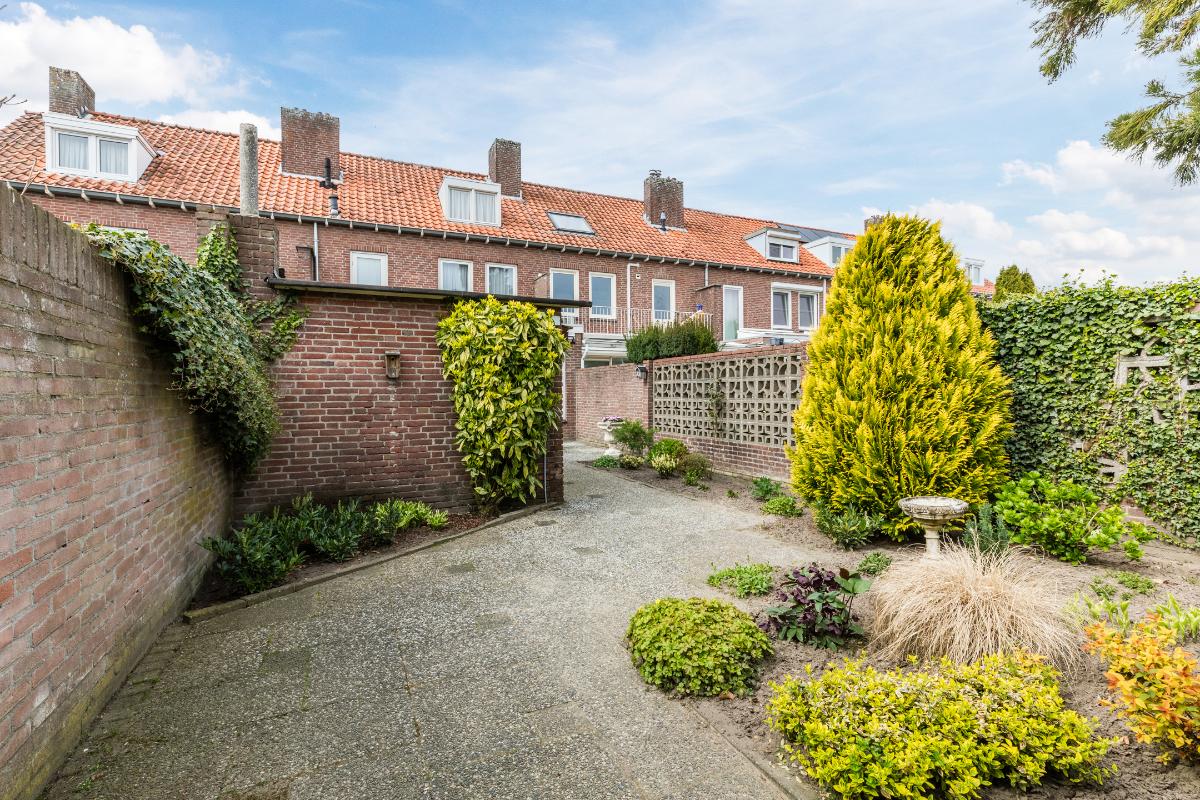 Diepe, op het zuidoosten georiënteerde achtertuin met stenen berging. Aan de achtertuin grenst een pad met direct daarachter de grote garage met kanteldeur grenzend aan het plein.