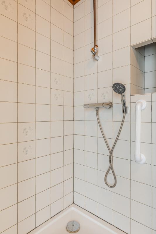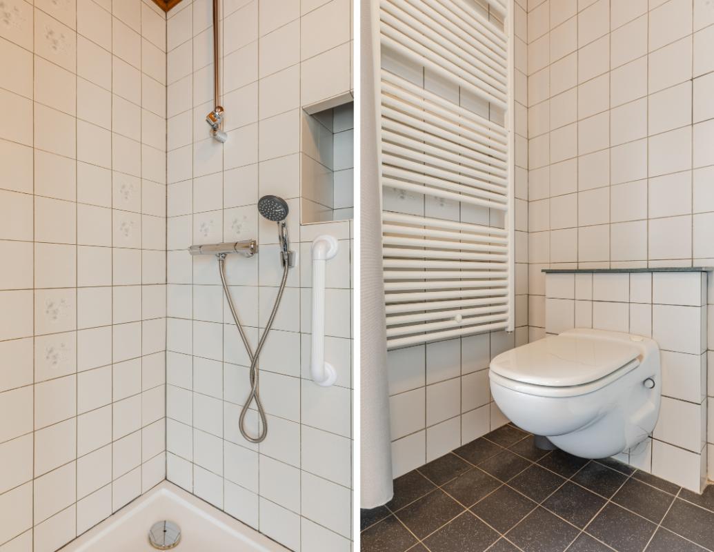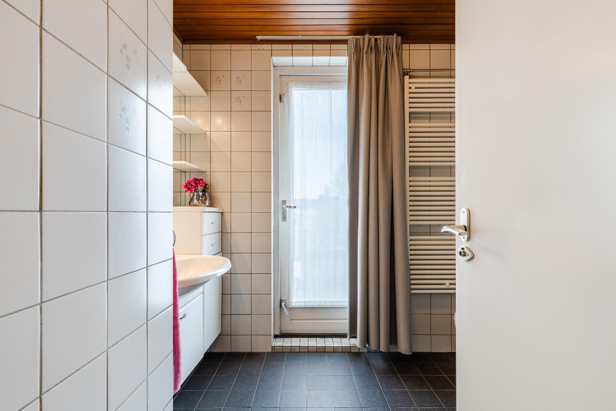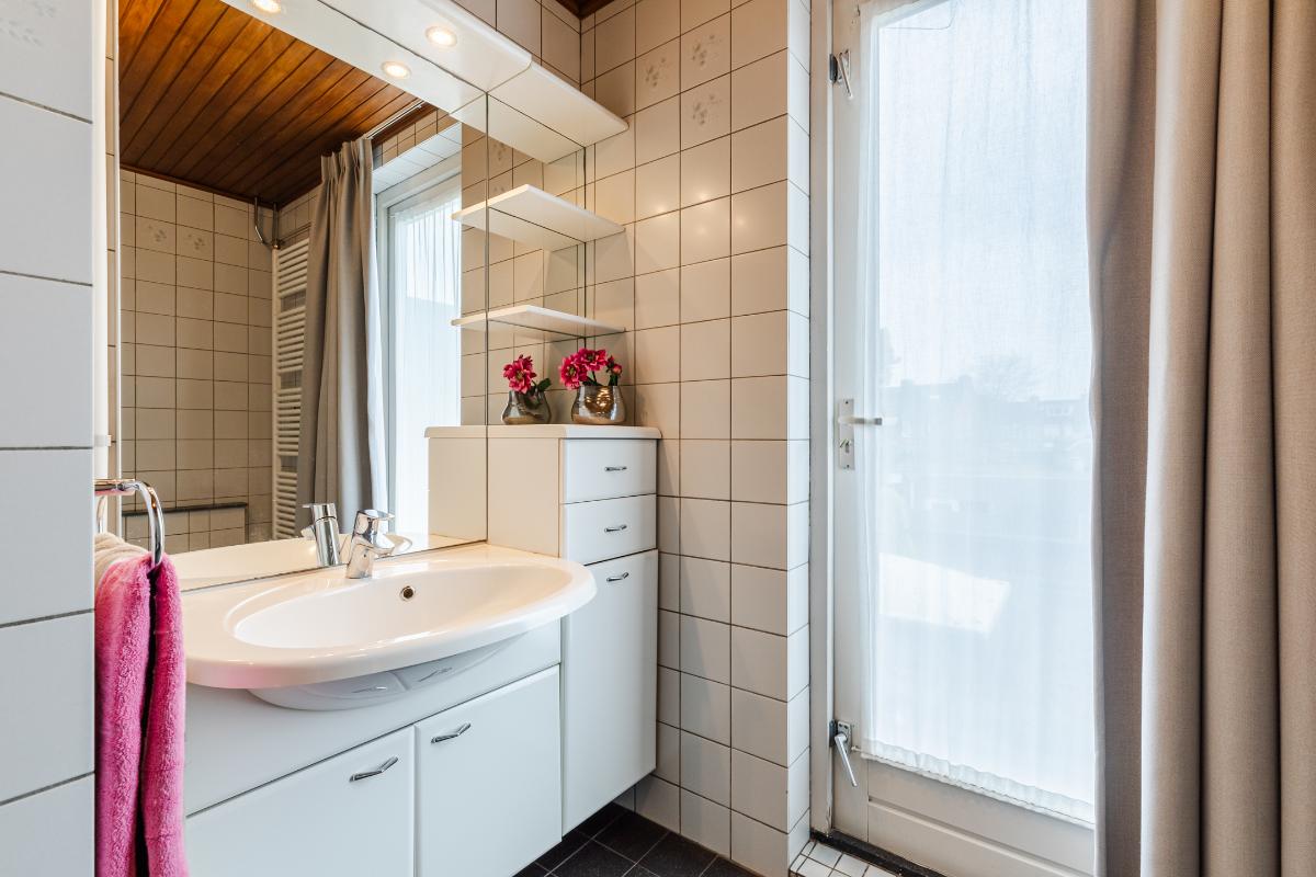 Aan de overloop grenzen drie slaapkamers ( 15 m², 11 m² en 6 m²) en de badkamer. De badkamer is voorzien van een wastafel, toilet en douche.