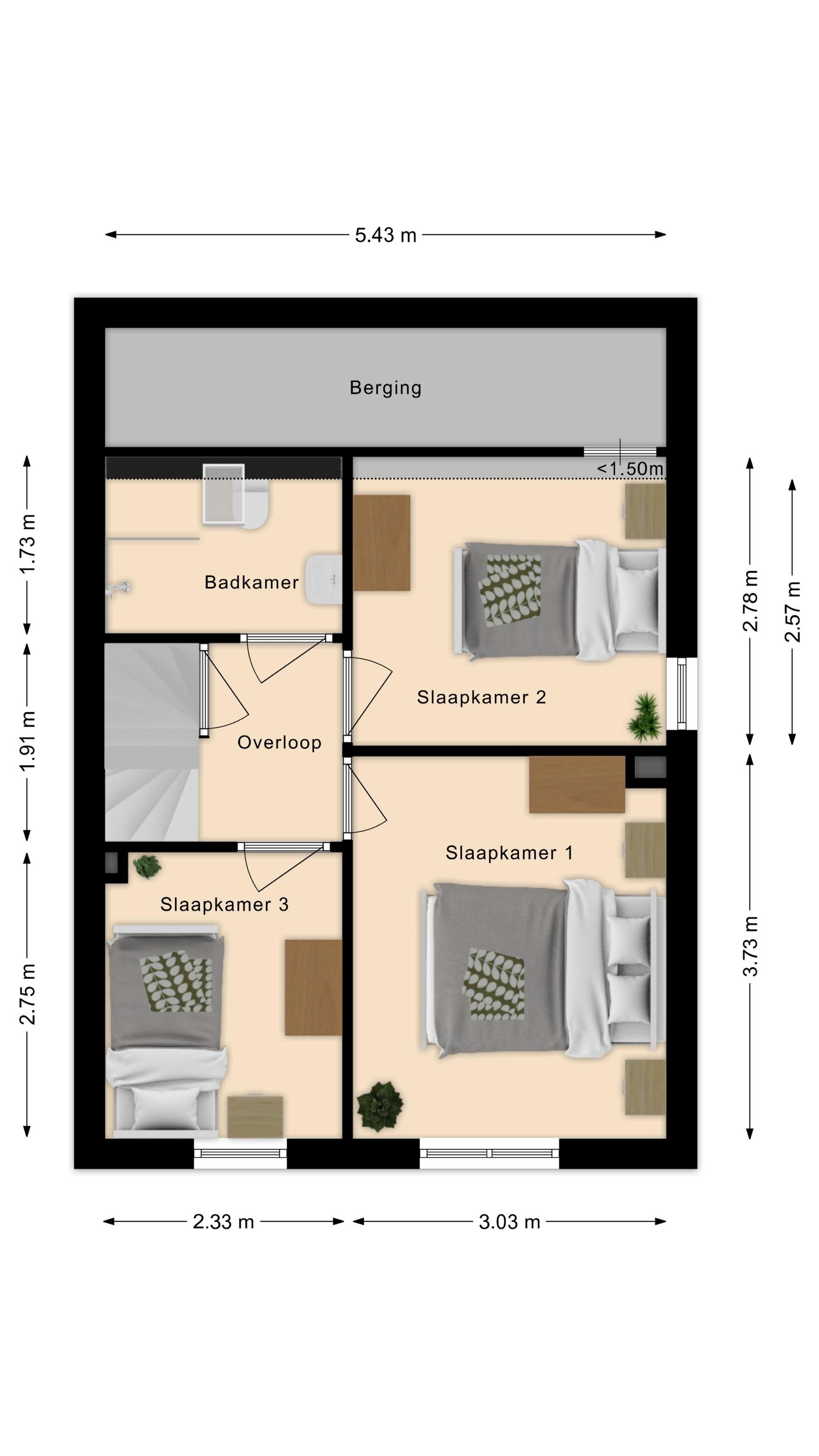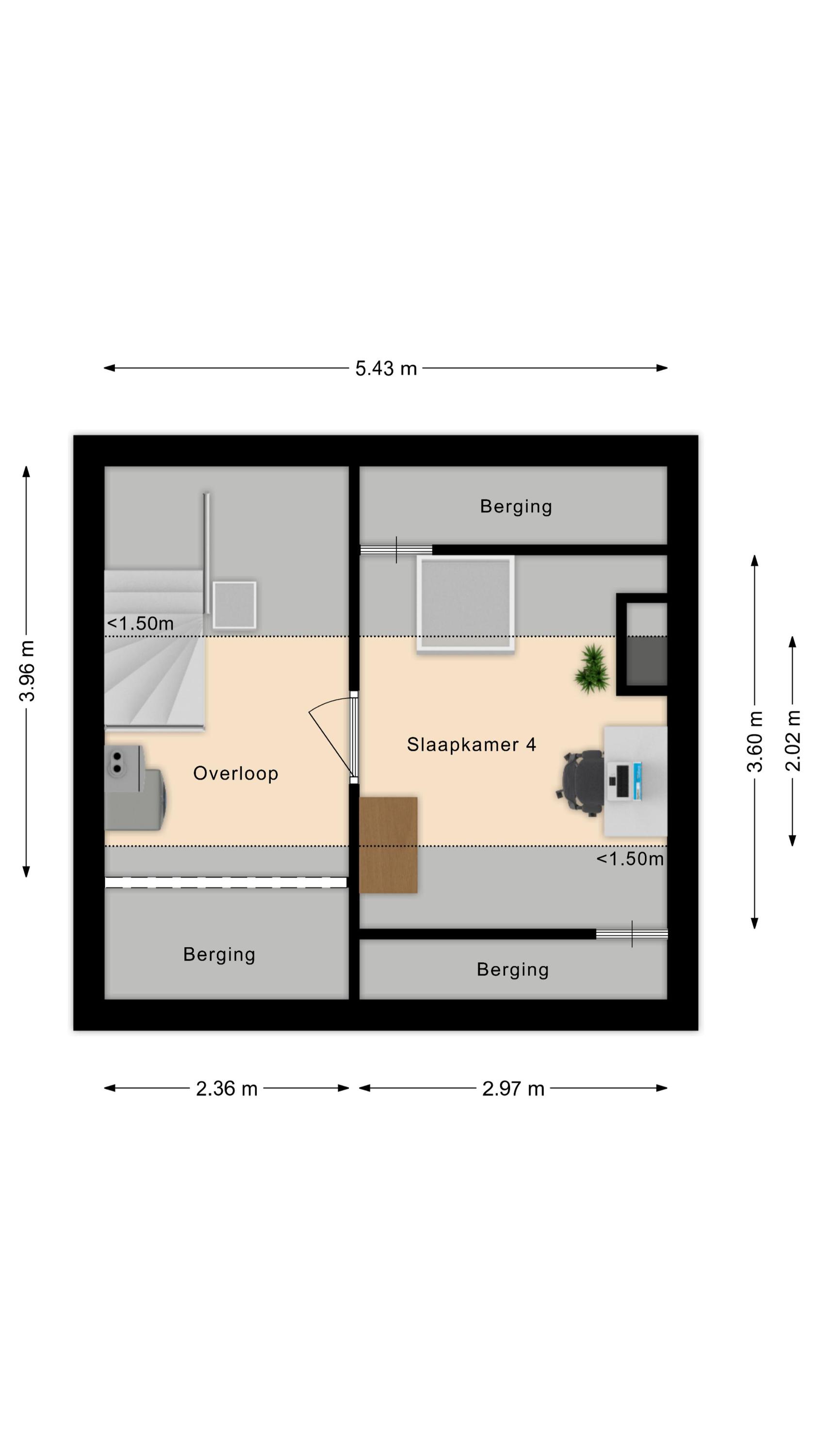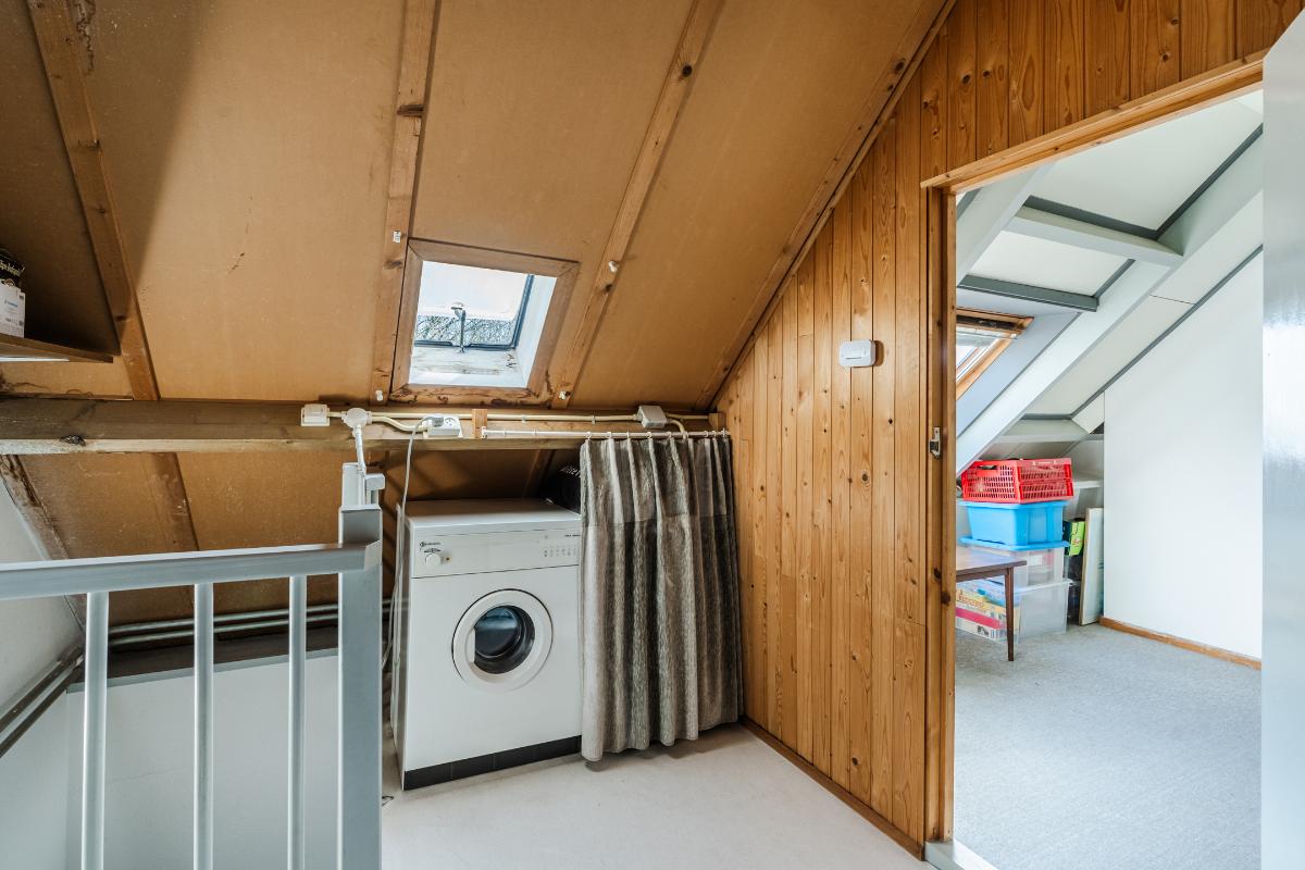 Middels vaste trap bereikbaar. Voorzolder met aansluitingen wasapparatuur en opstelling cv-combiketel. Extra zolderkamer welke eventueel te gebruiken is als kleine extra slaapkamer.