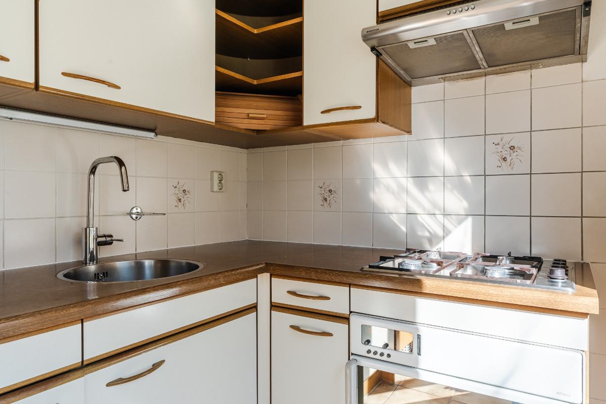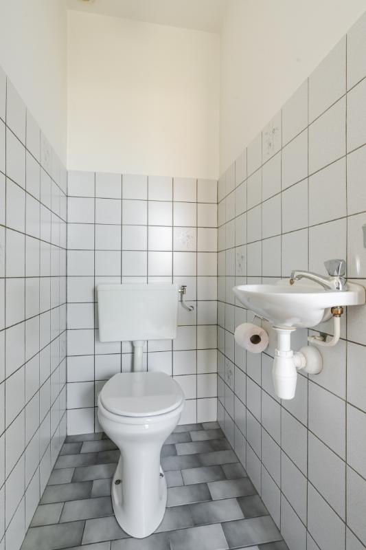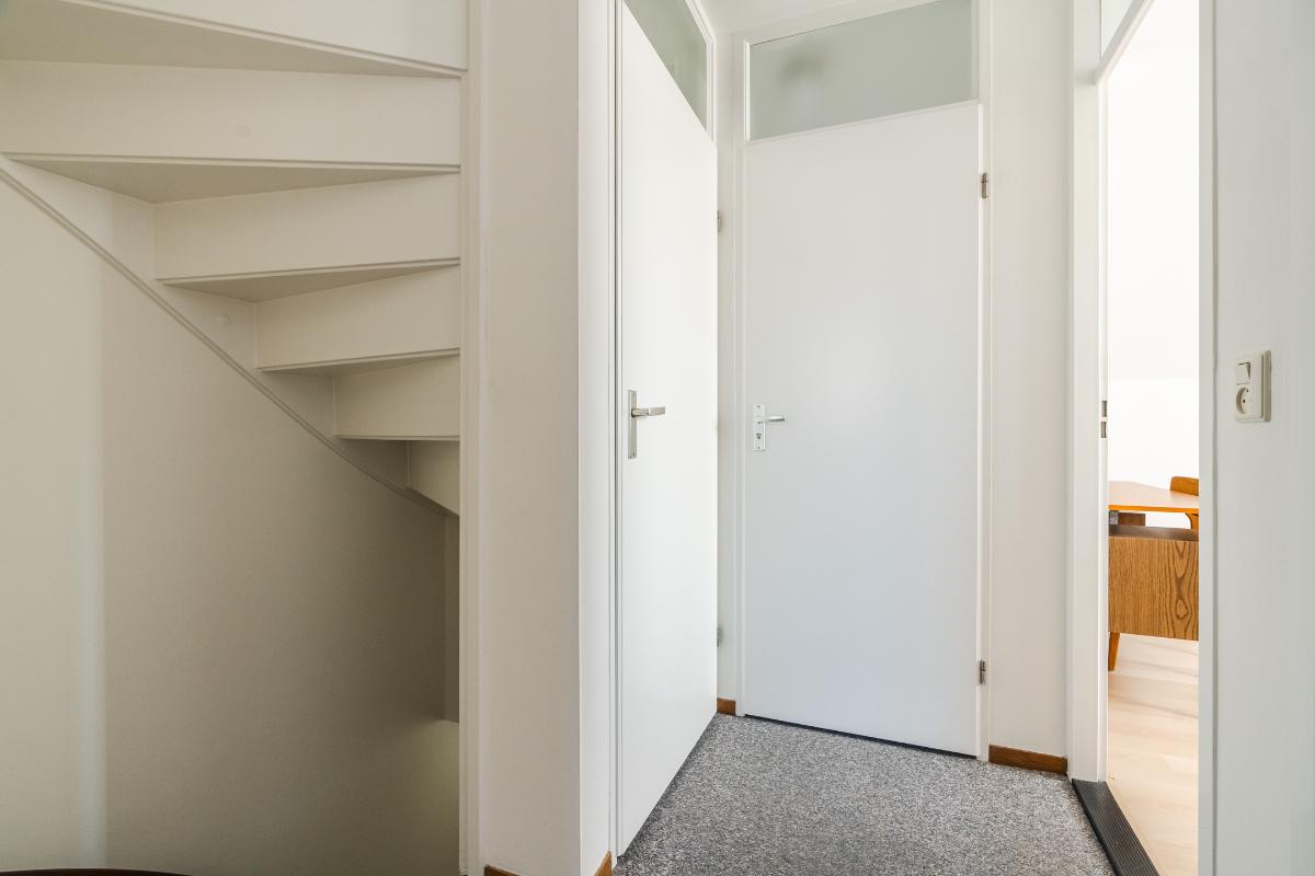 Hal met meterkast en toiletruimte. Binnenkomst in woonkamer die extra lichtinval geniet door het zijraam. Geen directe overburen en geen bebouwing aan de achterzijde dus veel privacy. Aan de achterzijde bevindt zich een eenvoudige open keuken met toegang tot de tuin. Vanuit de woonkamer toegang tot een trapkast en trapopgang.