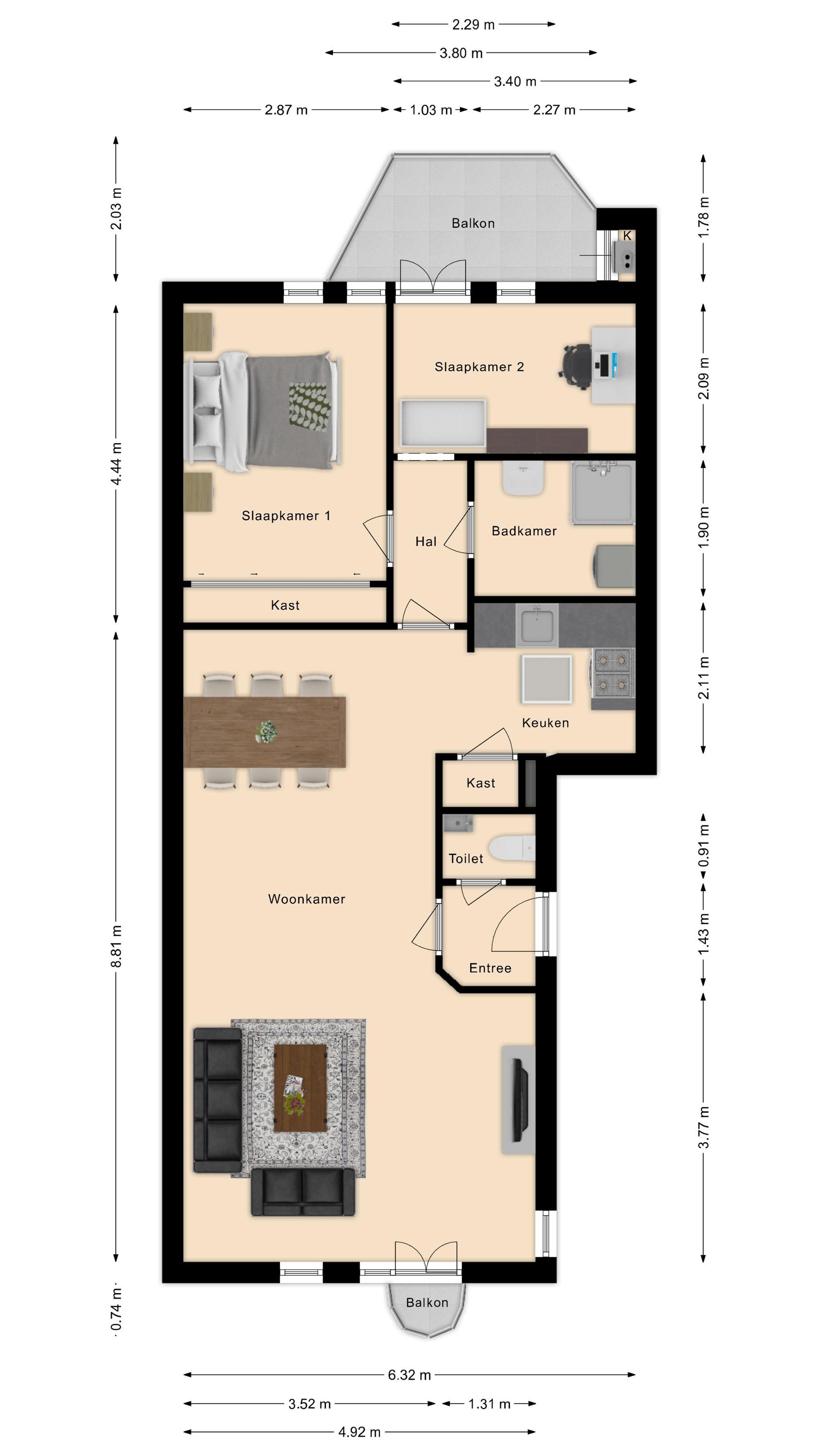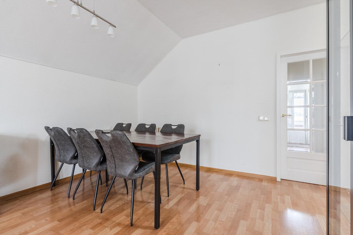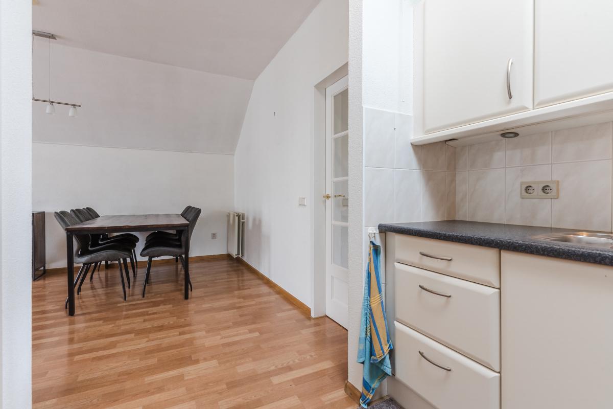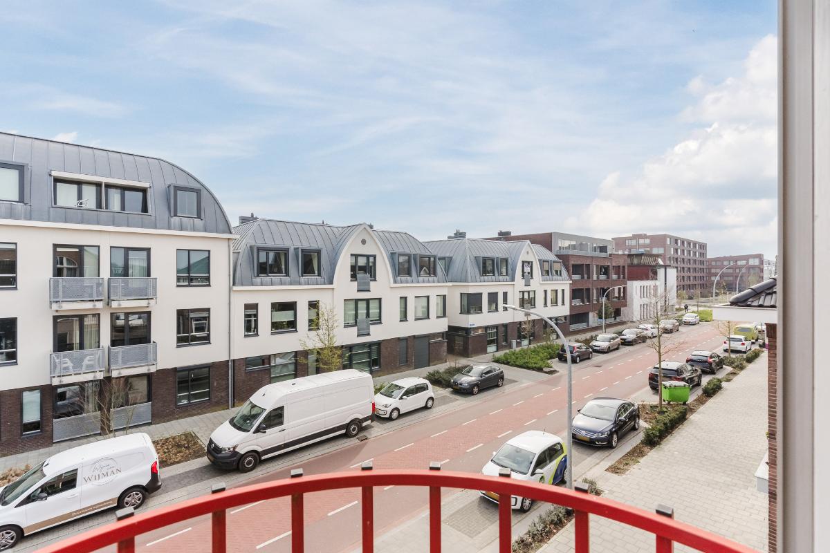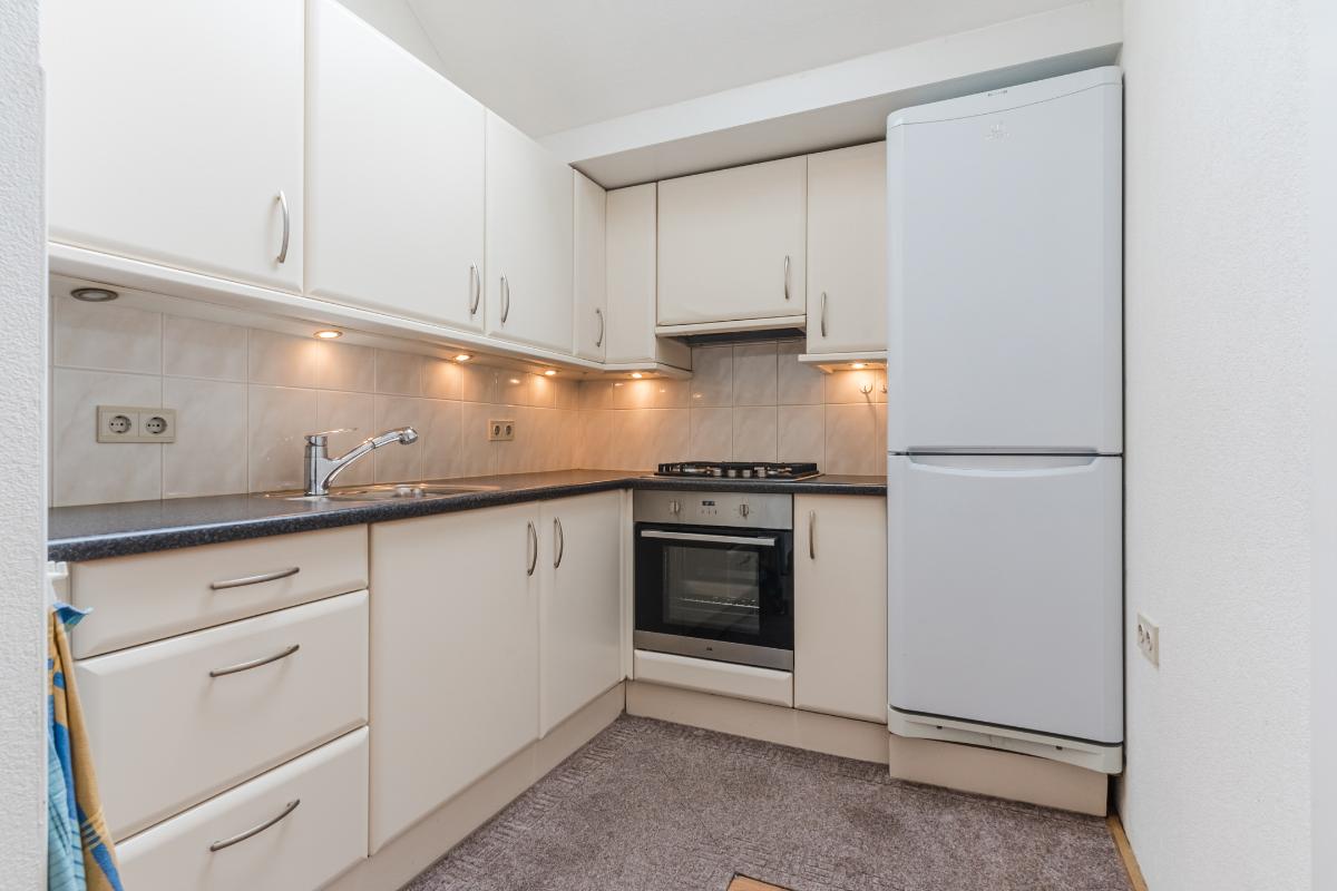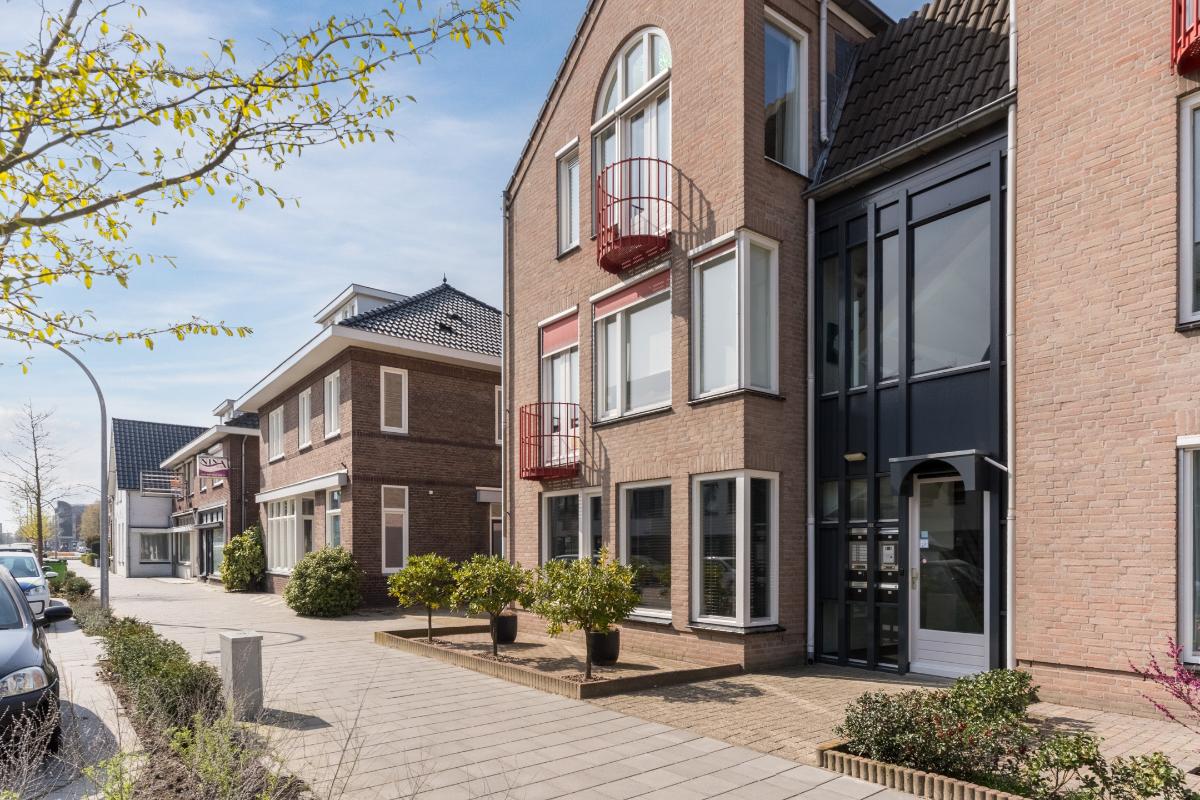 Appartement (tweede verdieping): Aan de algemene portiek, met toegang tot slechts twee appartementen bevindt zich de voordeur. Hal met meterkast en het geheel betegelde toilet met fonteintje. Binnenkomst in woonkamer waar de relatief grote woonkamer direct opvalt. Ook is er veel licht en een leuk uitzicht over de Eindhovenseweg. De halfopen keuken heeft een keurige inrichting in hoekopstelling welke is uitgerust met een koel-/vriescombinatie, oven, afzuigkap en 4-pits gaskookplaat. Daarnaast is er een praktische provisiekast.