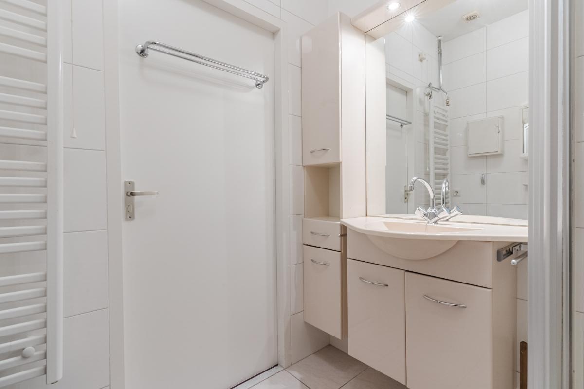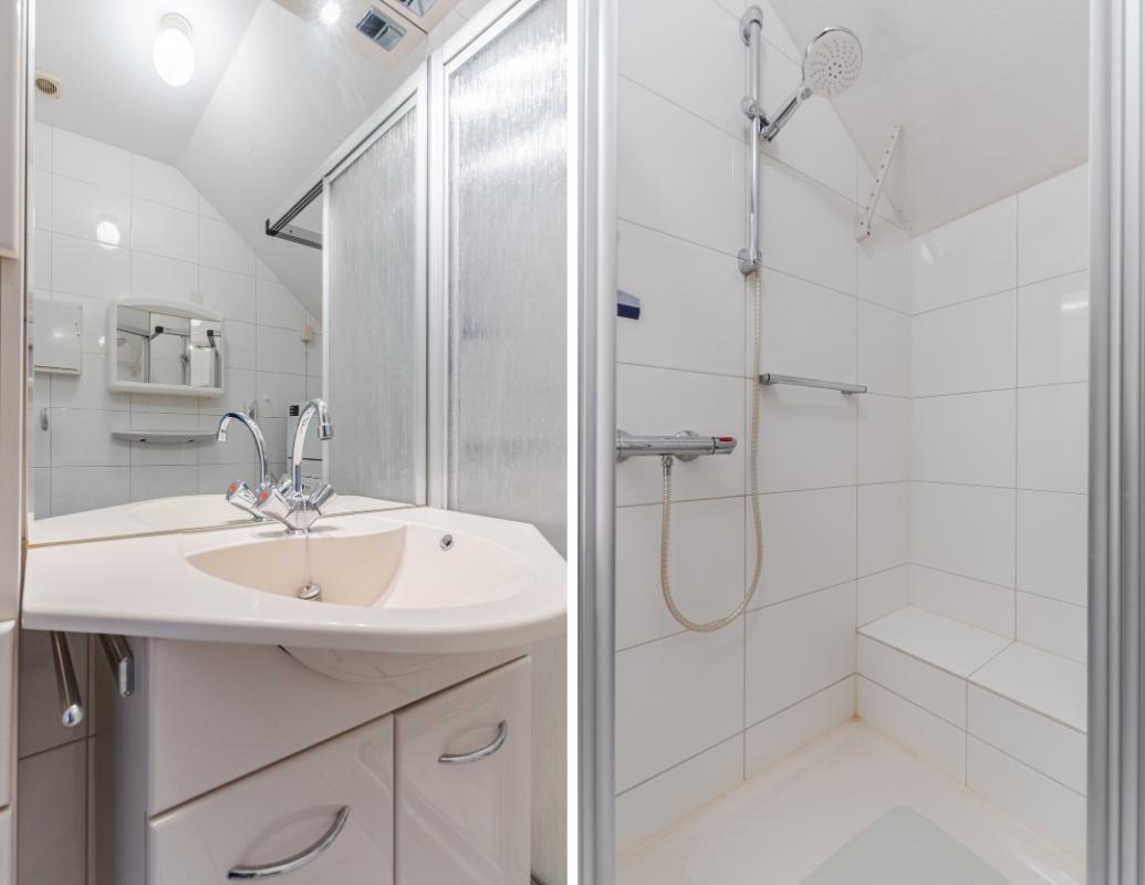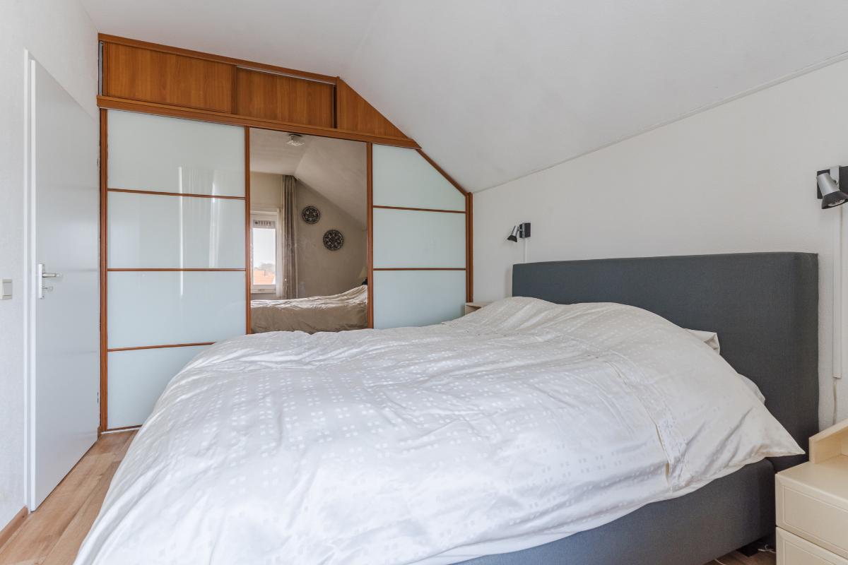 Aan de achterzijde liggen de beide slaapkamers en de badkamer. De gemoderniseerde badkamer is ingericht met een douche en een badmeubel met wastafel. De slaapkamers hebben afmetingen van 4.43 x 2.86 en 3.40 x 2.09. Vanuit de kleinste slaapkamer is het balkon op het westen bereikbaar met afsluitbare kastruimte voor de opstelling van de cv-combiketel.