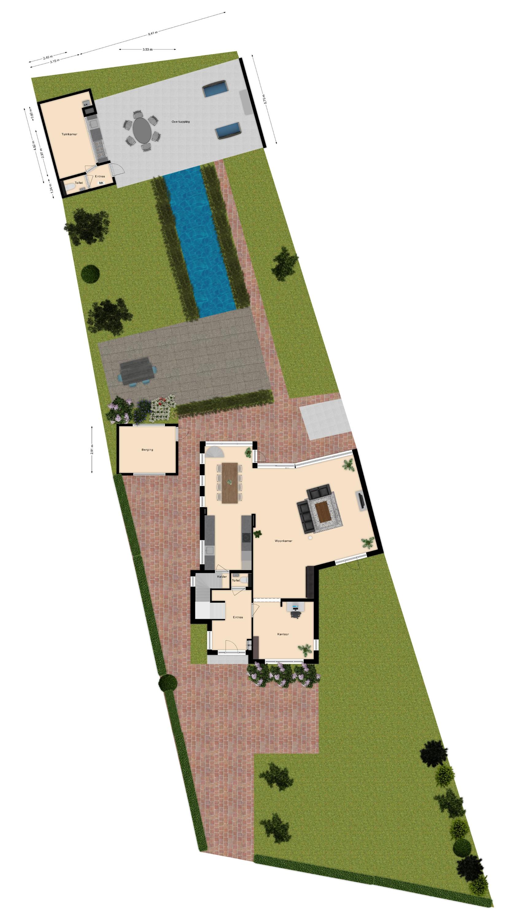 Het perceel van 781 m² is fraai aangelegd met een vijverpartij, gazon en volwassen beplanting die veel privacy bieden. Achterin de tuin vind je een onder architectuur gerealiseerd bijgebouw: een stijlvol overdekt terras met buitenkeuken, haardpartij en multifunctioneel bijgebouw met toiletruimte. Een heerlijke plek om lange zomeravonden door te brengen met zicht op de tuin en de markante achtergevel. Aan de voorzijde is parkeergelegenheid voor meerdere auto’s aanwezig, inclusief oplaadpunt.