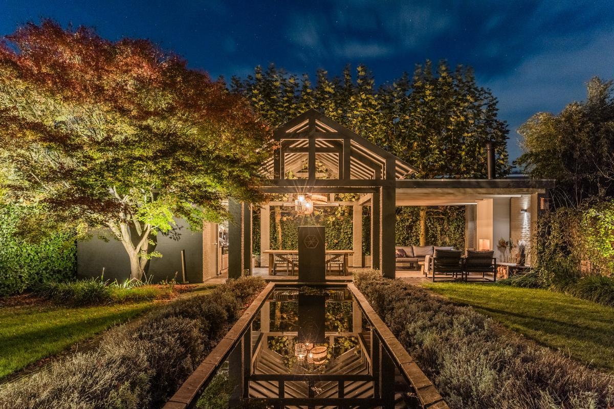 Voortuin met parkeergelegenheid voor meerdere auto's en oplaadpunt. De achtertuin biedt veel privacy en is schitterend aangelegd met onder andere een vijverpartij, gazon en diverse volwassen bomen en beplanting. Achterin bevindt zich een onder architectuur gerealiseerd bijgebouw bestaande uit een terras met buitenkeuken en een multifunctionele ruimte met toilet. Het terras, voorzien van haardpartij is een heerlijke plek om te genieten van het buitenleven tot in de late avond met een fraai uitzicht over de tuin en de markante achtergevel.