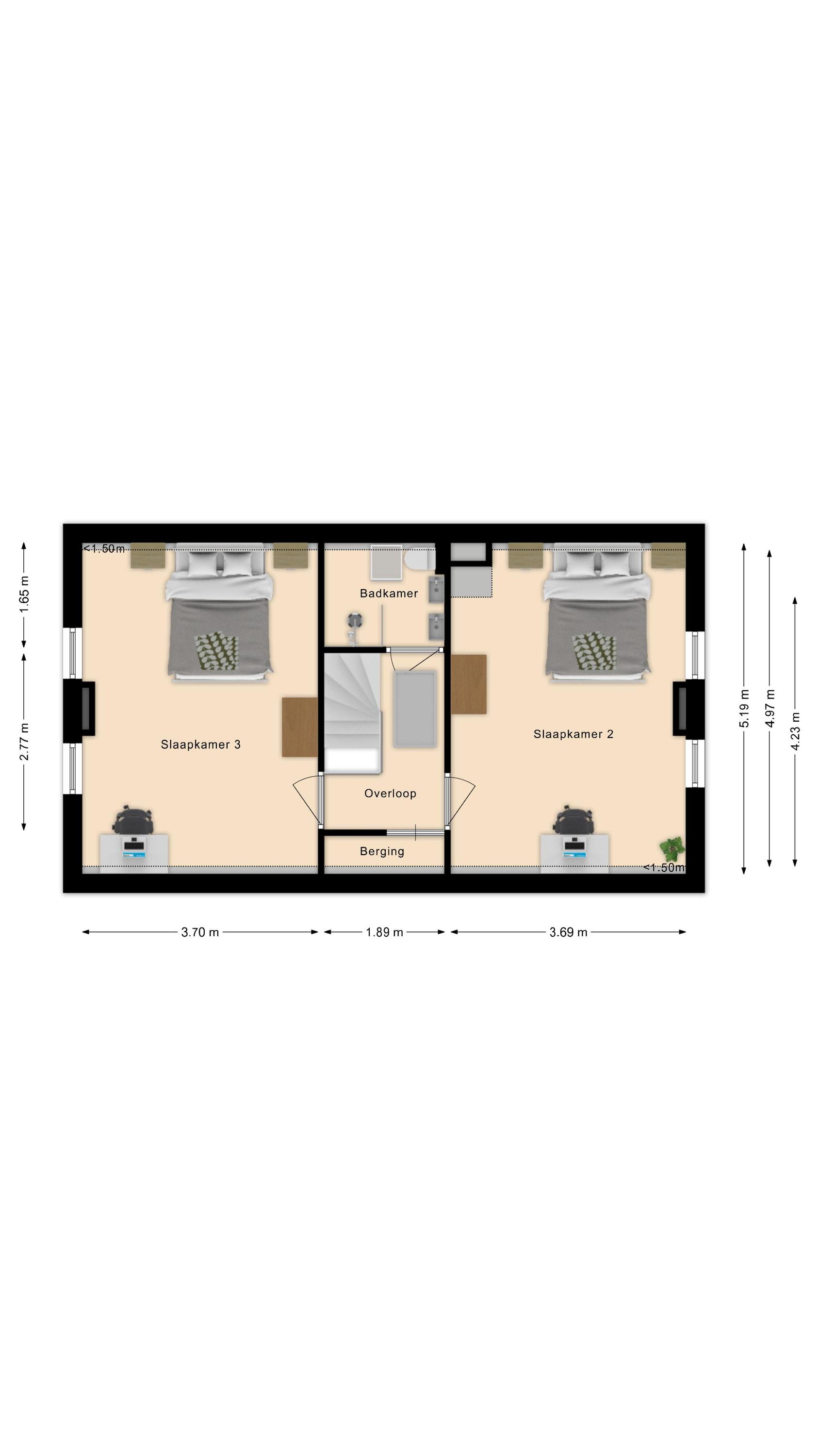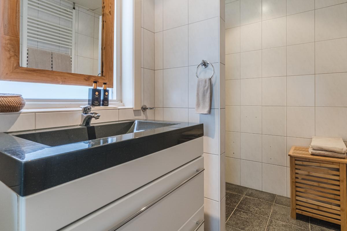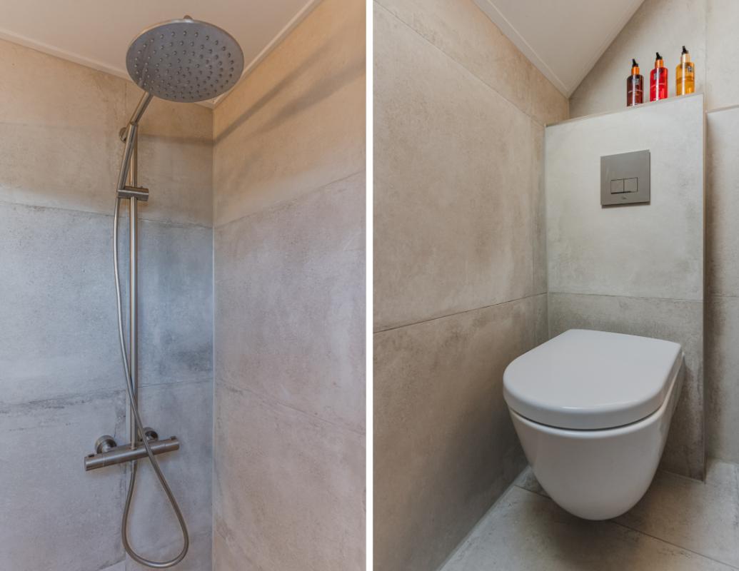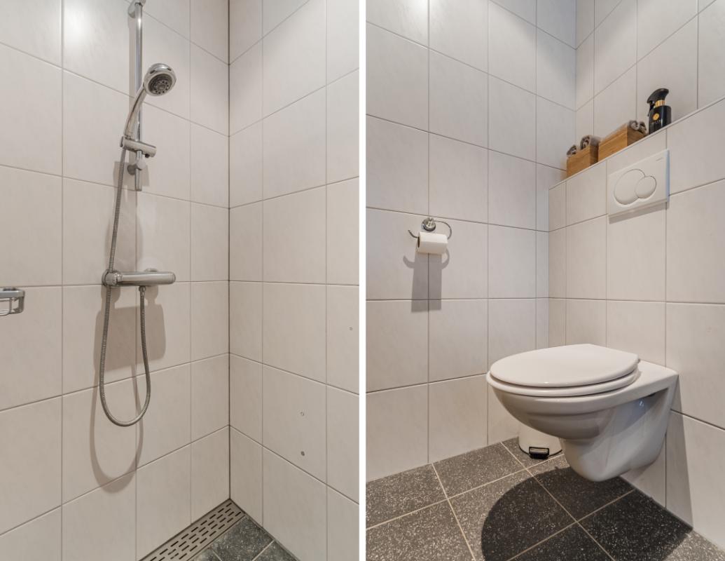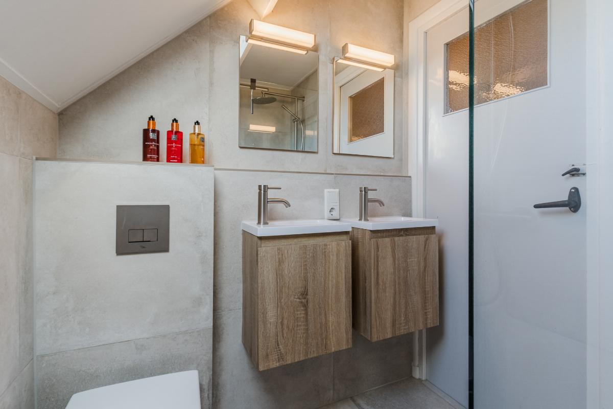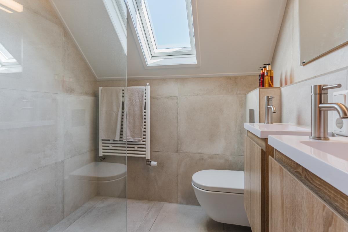 1e verdieping: Overloop naar 2 zeer royale slaapkamers en de luxe 2e badkamer met inloopdouche, 2e toilet (wandcloset) en dubbele wastafel met badmeubel. Beide slaapkamers hebben bergruimtes in de dakschuintes.