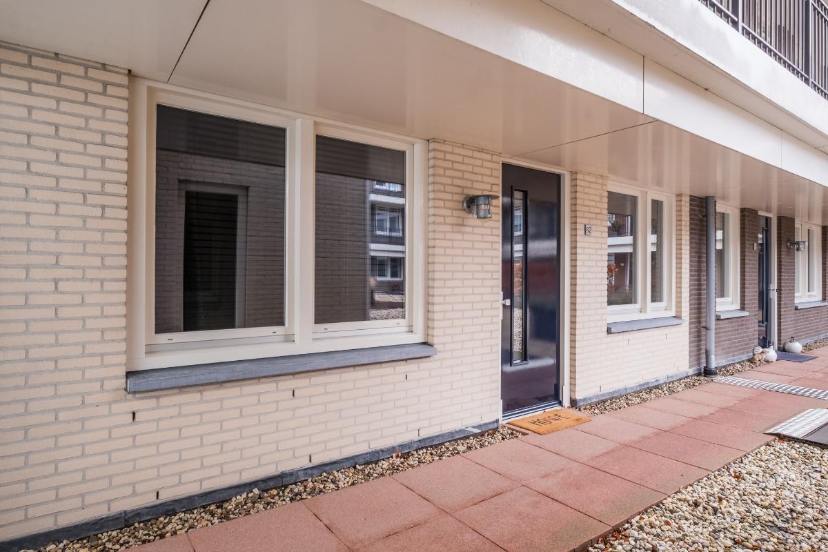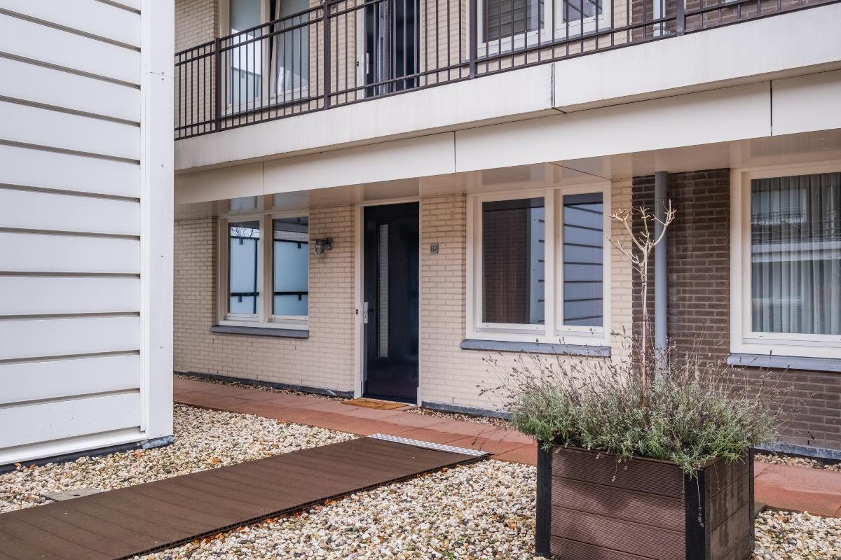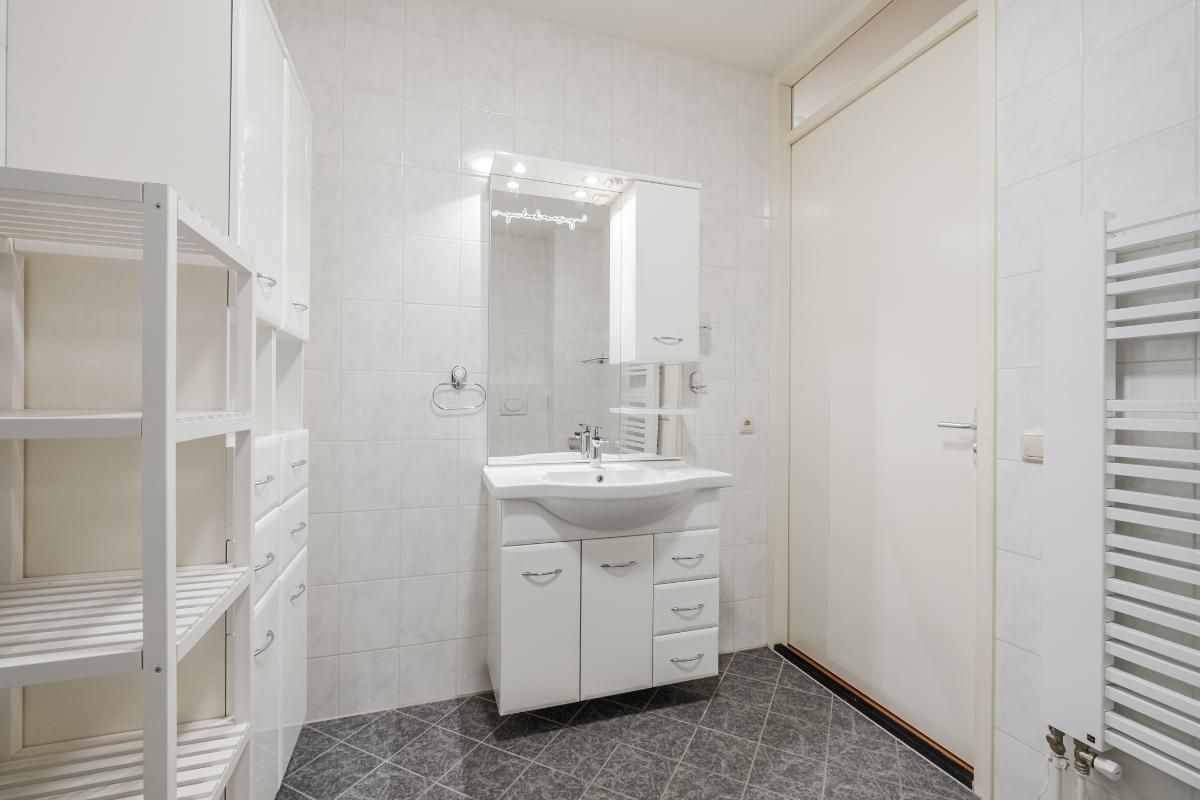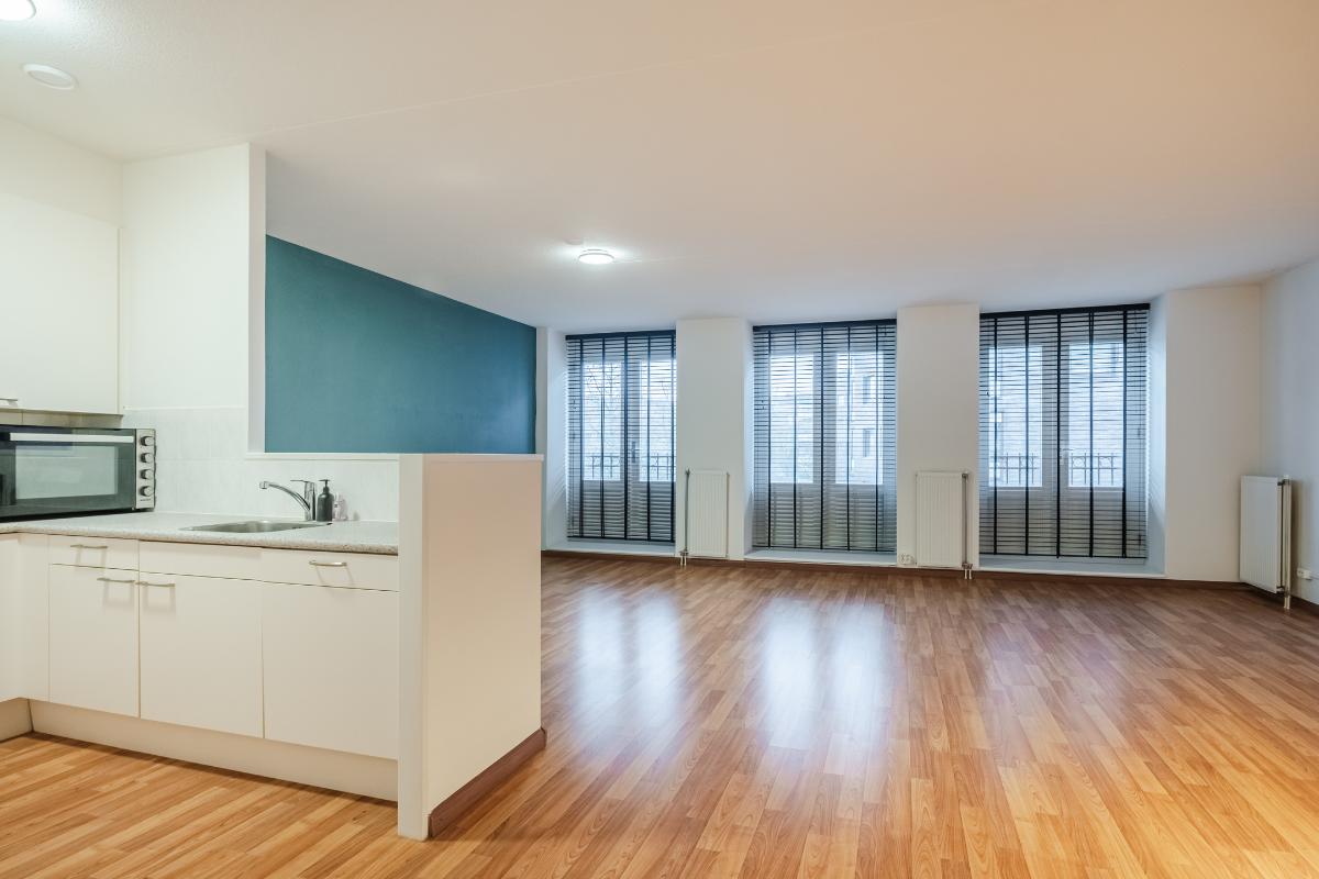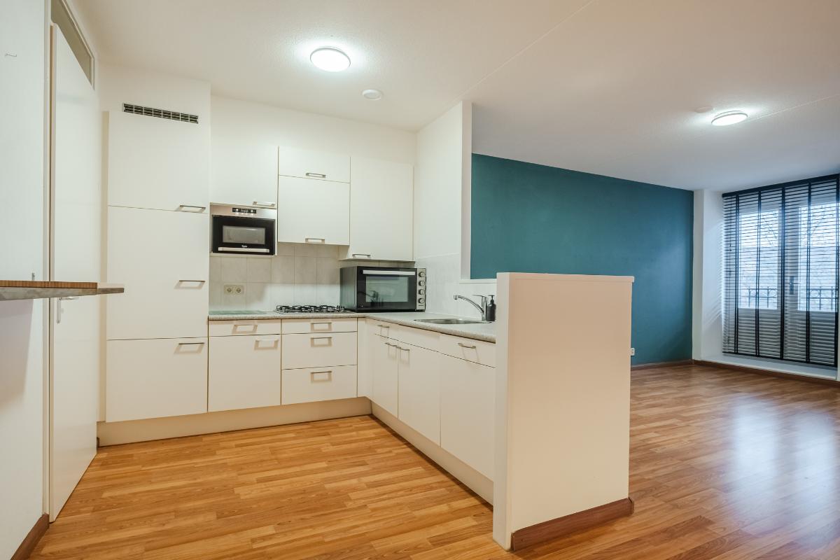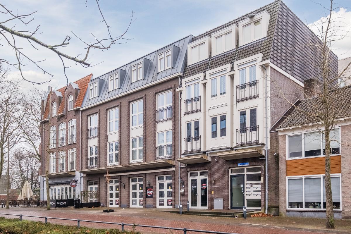 Appartement (eerste verdieping): Binnenkomst in de hal die toegang geeft tot twee slaapkamers aan de rustige achterzijde met zicht op de mooi aangelegde binnentuin. Daarnaast een separate toiletruimte met wandcloset en fonteintje en een volledig licht betegelde badkamer met douche, wandcloset en wastafel in meubel. Voorts de royale woonkamer (plm. 45 m²) met open keuken, laminaatvloer (doorgelegd in het hele appartement) en veel natuurlijk licht door een drietal grote ramen aan de voorzijde. De semi-open keuken in hoekopstelling is voorzien van vaatwasser, 4-pits gaskookplaat, koelkast en afzuigkap. Aangrenzend bevindt zich de praktische berging met de aansluiting voor wasapparatuur en de opstelling c.v.-combiketel (Remeha 2019).