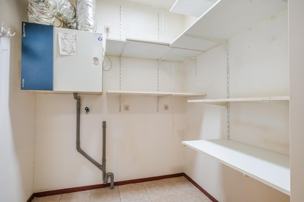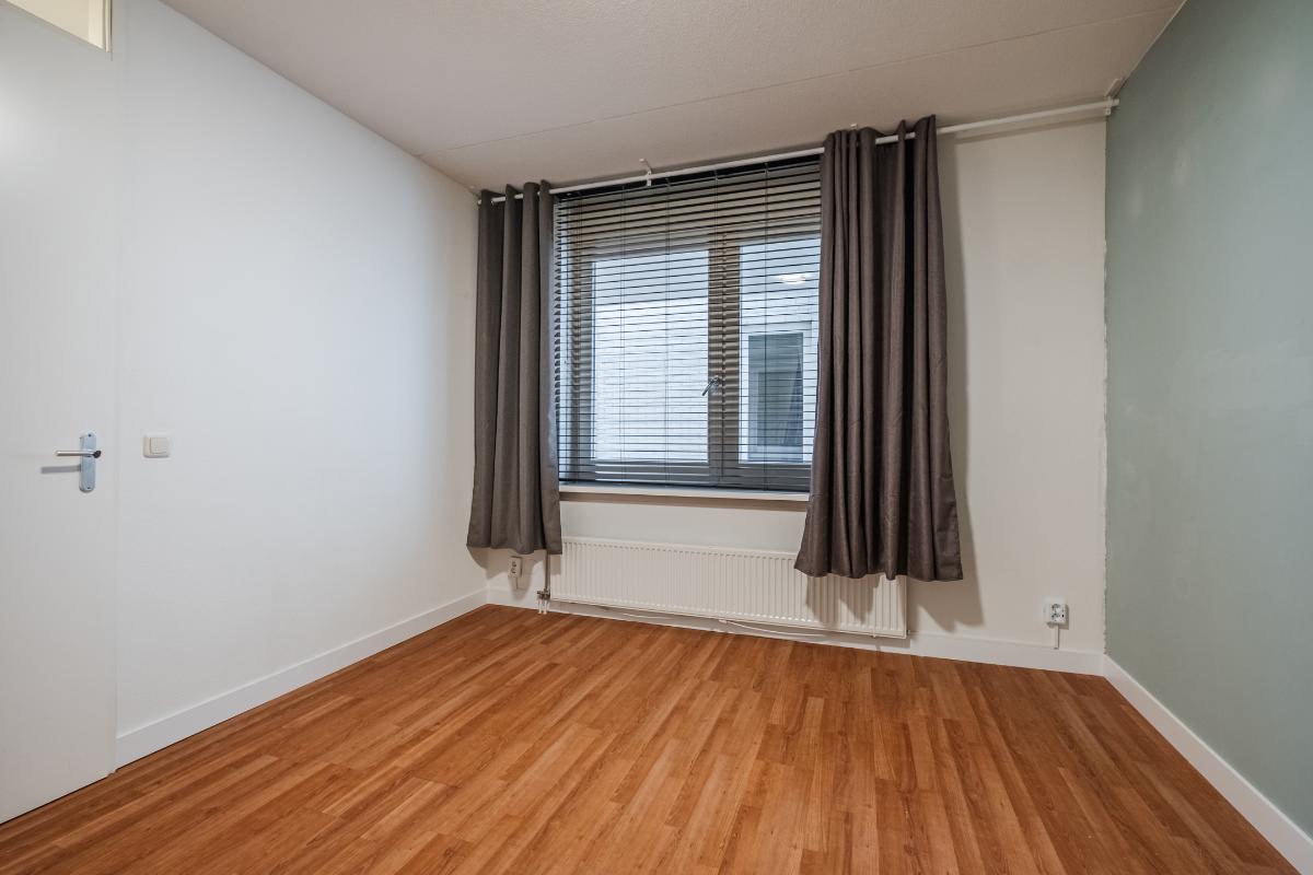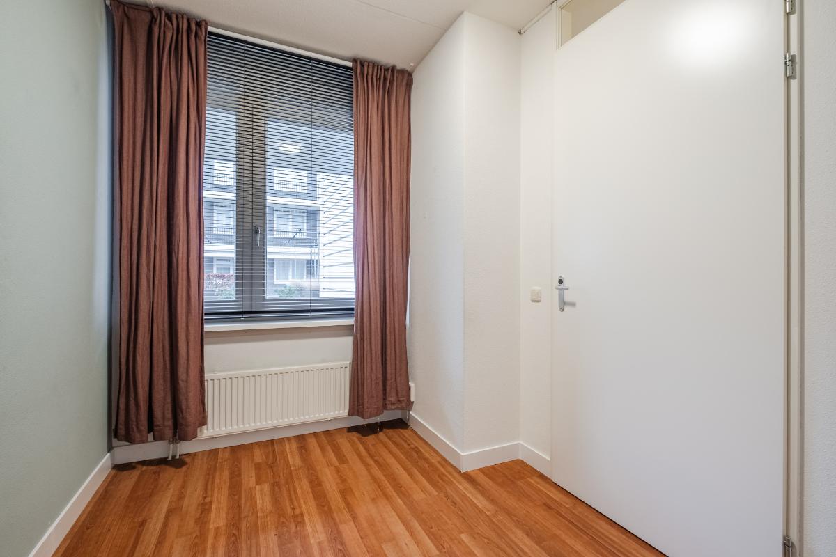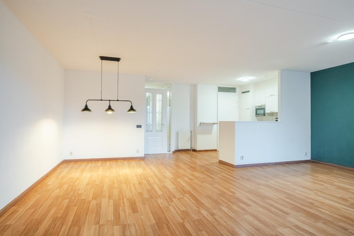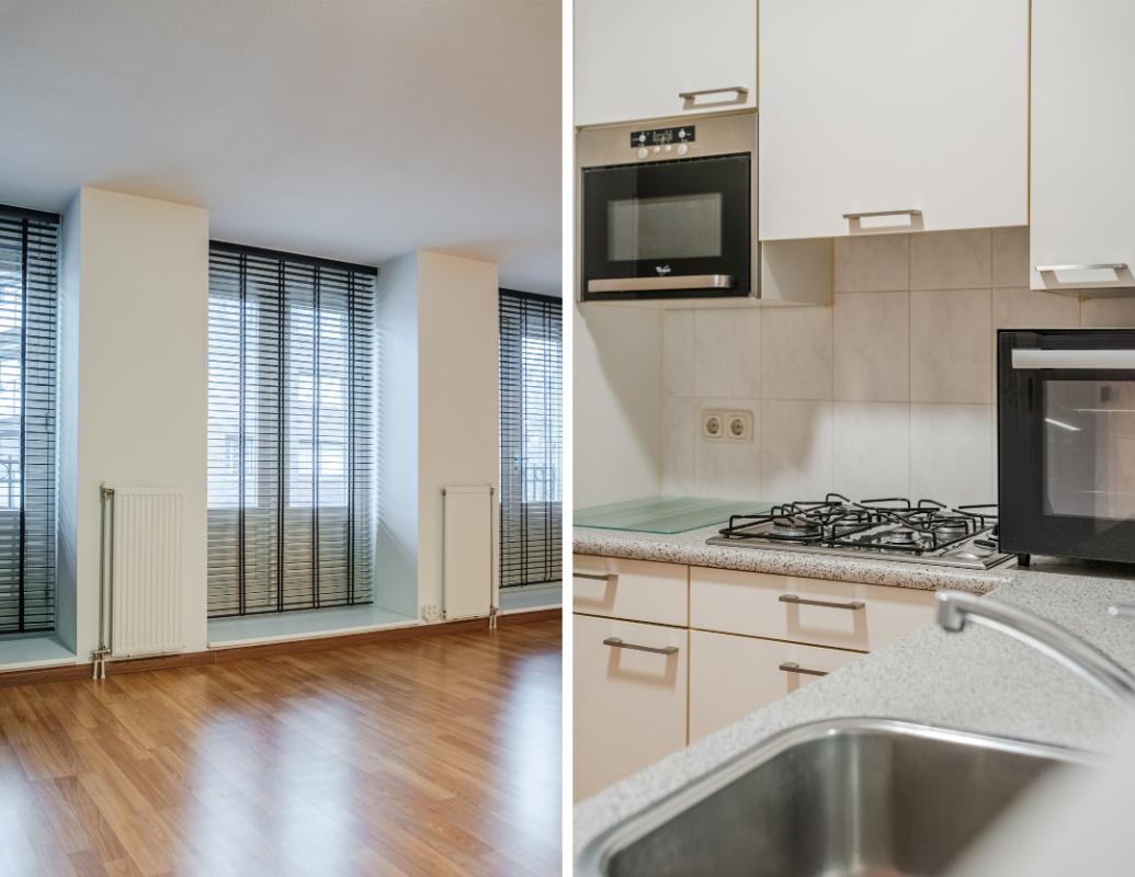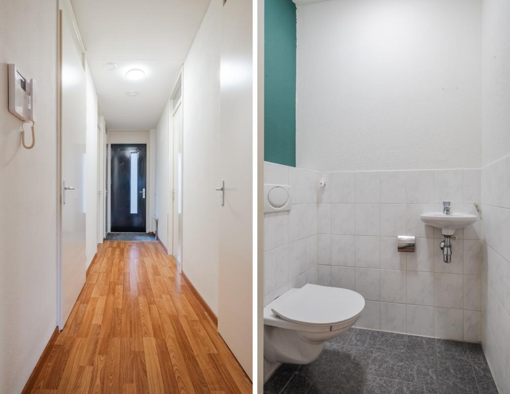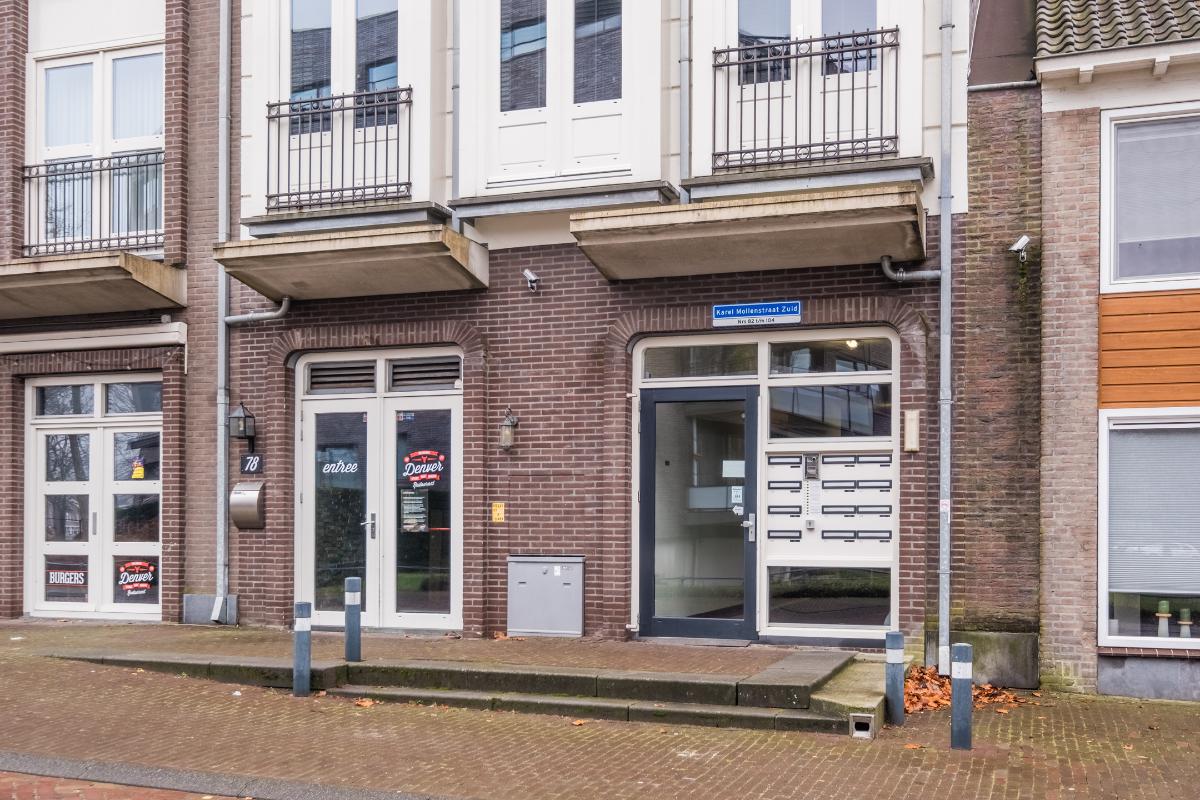Appartement (eerste verdieping): Binnenkomst in de hal die toegang geeft tot twee slaapkamers aan de rustige achterzijde met zicht op de mooi aangelegde binnentuin. Daarnaast een separate toiletruimte met wandcloset en fonteintje en een volledig licht betegelde badkamer met douche, wandcloset en wastafel in meubel. Voorts de royale woonkamer (plm. 45 m²) met open keuken, laminaatvloer (doorgelegd in het hele appartement) en veel natuurlijk licht door een drietal grote ramen aan de voorzijde. De semi-open keuken in hoekopstelling is voorzien van vaatwasser, 4-pits gaskookplaat, koelkast en afzuigkap. Aangrenzend bevindt zich de praktische berging met de aansluiting voor wasapparatuur en de opstelling c.v.-combiketel (Remeha 2019).