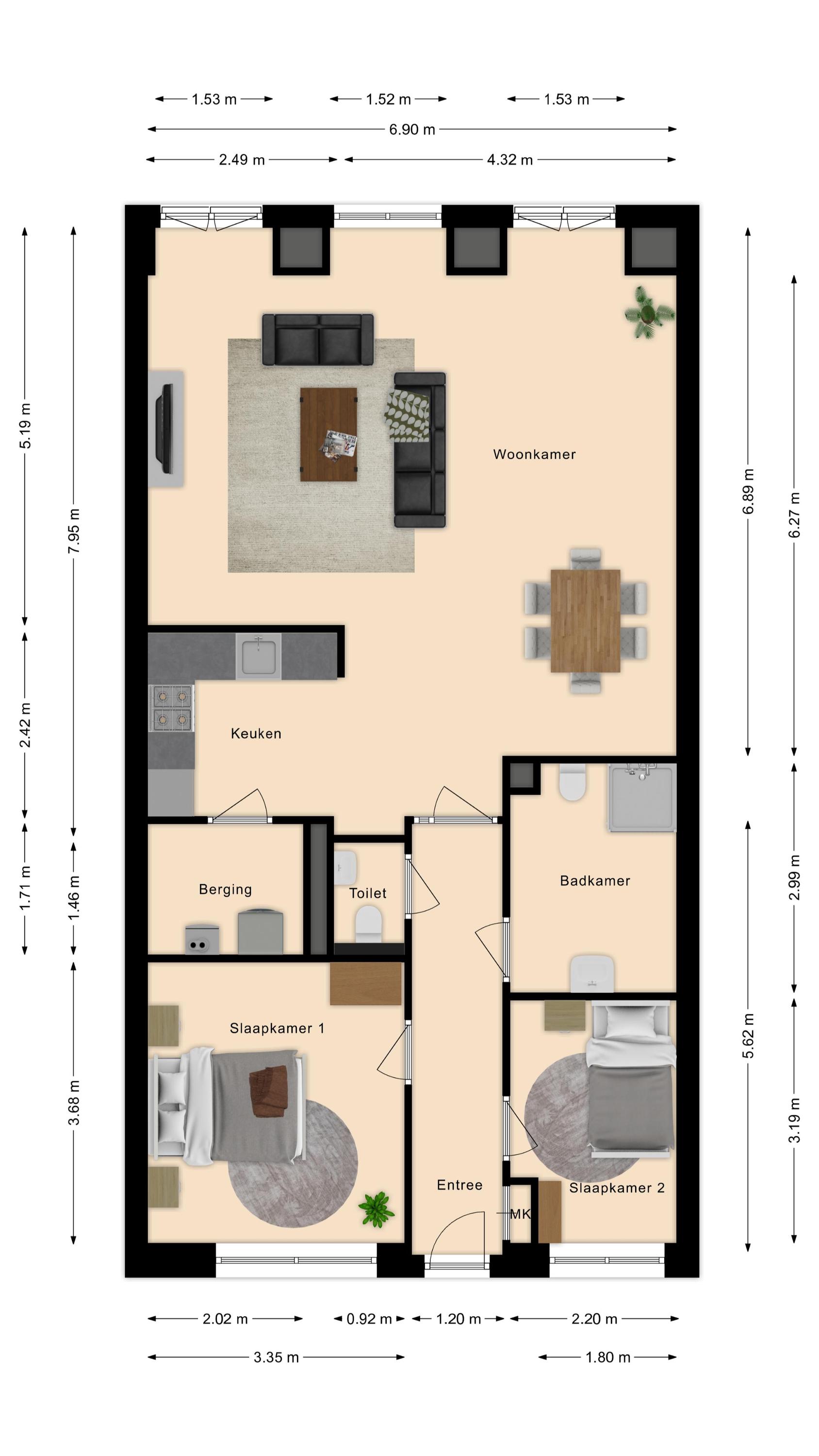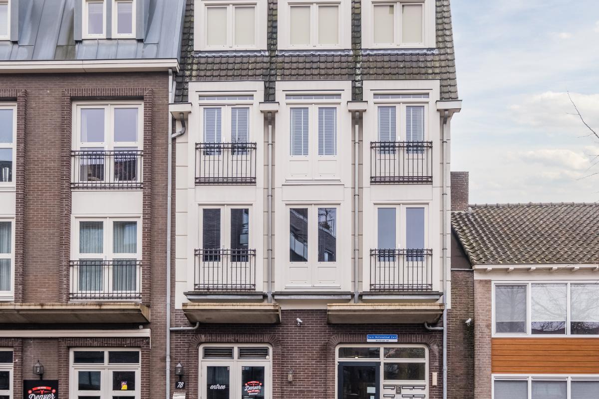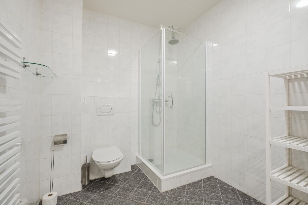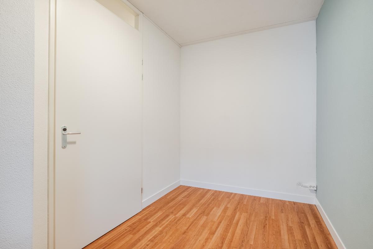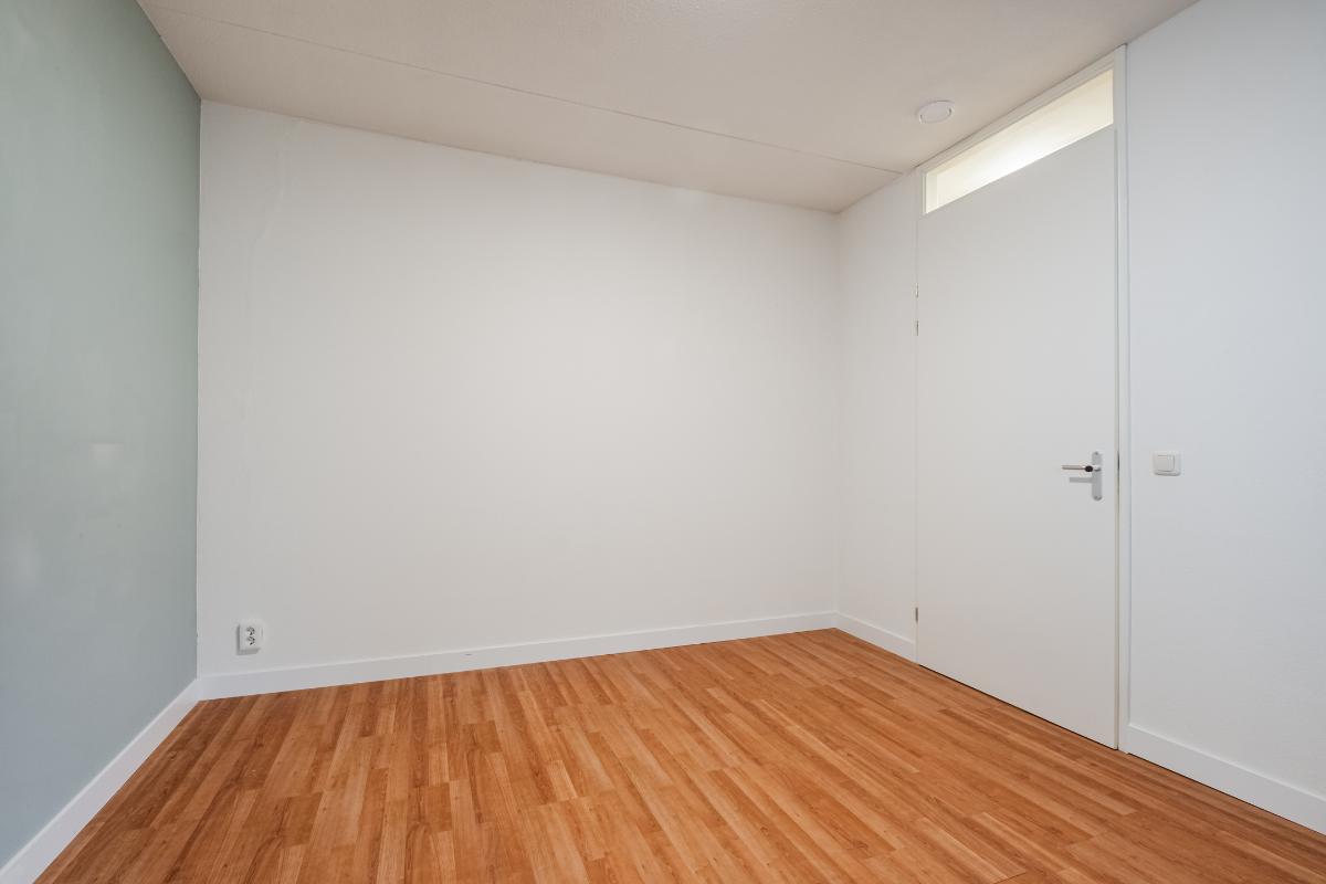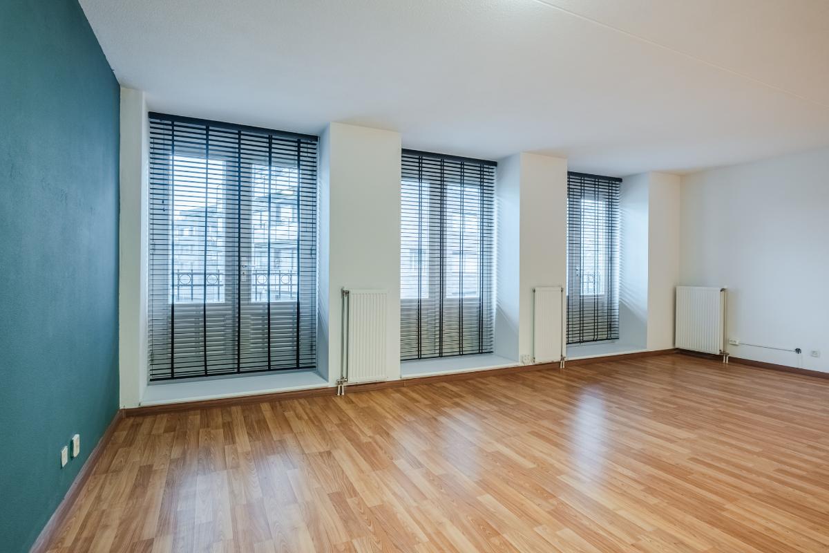 Appartement (eerste verdieping): Binnenkomst in de hal die toegang geeft tot twee slaapkamers aan de rustige achterzijde met zicht op de mooi aangelegde binnentuin. Daarnaast een separate toiletruimte met wandcloset en fonteintje en een volledig licht betegelde badkamer met douche, wandcloset en wastafel in meubel. Voorts de royale woonkamer (plm. 45 m²) met open keuken, laminaatvloer (doorgelegd in het hele appartement) en veel natuurlijk licht door een drietal grote ramen aan de voorzijde. De semi-open keuken in hoekopstelling is voorzien van vaatwasser, 4-pits gaskookplaat, koelkast en afzuigkap. Aangrenzend bevindt zich de praktische berging met de aansluiting voor wasapparatuur en de opstelling c.v.-combiketel (Remeha 2019).