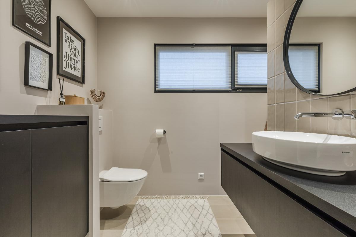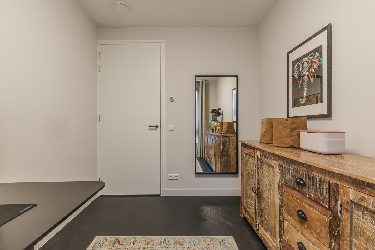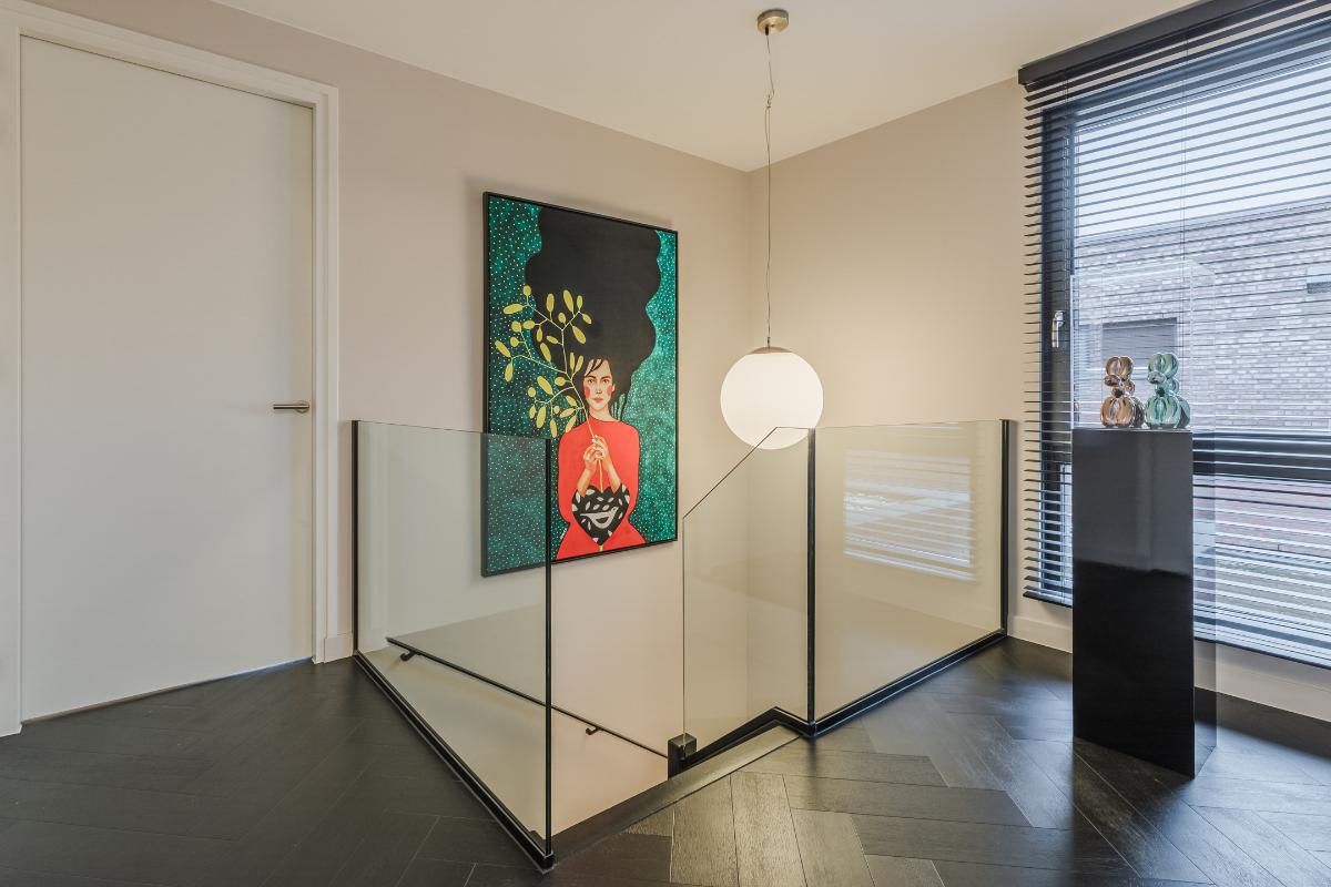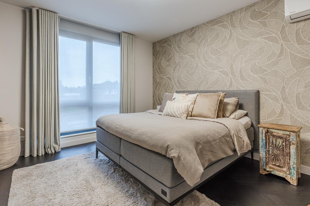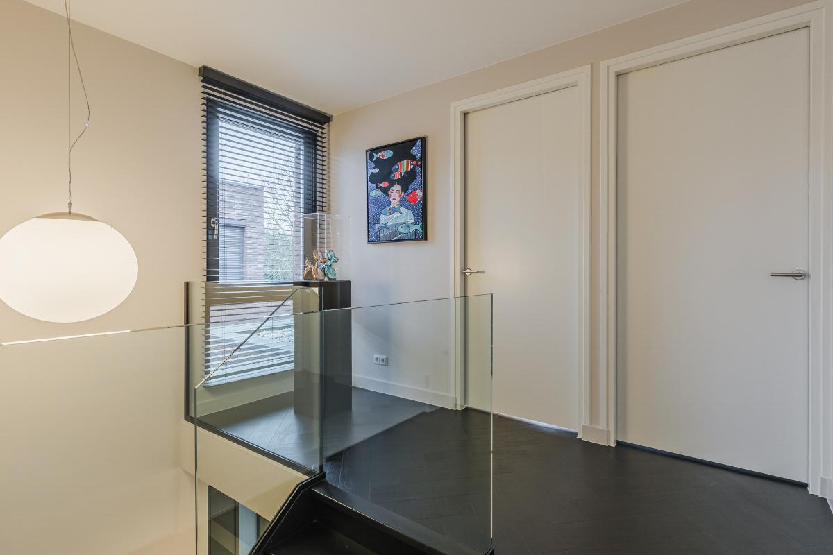 1e verdieping: Overloop met visgraat PVC vloer die ook op de slaapkamers is doorgelegd. Er zijn 3 ruime slaapkamers waarvan de master bedroom de ultieme hotelbeleving geeft. Deze slaapkamer heeft naast een airco ook een maatwerk inloopgarderobe. De luxe badkamer is ingericht met maatwerk kasten, een badmeubel met design waskom, een wandcloset en een royale inloopdouche.