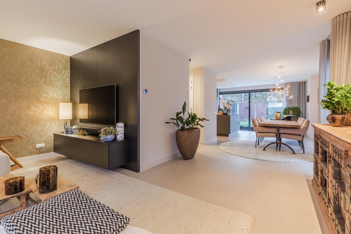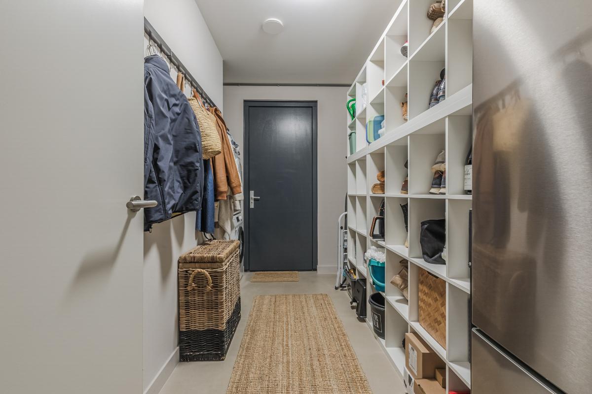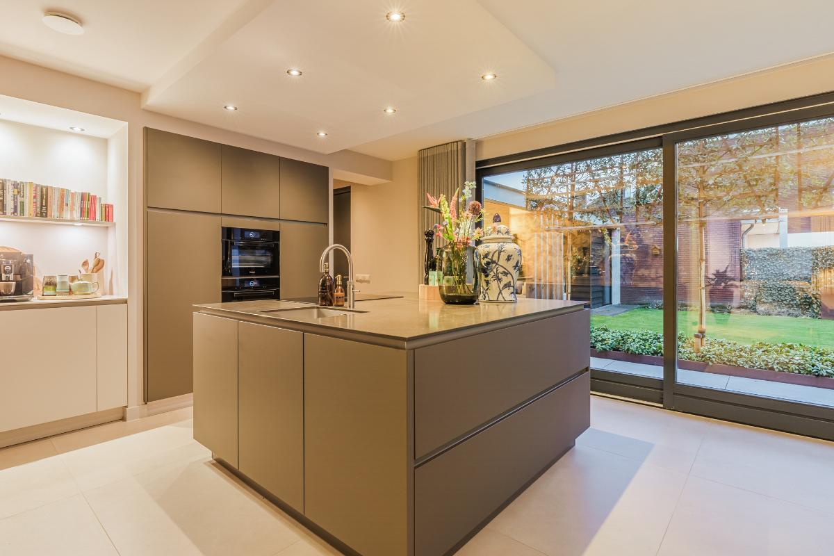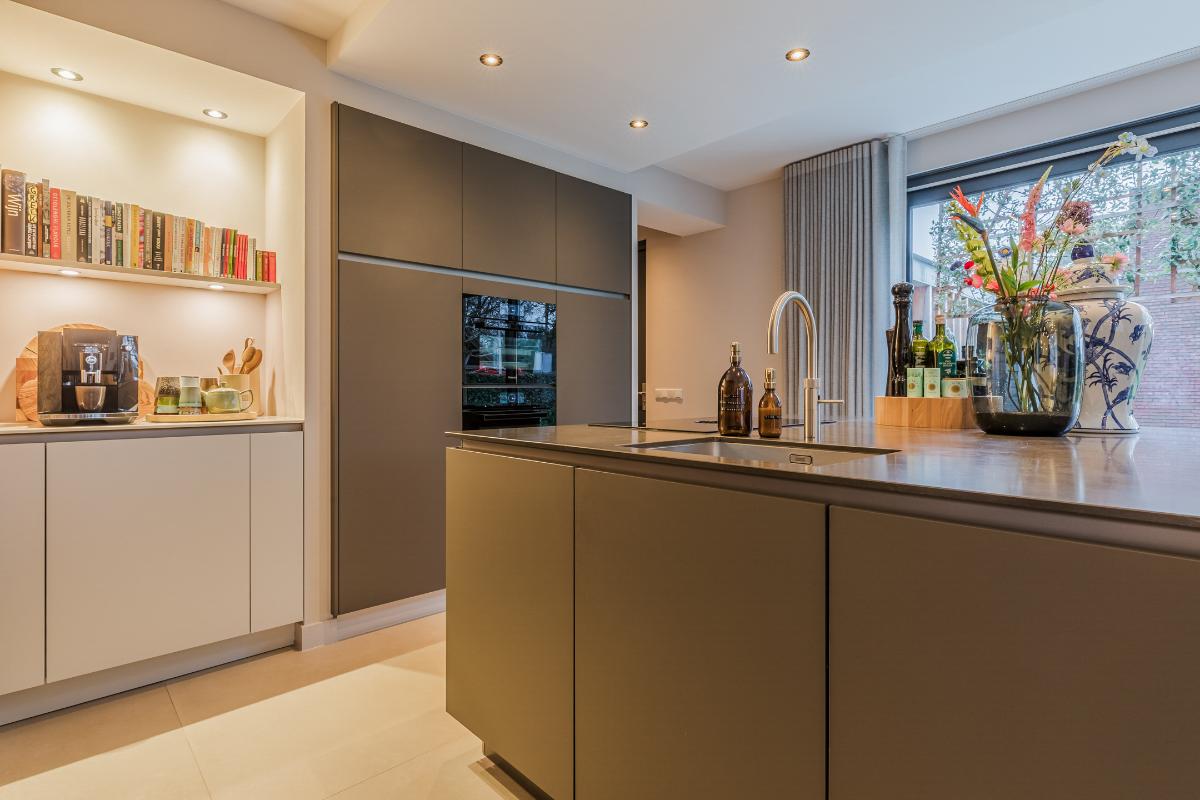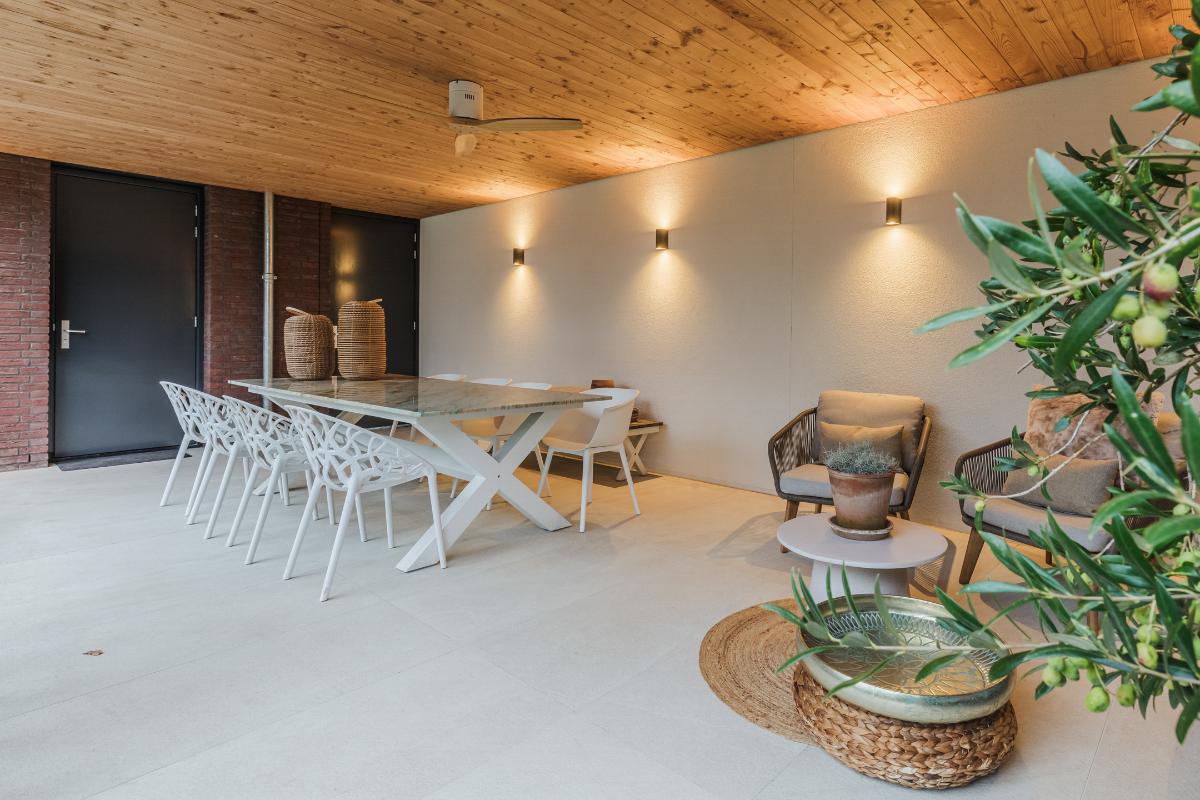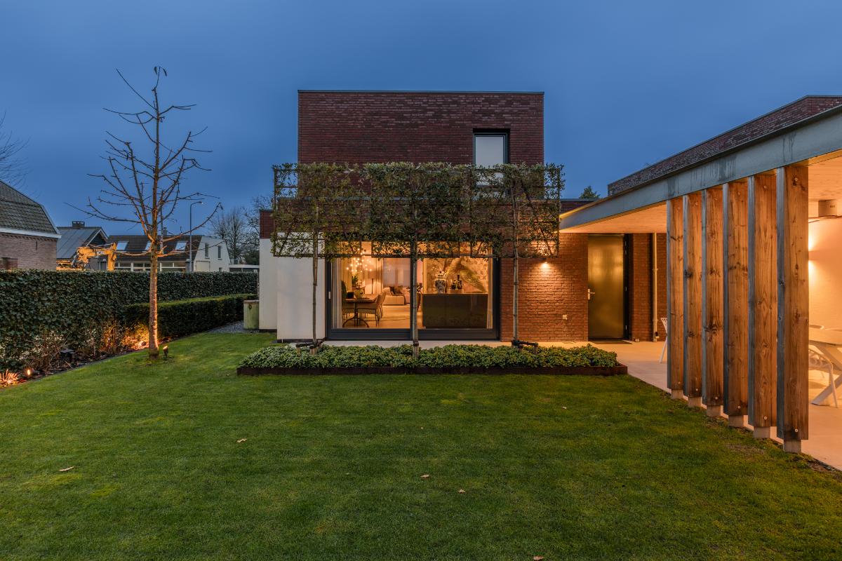Begane grond: Eigen oprit naar carport, vrije achterom, berging en entree. Ontvangsthal met trap, meterkast, modern uitgevoerd toilet en glazen taatsdeur naar de living. Sfeervolle living met 1.20 x 1.20m tegelvloer (gehele begane grond doorgelegd) en dankzij de ramen tot aan de grond, de erker en de schuifpui is er veel daglicht inval en dus ook een aangename sfeer. De luxe leefkeuken is aan de achterzijde gelegen en is voorzien van een warme-, maatwerk inrichting die bestaat uit een kastenwand met koffiecorner en een groot- en praktisch-, vierkant kookeiland. De apparatuur bestaat uit een inductiekookplaat met geïntegreerde afzuiging, vaatwasser, oven, stoomoven, koelkast, Quooker en zelfs een wijnklimaatkast. Achter de keuken is een portaal met toegang tot de tuin en toegang tot de inpandig berging.