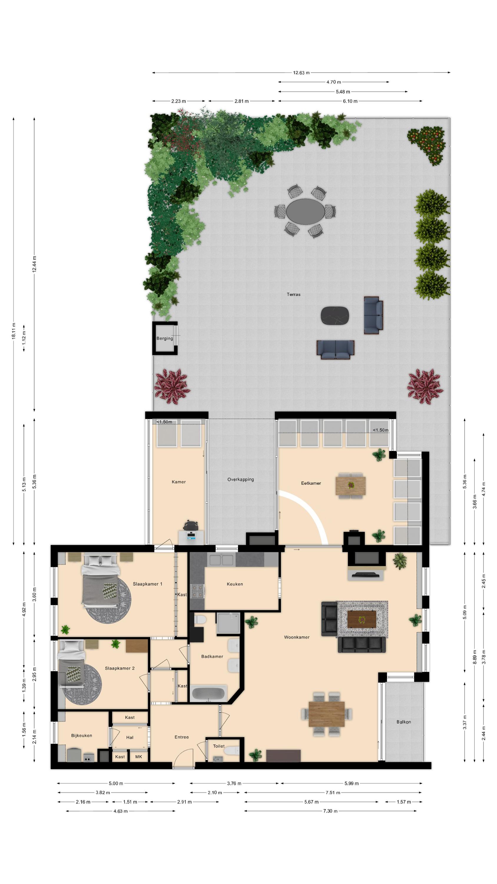 Vanuit hal toegang tot twee slaapkamers, de badkamer en een derde hobby/werkkamer. De badkamer is uitgerust met een ligbad, dubbele wastafel, inloopdouche en tweede toilet. Eveneens is er vanuit de hal een praktische bijkeuken annex berging bereikbaar.
