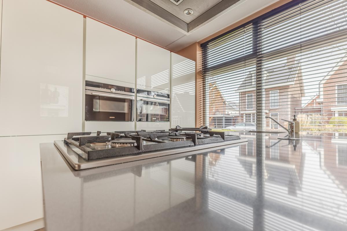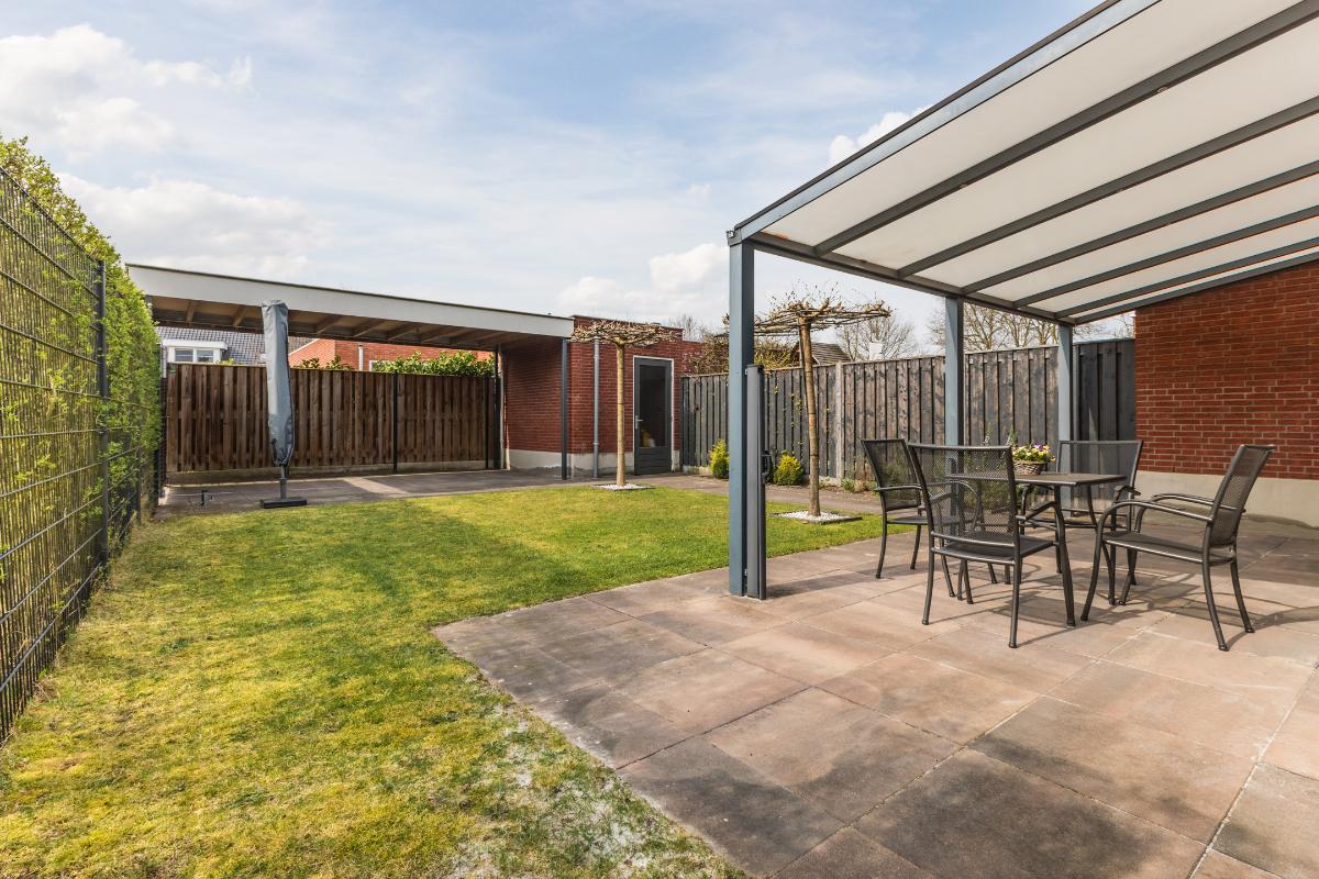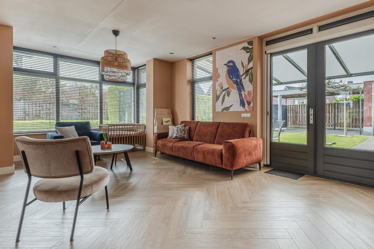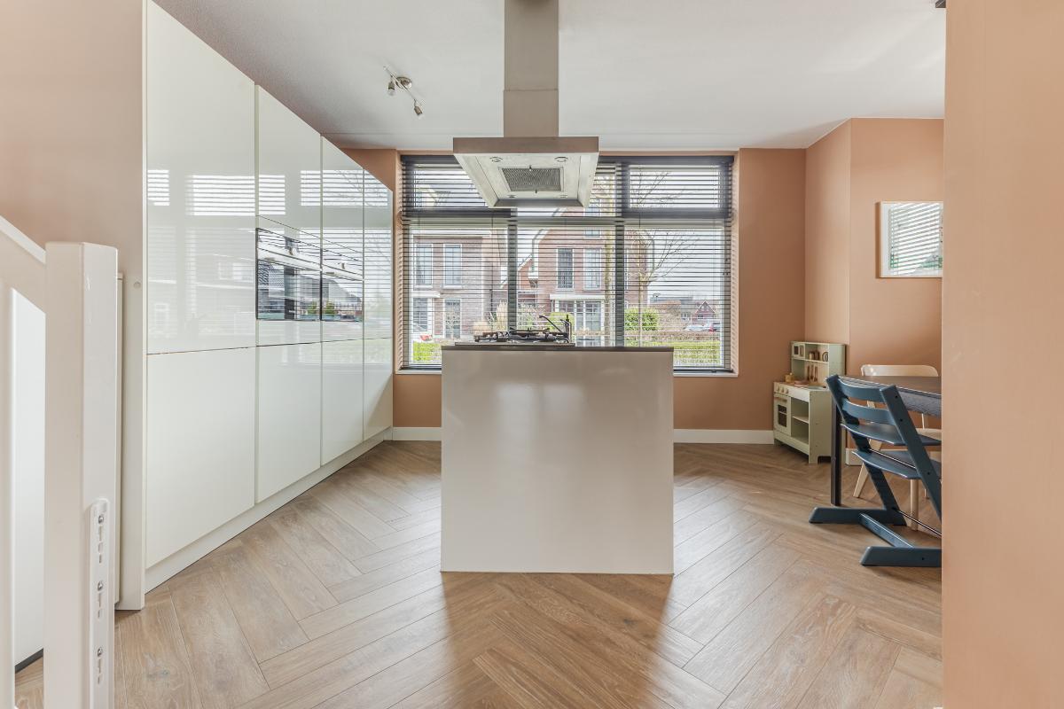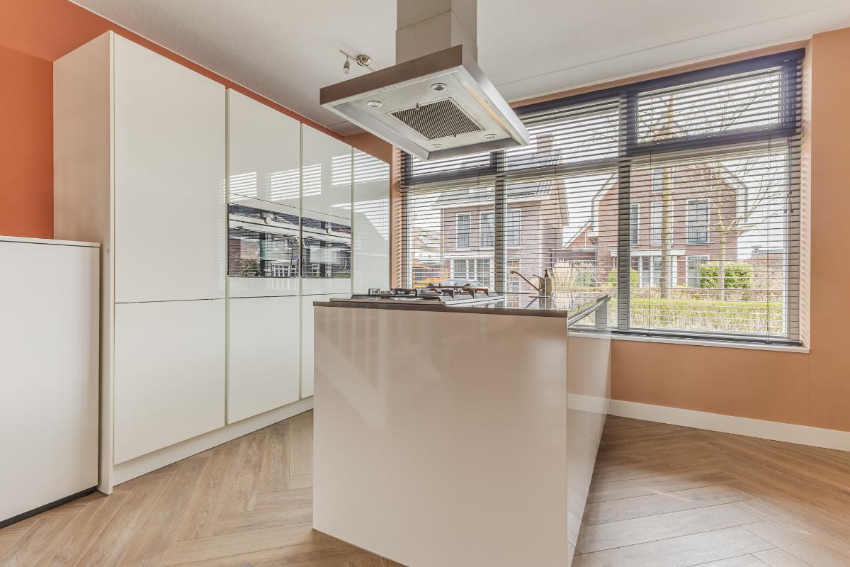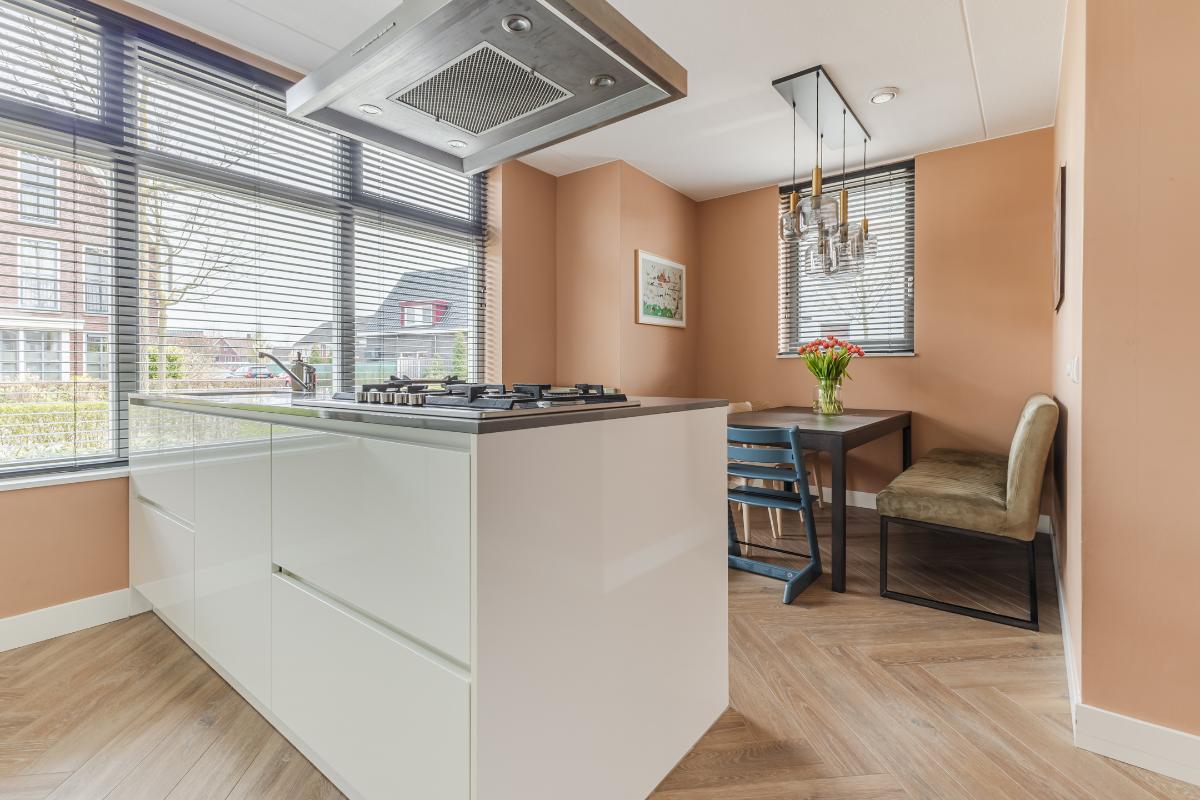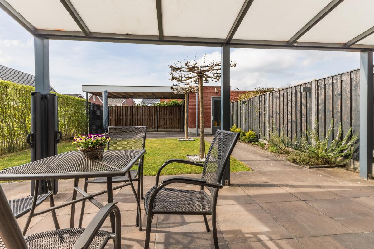 Begane grond: Overdekte entree naar de ontvangsthal met meterkast, garderobe en modern toilet met wandcloset en fontein. Toegang tot de living met aan de rechterzijde de woonkeuken en aan de linkerzijde de zitkamer. De woonkeuken heeft een strakke en moderne uitstraling met een kastenwand en uiteraard een kookeiland. Ook is er voldoende ruimte voor de eettafel. De apparatuur bestaat uit een gaskookplaat, afzuigkap, oven, combi-oven/magnetron, koelkast, vriezer en een vaatwasser. Op de gehele begane grond ligt een fraaie visgraat tegelvloer met vloerverwarming als hoofdverwarming. Het ruime zitgedeelte aan de achterzijde geniet veel lichtinval door de erker aan de zijkant en de openslaande tuindeuren aan de achterkant. Door de tuindeuren kom je in de tuin direct onder een fijne overkapping. Door de hoekligging geniet de tuin veel privacy en aan de achterzijde heb je een stenen berging en praktische afsluitbare carport. Verder is de tuin verzorgd aangelegd met gazon, sierbestrating, een nette erfafscheiding en diverse vaste beplanting.