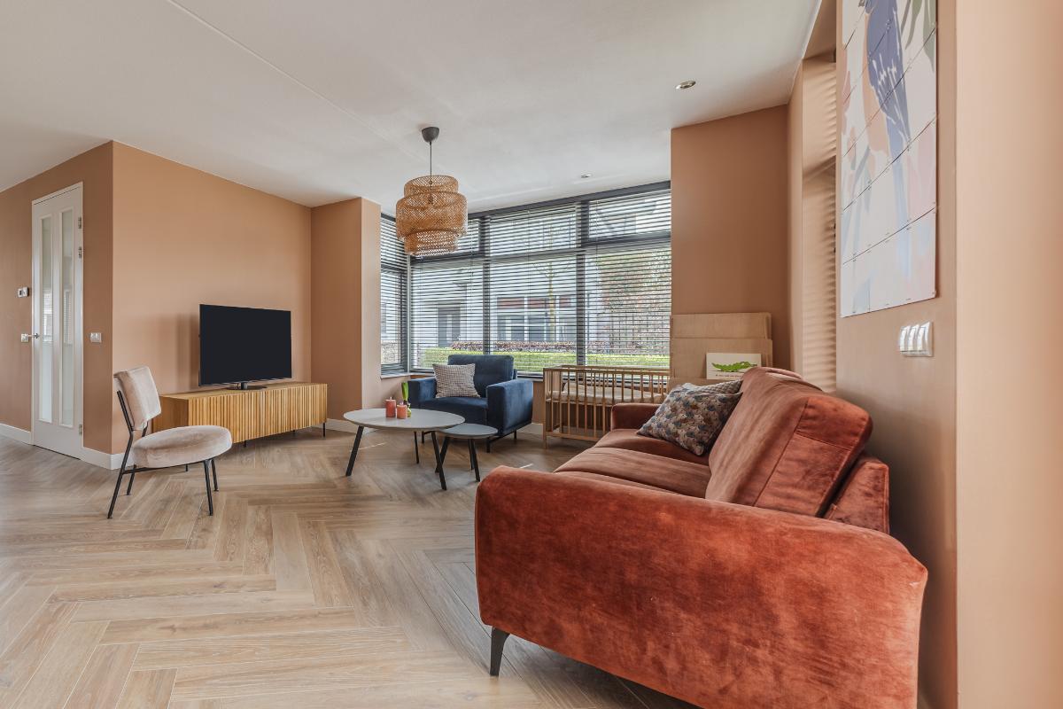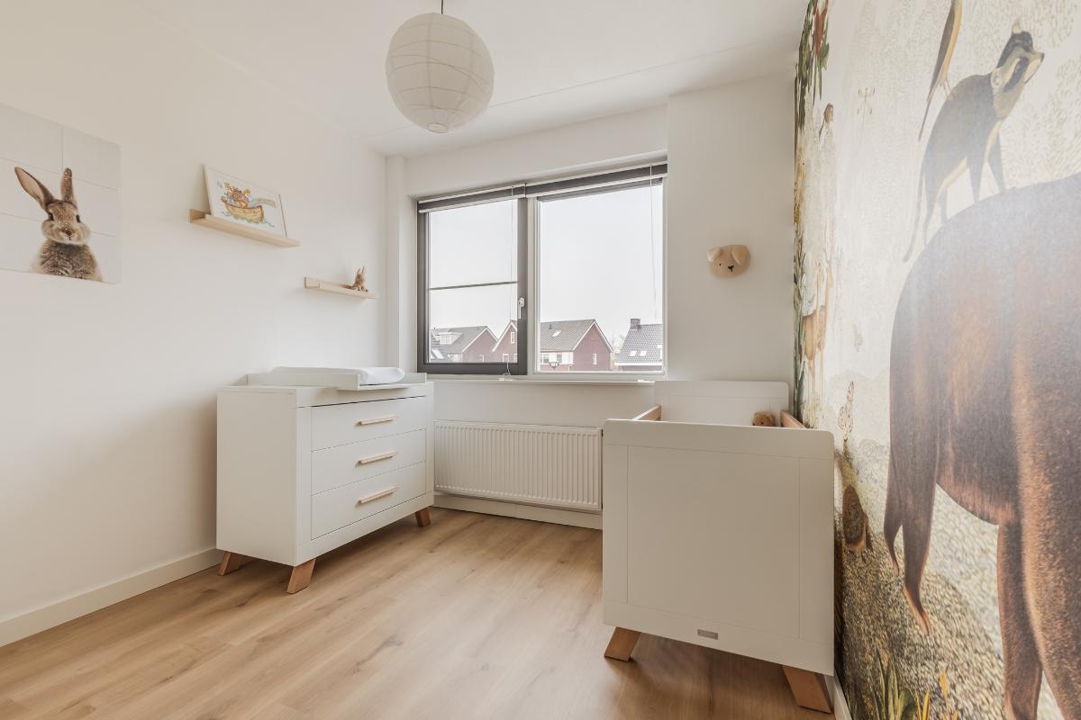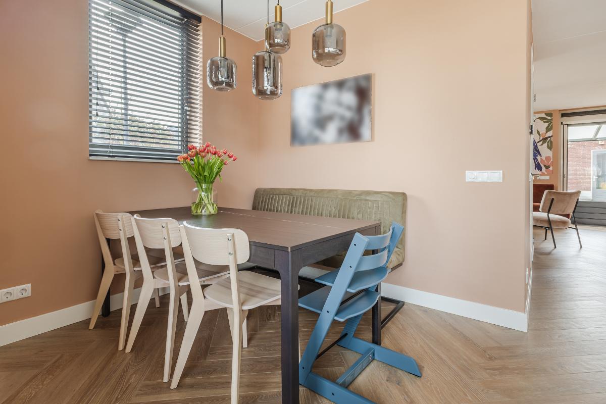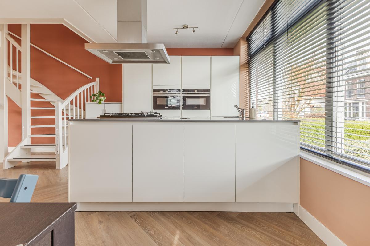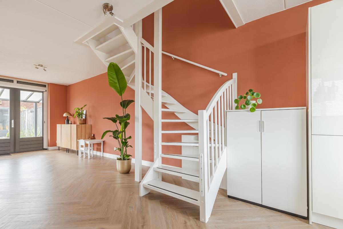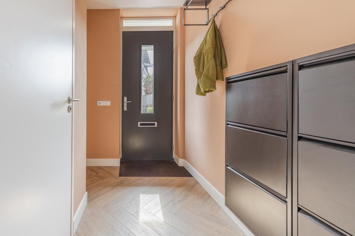 Begane grond: Overdekte entree naar de ontvangsthal met meterkast, garderobe en modern toilet met wandcloset en fontein. Toegang tot de living met aan de rechterzijde de woonkeuken en aan de linkerzijde de zitkamer. De woonkeuken heeft een strakke en moderne uitstraling met een kastenwand en uiteraard een kookeiland. Ook is er voldoende ruimte voor de eettafel. De apparatuur bestaat uit een gaskookplaat, afzuigkap, oven, combi-oven/magnetron, koelkast, vriezer en een vaatwasser. Op de gehele begane grond ligt een fraaie visgraat tegelvloer met vloerverwarming als hoofdverwarming. Het ruime zitgedeelte aan de achterzijde geniet veel lichtinval door de erker aan de zijkant en de openslaande tuindeuren aan de achterkant. Door de tuindeuren kom je in de tuin direct onder een fijne overkapping. Door de hoekligging geniet de tuin veel privacy en aan de achterzijde heb je een stenen berging en praktische afsluitbare carport. Verder is de tuin verzorgd aangelegd met gazon, sierbestrating, een nette erfafscheiding en diverse vaste beplanting.