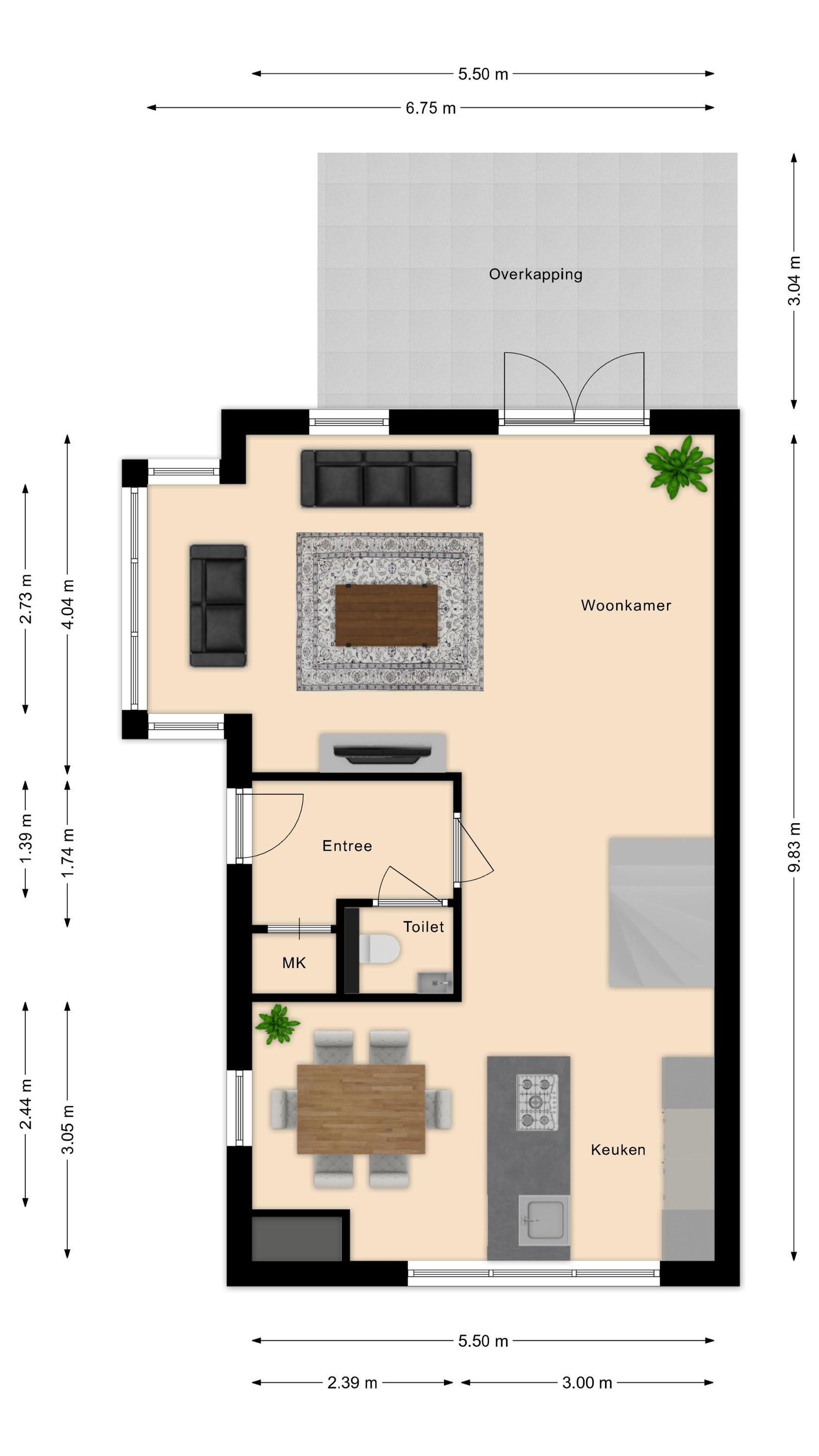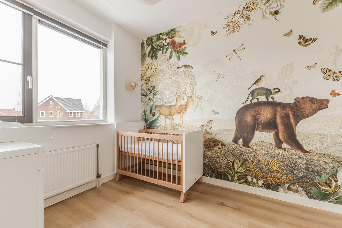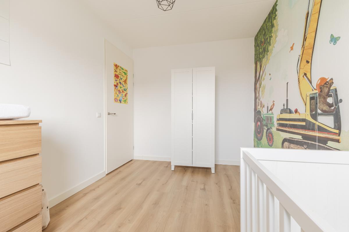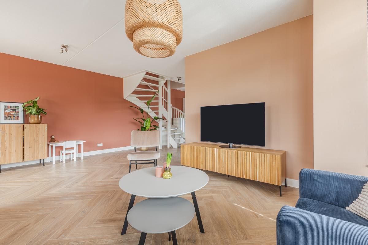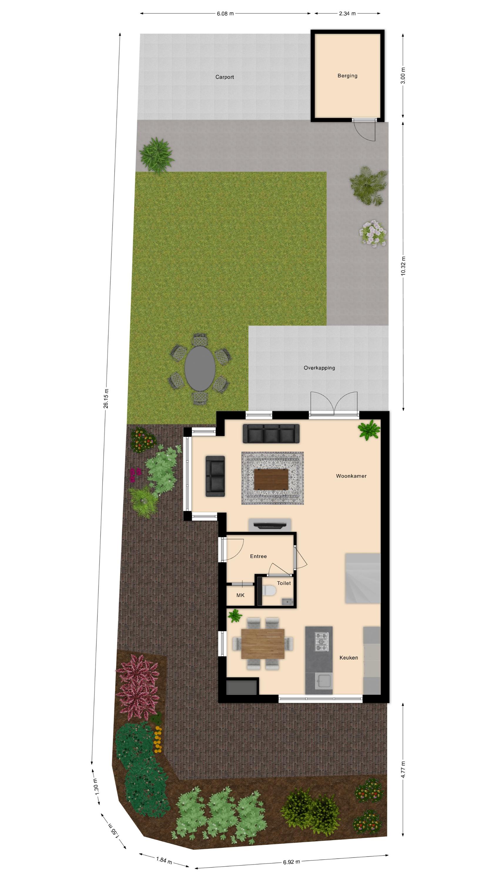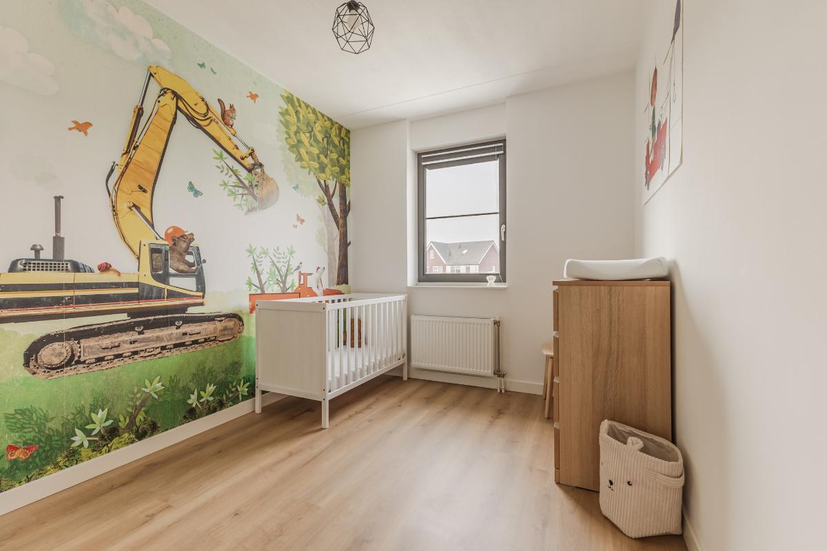 Begane grond: Overdekte entree naar de ontvangsthal met meterkast, garderobe en modern toilet met wandcloset en fontein. Toegang tot de living met aan de rechterzijde de woonkeuken en aan de linkerzijde de zitkamer. De woonkeuken heeft een strakke en moderne uitstraling met een kastenwand en uiteraard een kookeiland. Ook is er voldoende ruimte voor de eettafel. De apparatuur bestaat uit een gaskookplaat, afzuigkap, oven, combi-oven/magnetron, koelkast, vriezer en een vaatwasser. Op de gehele begane grond ligt een fraaie visgraat tegelvloer met vloerverwarming als hoofdverwarming. Het ruime zitgedeelte aan de achterzijde geniet veel lichtinval door de erker aan de zijkant en de openslaande tuindeuren aan de achterkant. Door de tuindeuren kom je in de tuin direct onder een fijne overkapping. Door de hoekligging geniet de tuin veel privacy en aan de achterzijde heb je een stenen berging en praktische afsluitbare carport. Verder is de tuin verzorgd aangelegd met gazon, sierbestrating, een nette erfafscheiding en diverse vaste beplanting.