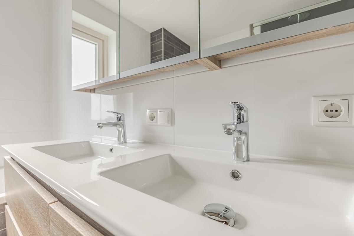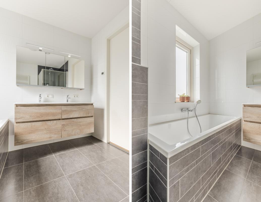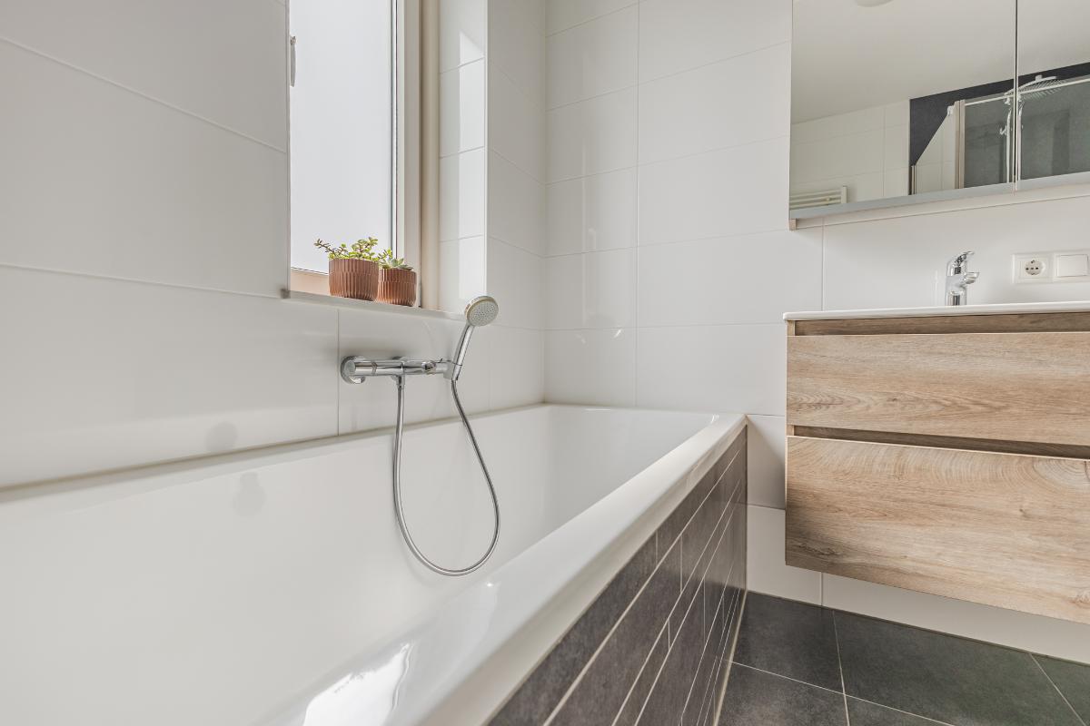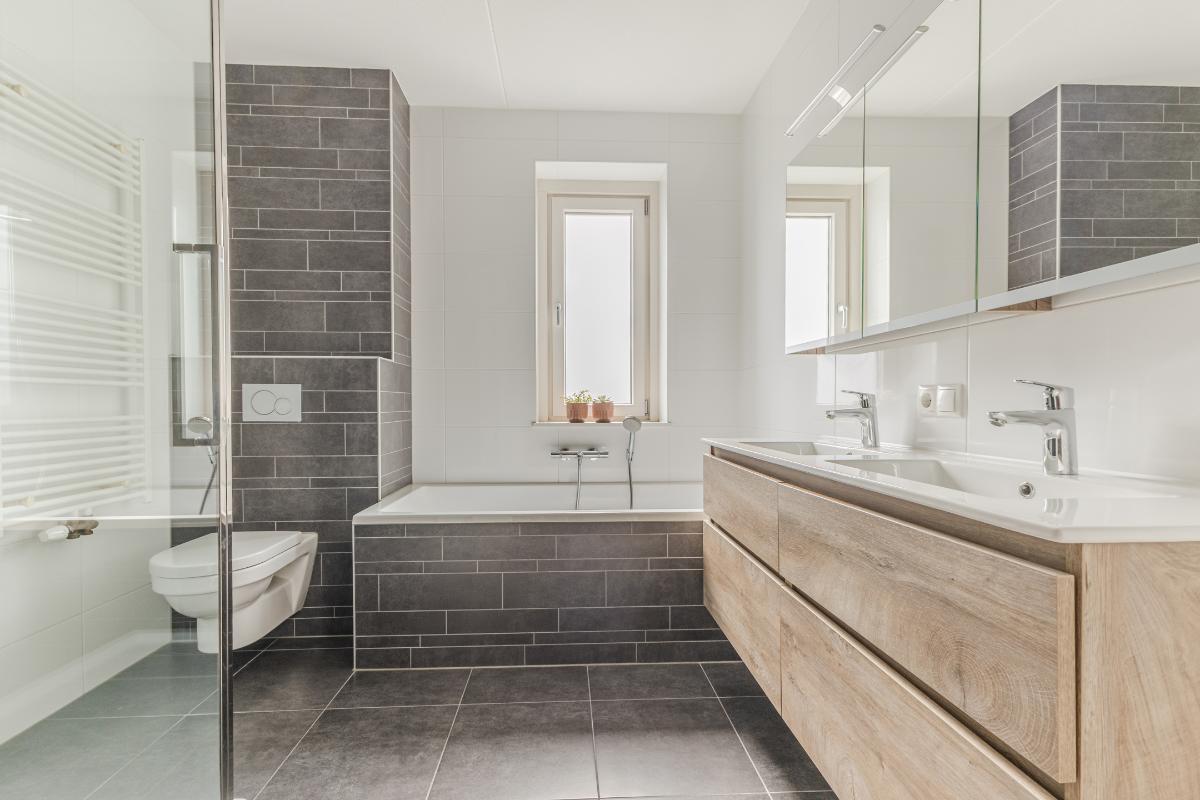 1e verdieping: Overloop naar 3 slaapkamers en de badkamer. De badkamer heeft een moderne uitstraling en een complete inrichting met ligbad, badmeubel met dubbele wastafel, een wandcloset en een inloopdouche met rainshower.